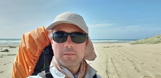 I set off at 8am just after high tide. This meant I was walking in soft sand for an hour or so which is hard work and had to run up the bank a few times to avoid rogue waves. I learnt today that pufferfish are not good swimmers. I passed at least 50 washed up. I fought off some pesky Gannets who did not like me for some reason. They were swooping down on me and I had to swing my walking poles at them. I would have enjoyed connecting with one. Very annoying.