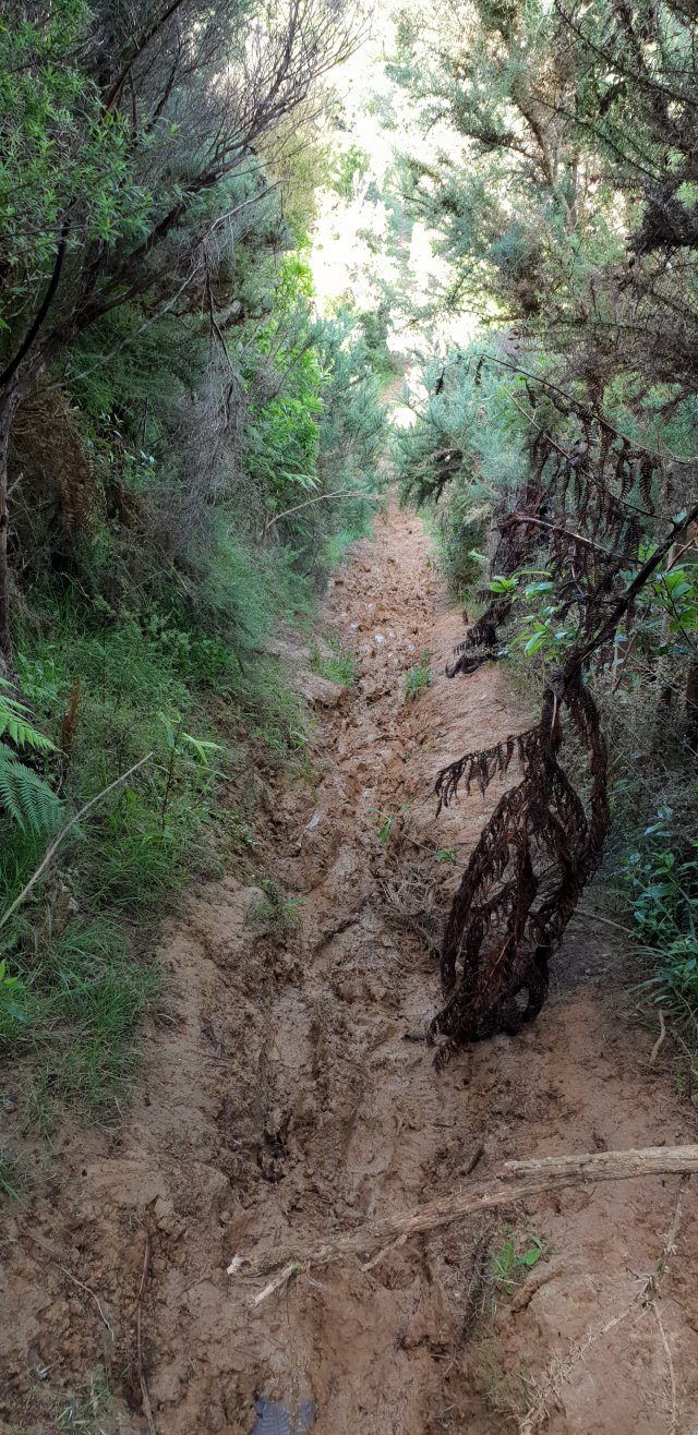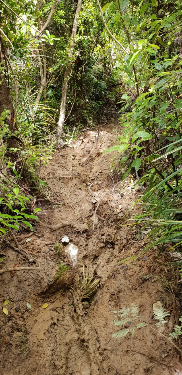 Today was a hard day. It started with a steep climb up into Omaha forest with a 445m summit. I set off at 7am. The tracks were narrow and muddy. Not as bad as Raetea, but pretty bad. It really slows you down and makes the descent’s tricky and dangerous. One of the summits had a weather station which was interesting to look at. Not many good view points as the trees were in the way.