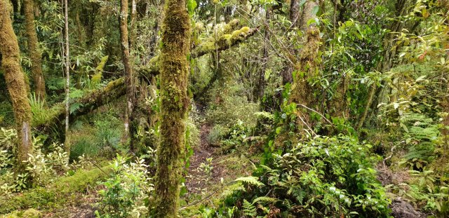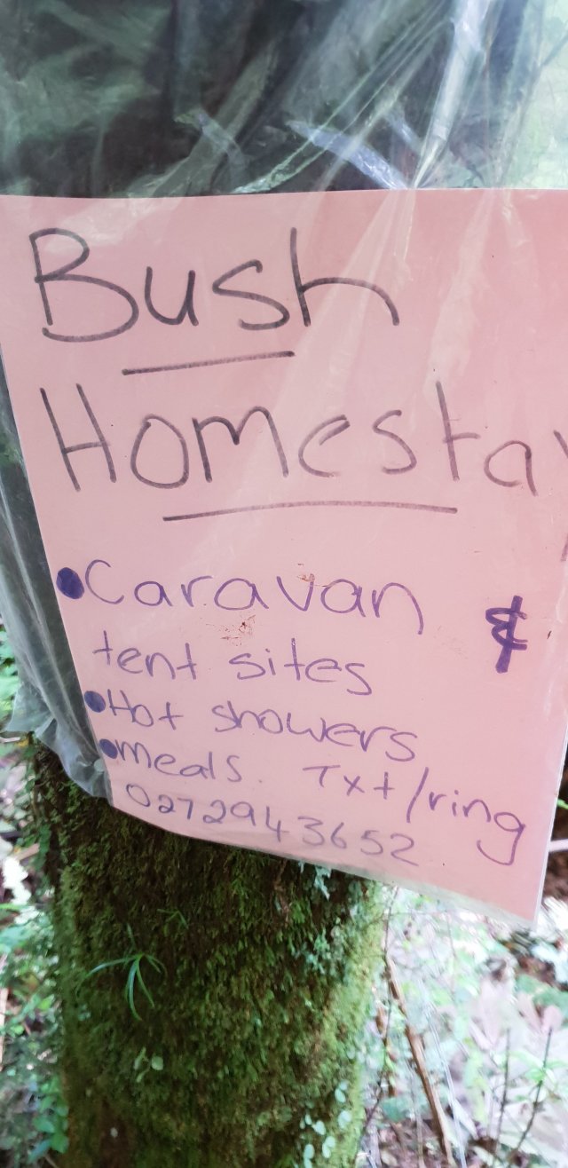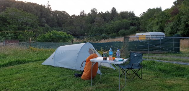 The hut was another 45 minutes further along. We had planned to stay there overnight and were settling in by 1pm. After about an hour I asked dad and Scott if they would like to carry on rather than stay there. I was feeling keen to make up some kms and figured I could make up a whole day if I pushed on and put another big effort in the next day. We all agreed to continue. Dad called Shirley to arrange a pick up at the other end. It was slower going down the south side than it was going up. There was a lot of mud and we had to take our time on the steep bits. There was a surprising amount of uphill climbing on the way down and I had to keep checking my GPS to convince myself I was on the right track. By 6pm we were out and I walked a few extra kms down the road to an intersection. When exiting the track I noticed a sign on a tree for homestay accommodation nearby so I called and arranged to pitch my tent there. That way I would not need to travel back to Raglan and then have Scott drop me off again in the morning. I arrived there at 7pm and met my hosts Lynn and Scott. Lynn brought me a homemade Kombucha and some nut slice while I started setting up my tent. I was then able to have a hot shower and cook some dinner as the sun went down. It was a great way to finish the day, sitting in the paddock in a camping chair with a small table for my cooking and taking a moment to just chill and appreciate where I am and what I am doing.