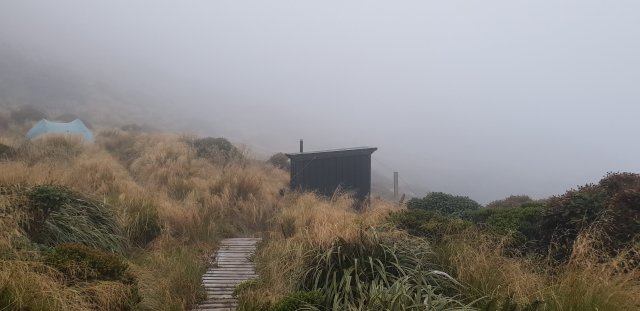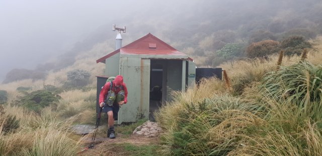 I woke up to the sound of wind whistling around the hut. The door was also knocking in the wind. Not a good sign considering we were climbing to the summit of Mt Crawford early in the morning along a long, narrow and very exposed ridgeline. I had set my alarm for 6am so Jesse and I could make an early start at it. The wind was forecast to get gradually stronger throughout the day. When we got up it was cold and blowing and we were in the clouds. I had a quick breakfast of trail mix and got out of my warm thermals that I wear to bed most nights. I layered up with a windproof jacket and neck gaiter but that’s all as I knew I was going to get warm very quickly.