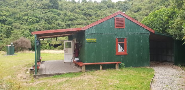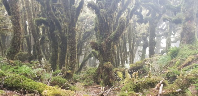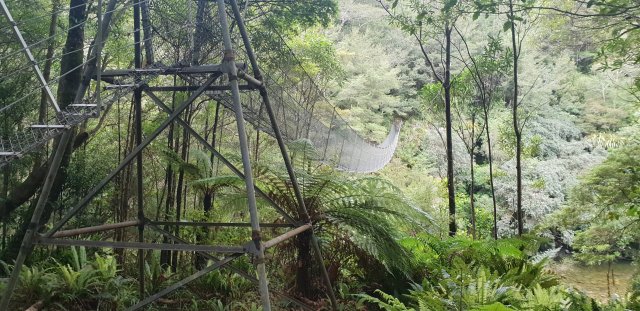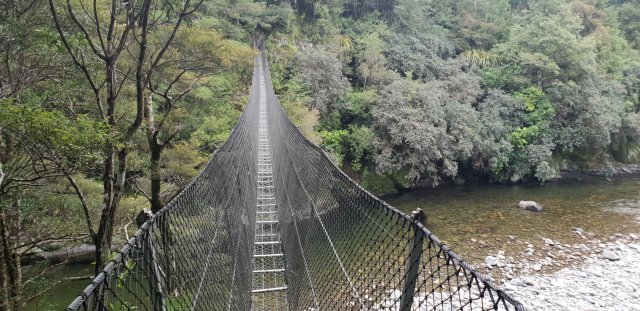 Then we had to come down. We dropped 1000m in elevation over 4kms. In other words, we were looking down through our feet for over two hours. We descended for some time before coming back into the treeline and back into the ancient mossy forest. It looked even more magical in the clouds than yesterday. Then we were below the clouds. As we got further down, the forest changed and we could hear birds again. At the bottom we crossed a river over a wire foot bridge. Not as strong as the ones on the Timber Trail so much more wobbly. We stopped at the Waitewaiwai hut for lunch and then carried on for the second half of the day out of the ranges to Otaki Forks. It was a tough trail starting with another big climb up 500m of elevation. There were heaps of fallen trees over the track. Some you had to climb over, through, under or right around. There were stream crossings and lots more mud. Jesse and I are both feeling tired after so many big days but really enjoying it too. We talk a lot about what food we plan to eat when get out and if there will be a bar or cafe. We arrived at the Parawai lodge doc hut just before five so it was another 10 hour day.