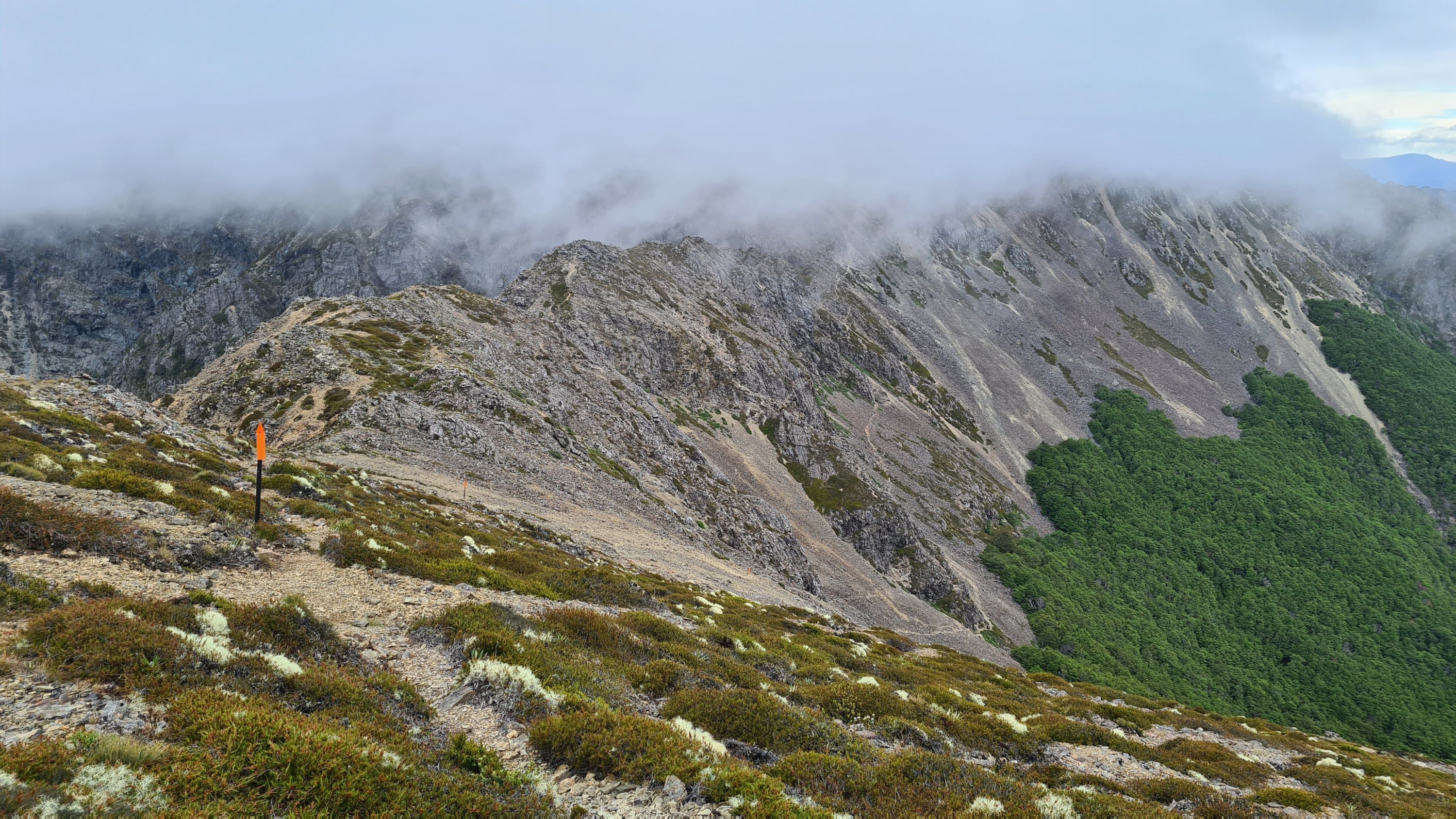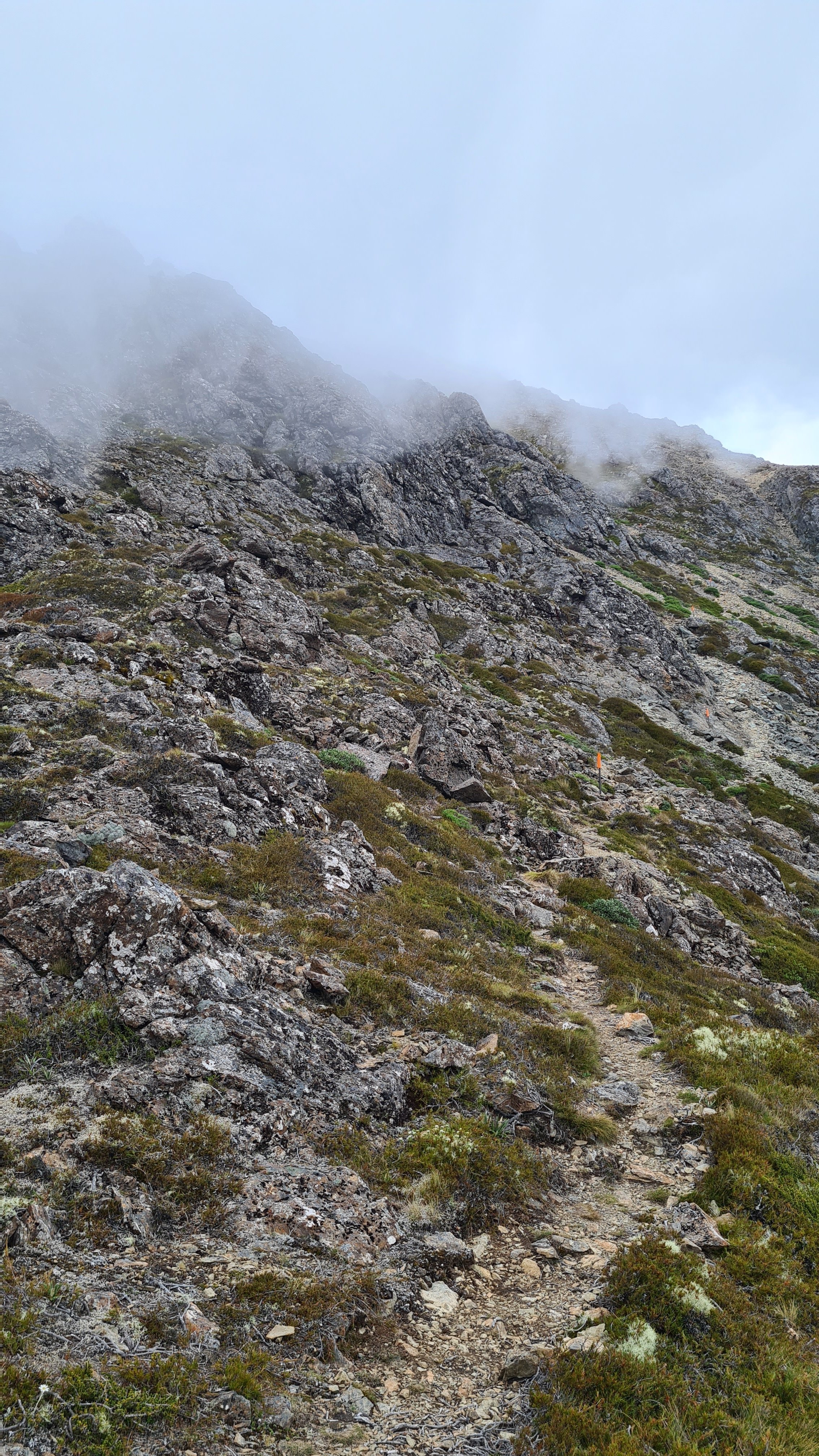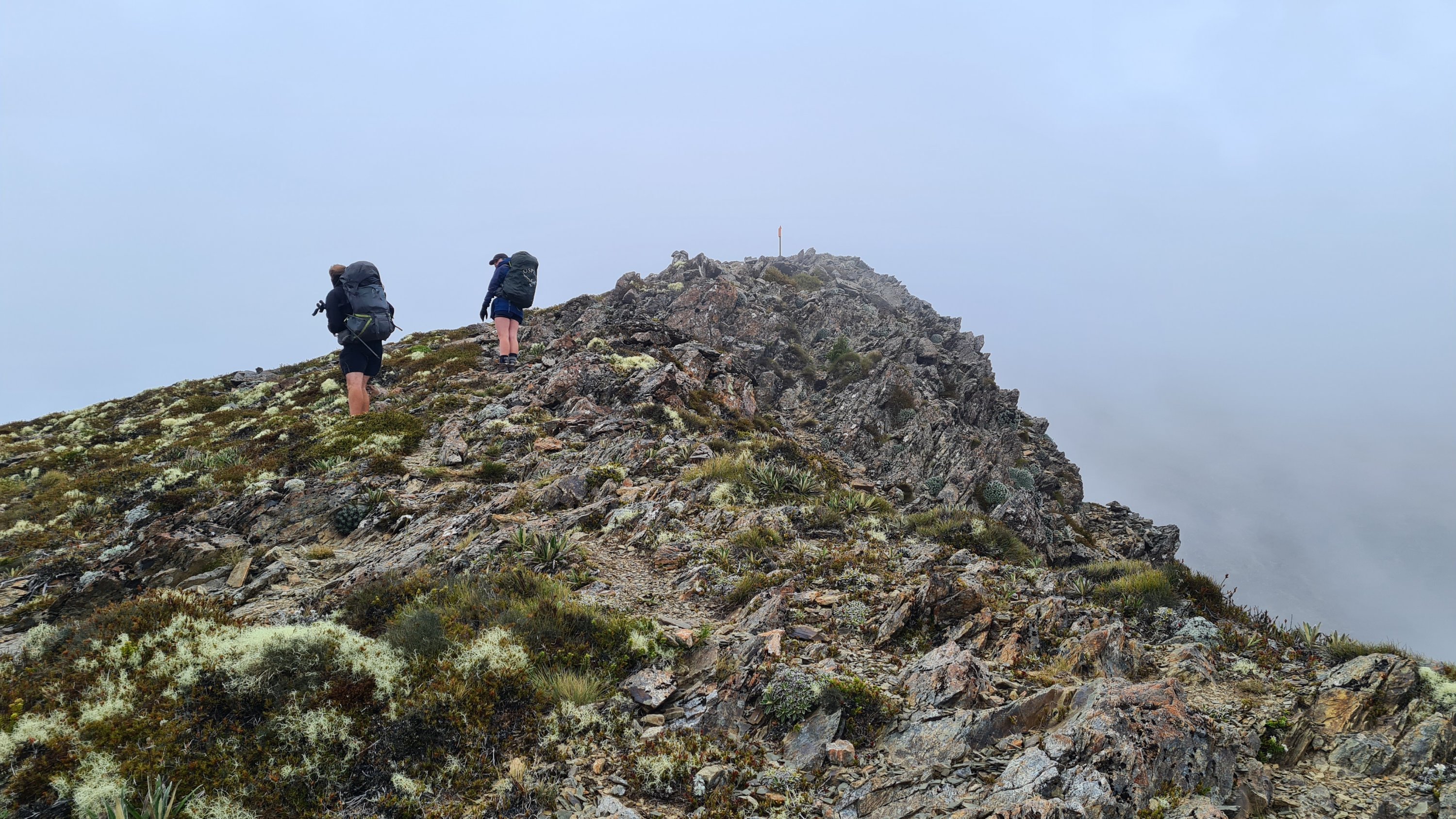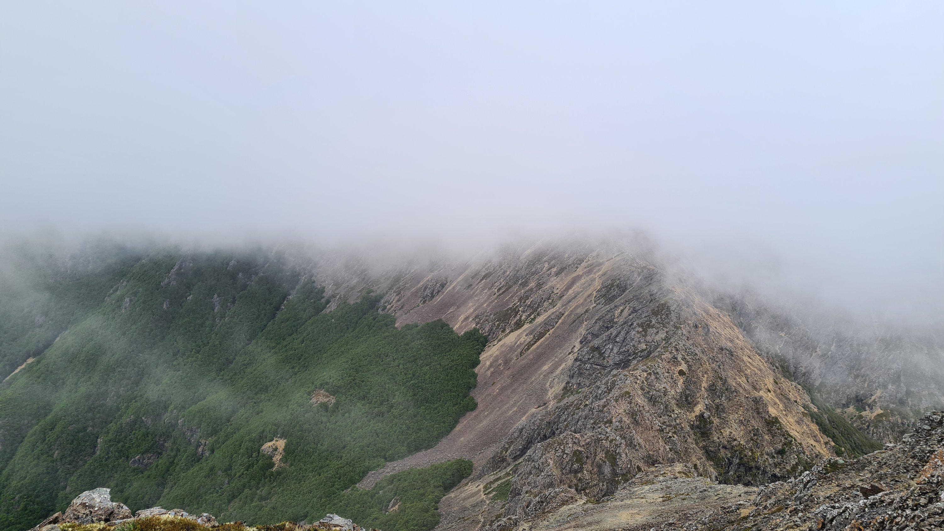 Old Man Hut was off a side track from the trail and so I started out the day making my way back to the saddle before the climb up to Little Mt Rintoul. This section is rocky and exposed. It involves some scrambling around cliffs and is the most difficult portion of the Richmond Alpine Track. It can’t be done in poor weather. Getting up Little Rintoul was ok as the weather was fine and visibility was good. There was some tricky scrambling around some rock faces with just enough room for my feet and it was a long way down. I was holding on tight and being very careful. Scary stuff! I had caught up to a group and we decided to stick together for the remainder of the mountain as we could see weather starting to move in. The descent down to the saddle between little and big Rintoul was super steep and all on loose scree. We moved very slowly and carefully. As we were coming down, clouds were starting to roll over and we could no longer see the summit. In a way it was a good thing because the track up looked very daunting. The wind picked up and there was some brief rain. After a rest break and adding some layers of clothing we started the ascent to the main summit. Again it was very slow going. The track was mostly loose scree still and I had to take care with every step that I had good grip so I didn’t go sliding and fall backwards. At times the track would dissapear and turn into boulder fields. That required good balance, rock hopping with a heavy pack on. By the time we reached the summit the wind was blowing hard and was really cold. It was a total white out so missed out on all the best views. But that was ok as I was just thrilled to have made it up there and keen to get back down the other side asap! I placed a rock on top of the pile and we took some photos for each other and were only there for five minutes. My hands had gone numb and I was freezing. It was loose scree all the way back down to the tree line but it was nice and deep so I could just dig my boots in and kind of ride it down. Much like coming down a sand dune but the scree carries you further. We arrived at Rintoul Hut at 12pm and had lunch then I carried on ahead of the group. I was really glad I didn’t have to do that last part alone.