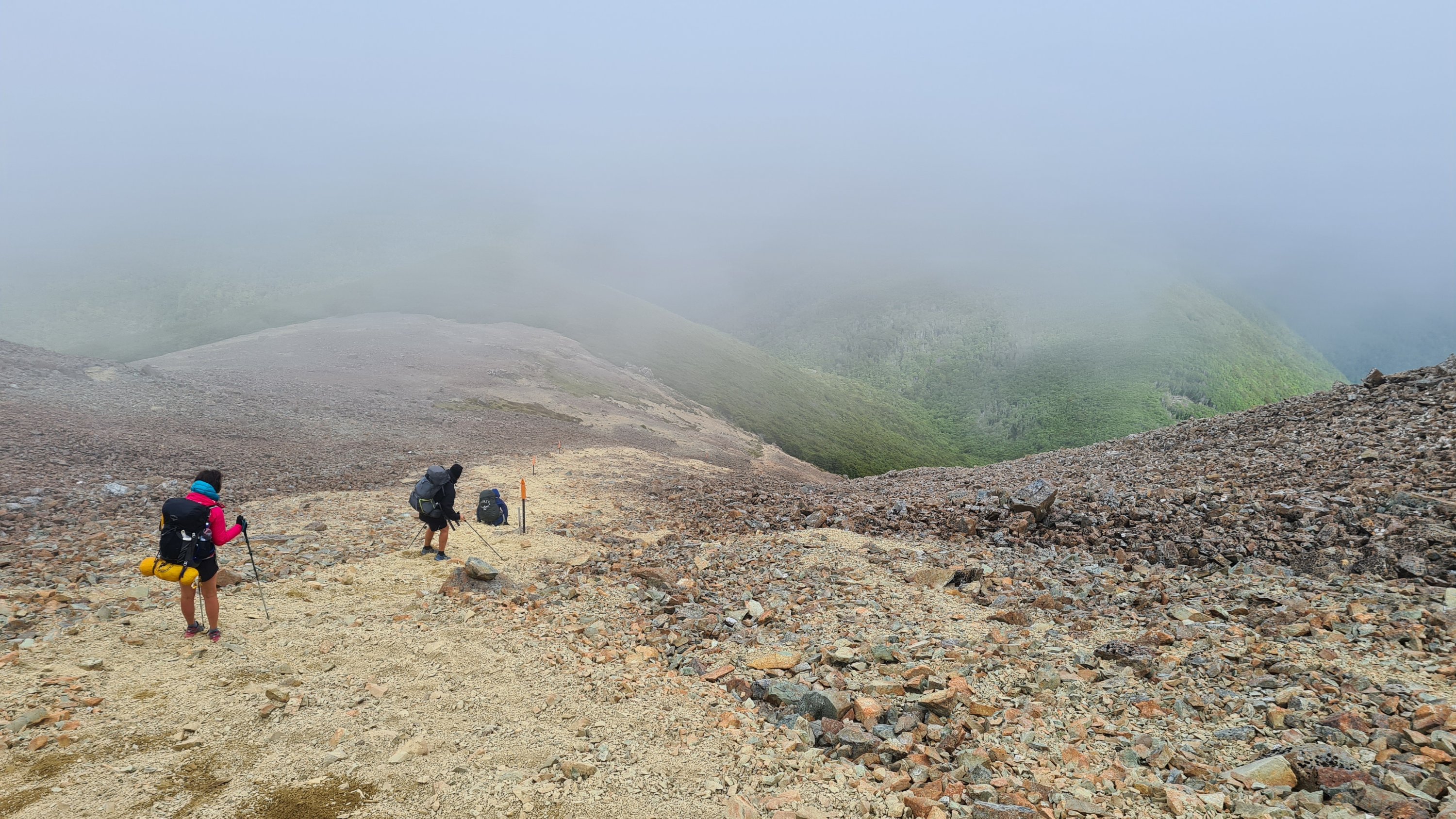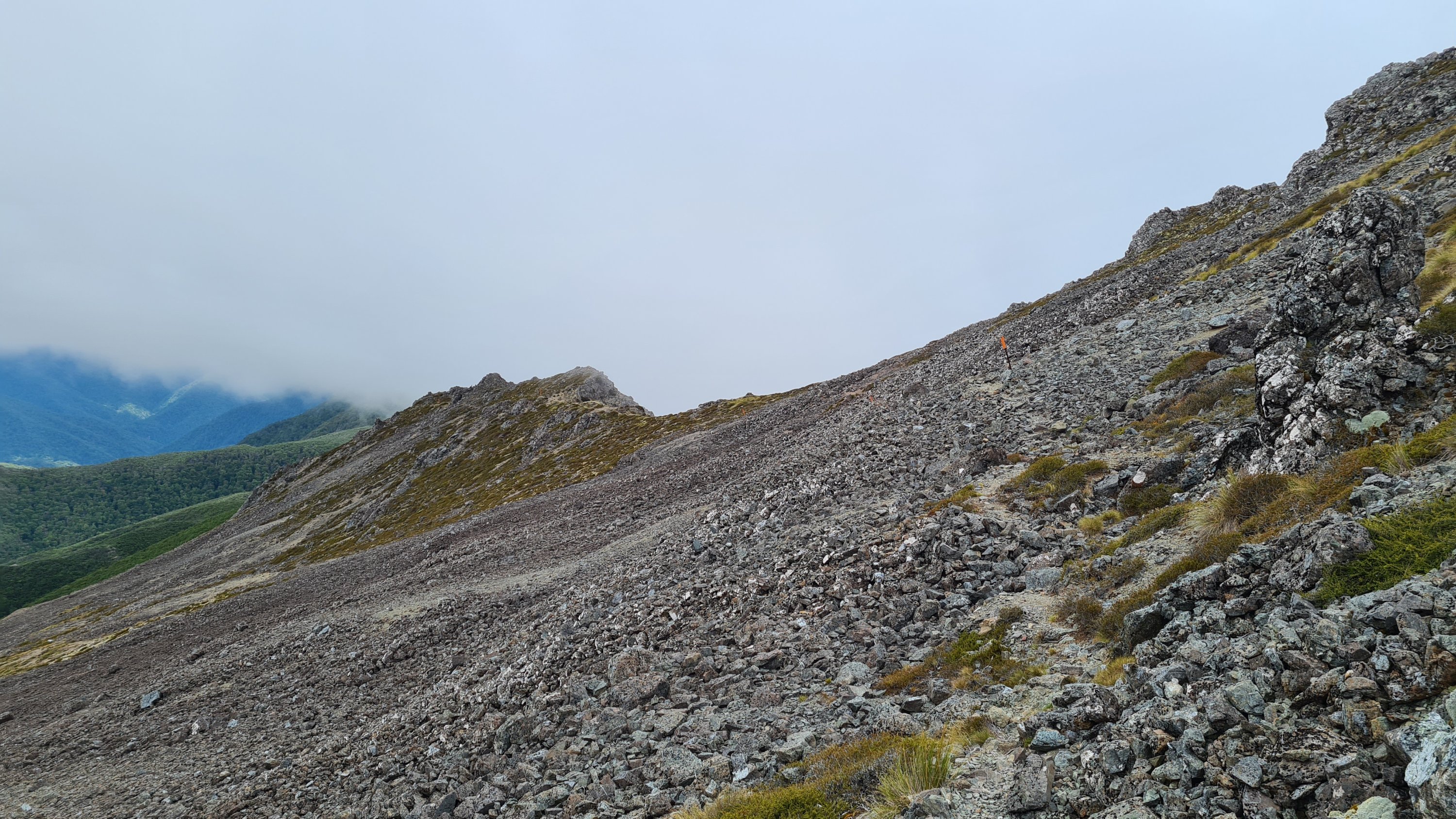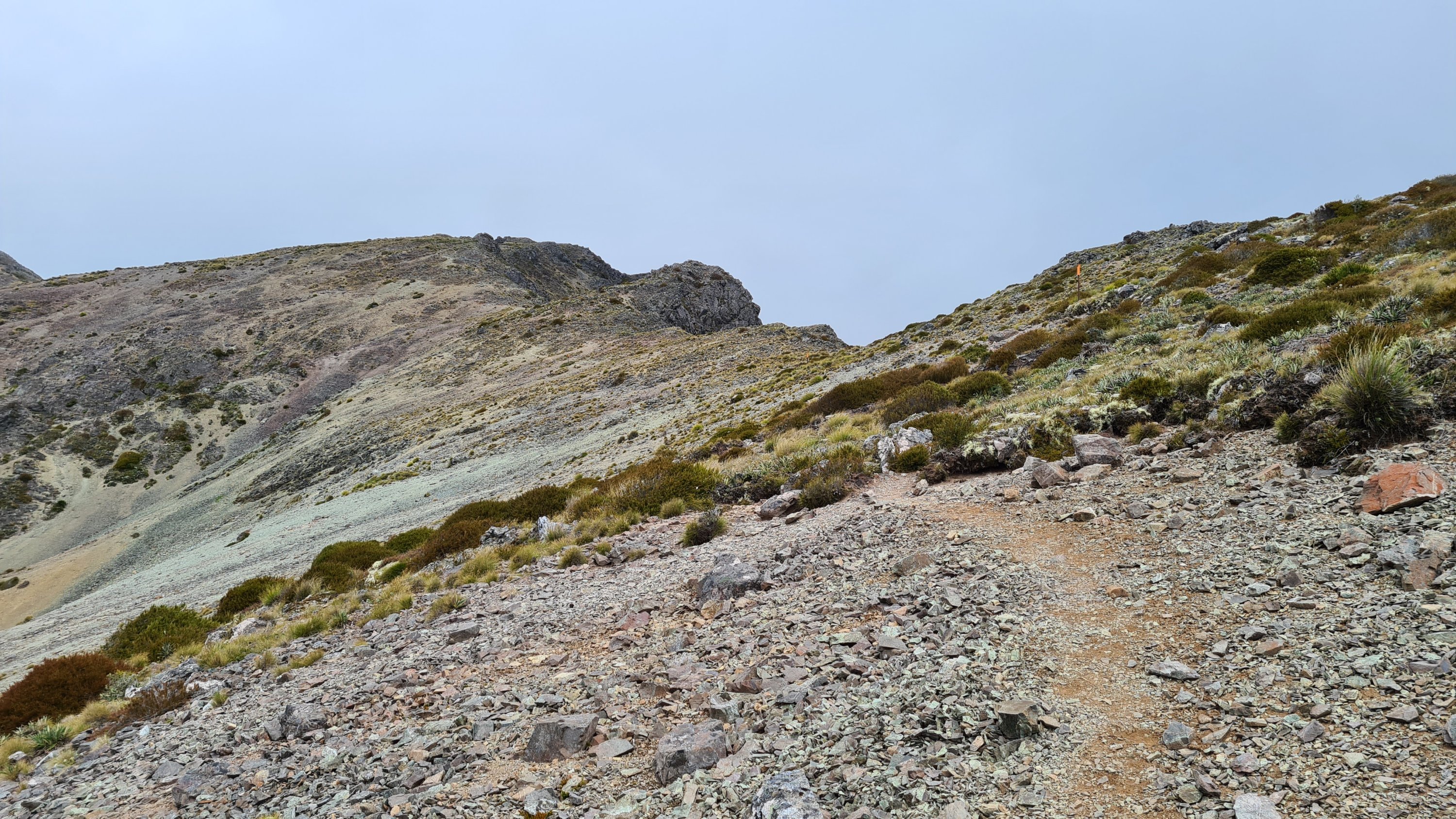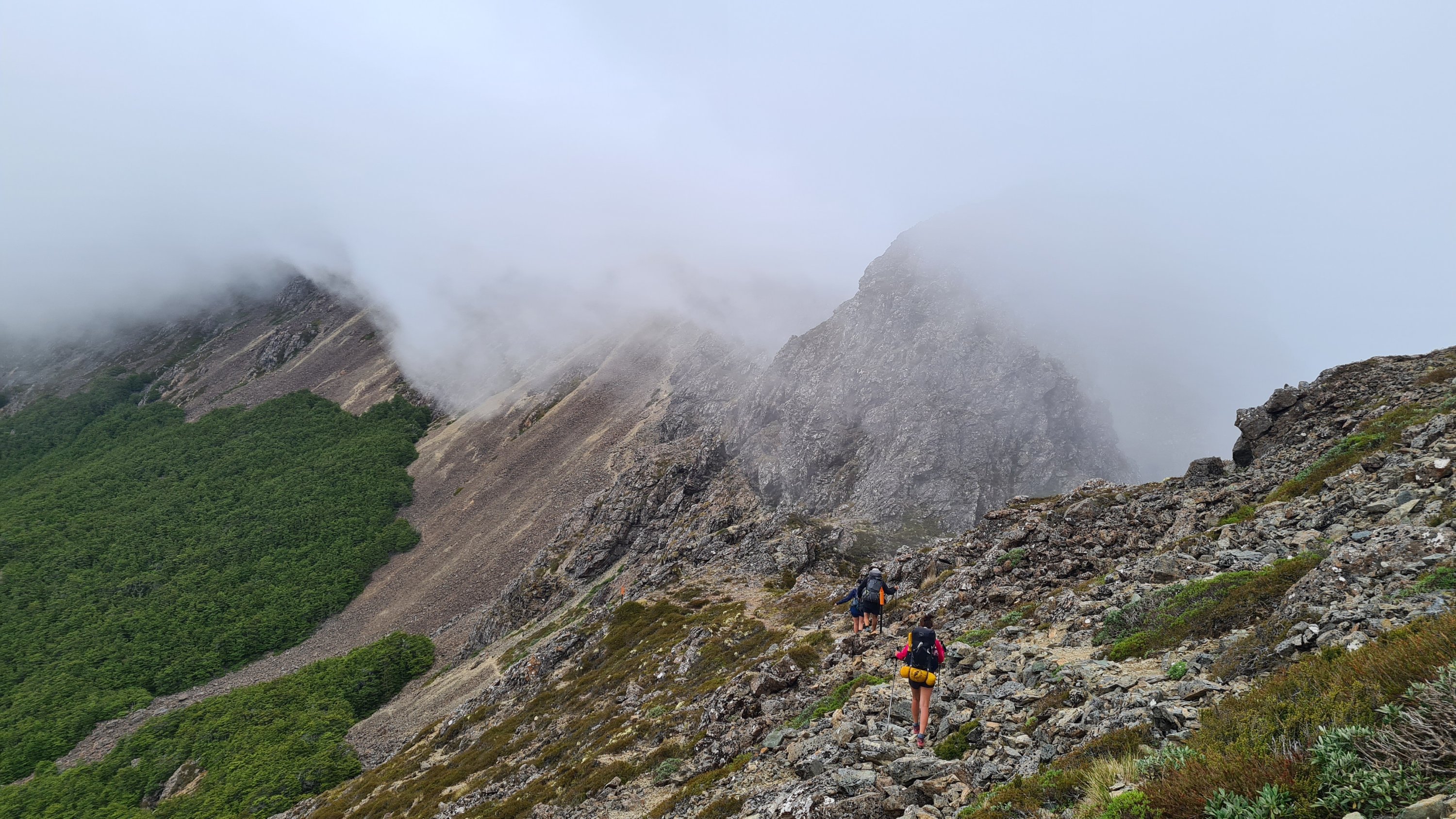 Old Man Hut was off a side track from the trail and so I started out the day making my way back to the saddle before the climb up to Little Mt Rintoul. This section is rocky and exposed. It involves some scrambling around cliffs and is the most difficult portion of the Richmond Alpine Track. It can’t be done in poor weather. Getting up Little Rintoul was ok as the weather was fine and visibility was good. There was some tricky scrambling around some rock faces with just enough room for my feet and it was a long way down. I was holding on tight and being very careful. Scary stuff! I had caught up to a group and we decided to stick together for the remainder of the mountain as we could see weather starting to move in. The descent down to the saddle between little and big Rintoul was super steep and all on loose scree. We moved very slowly and carefully. As we were coming down, clouds were starting to roll over and we could no longer see the summit. In a way it was a good thing because the track up looked very daunting. The wind picked up and there was some brief rain. After a rest break and adding some layers of clothing we started the ascent to the main summit. Again it was very slow going. The track was mostly loose scree still and I had to take care with every step that I had good grip so I didn’t go sliding and fall backwards. At times the track would dissapear and turn into boulder fields. That required good balance, rock hopping with a heavy pack on. By the time we reached the summit the wind was blowing hard and was really cold. It was a total white out so missed out on all the best views. But that was ok as I was just thrilled to have made it up there and keen to get back down the other side asap! I placed a rock on top of the pile and we took some photos for each other and were only there for five minutes. My hands had gone numb and I was freezing. It was loose scree all the way back down to the tree line but it was nice and deep so I could just dig my boots in and kind of ride it down. Much like coming down a sand dune but the scree carries you further. We arrived at Rintoul Hut at 12pm and had lunch then I carried on ahead of the group. I was really glad I didn’t have to do that last part alone.