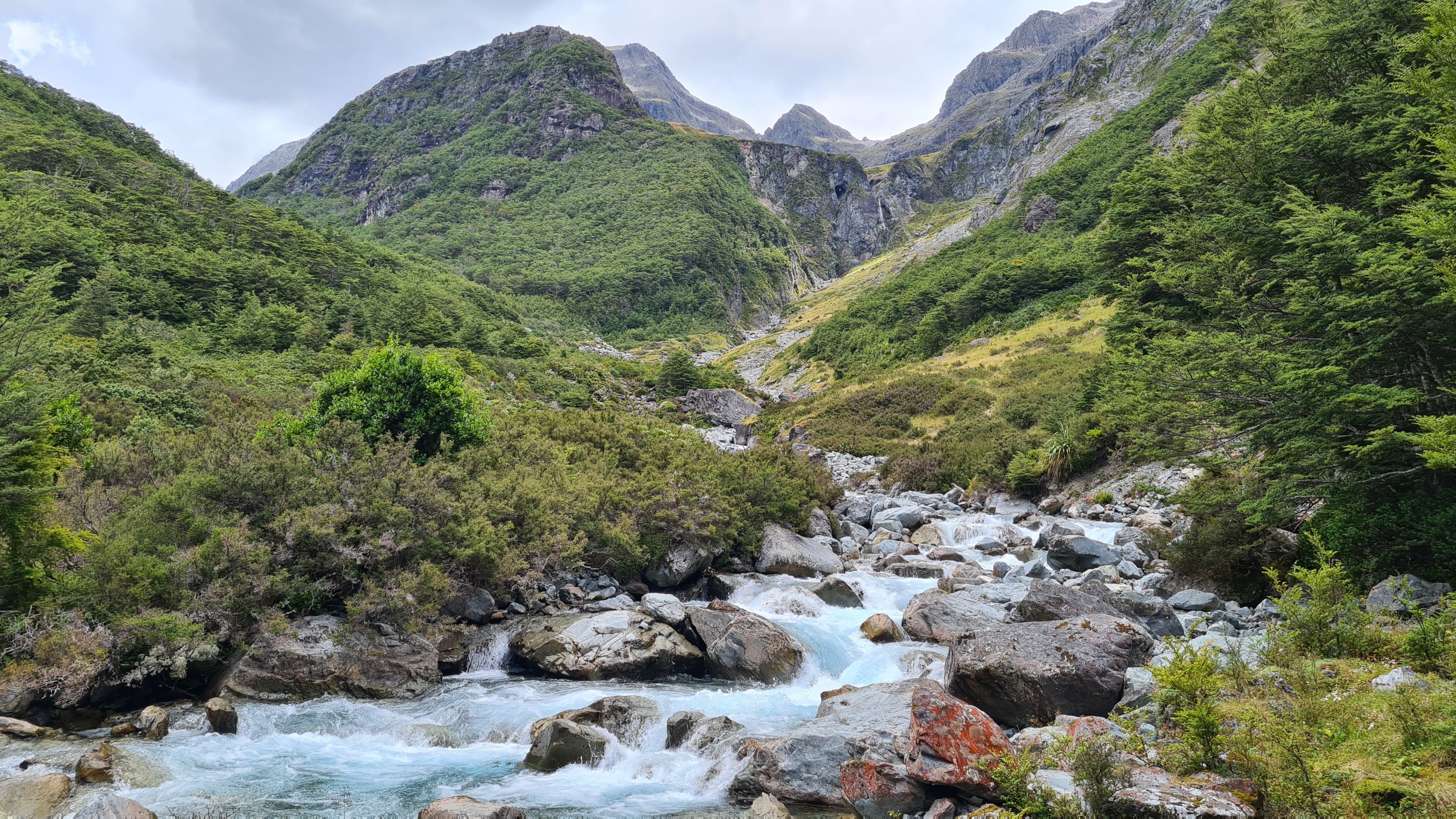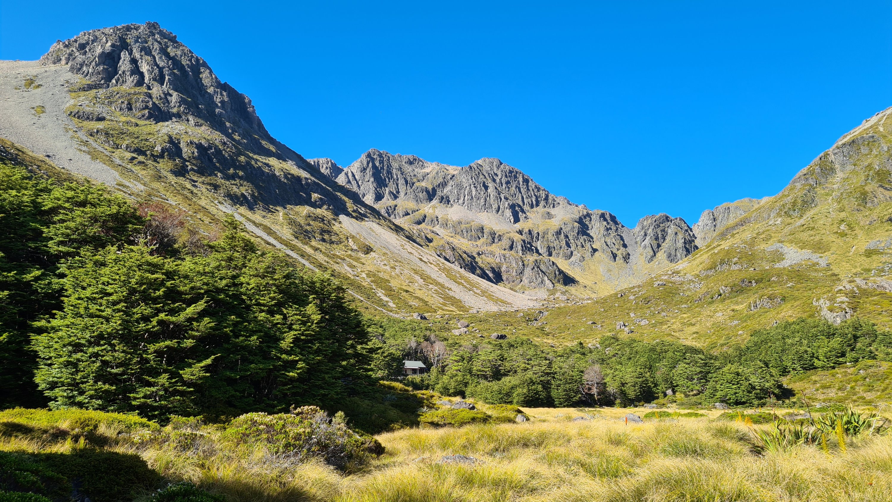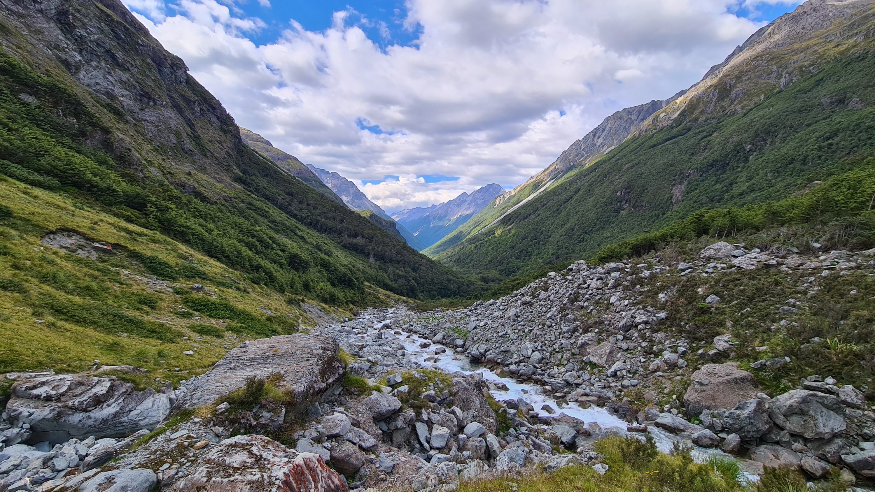 The way down took twice as long as the way up. I dropped around 900m of elevation. I don’t know how my knees handled it. My lower back didn’t like it and is now aching badly. Eventually I came to the east branch of the Sabine River and stopped for lunch. Salami and cheese wraps and some electrolites. I followed the east branch down to where it combines with the west branch. At one point I crossed a small bridge over a very narrow gorge. I could only hear the water roaring through below but could not see it because it was pitch black. It could have been 30 meters below. At the junction the track followed the west branch upstream to West Sabine Hut. I had planned to stay there for the night but it was only 2.30pm when I arrived. I knew the next day was also going to be a big one and the next hut was only three more hours away so I decided to push on to Blue Lake Hut.