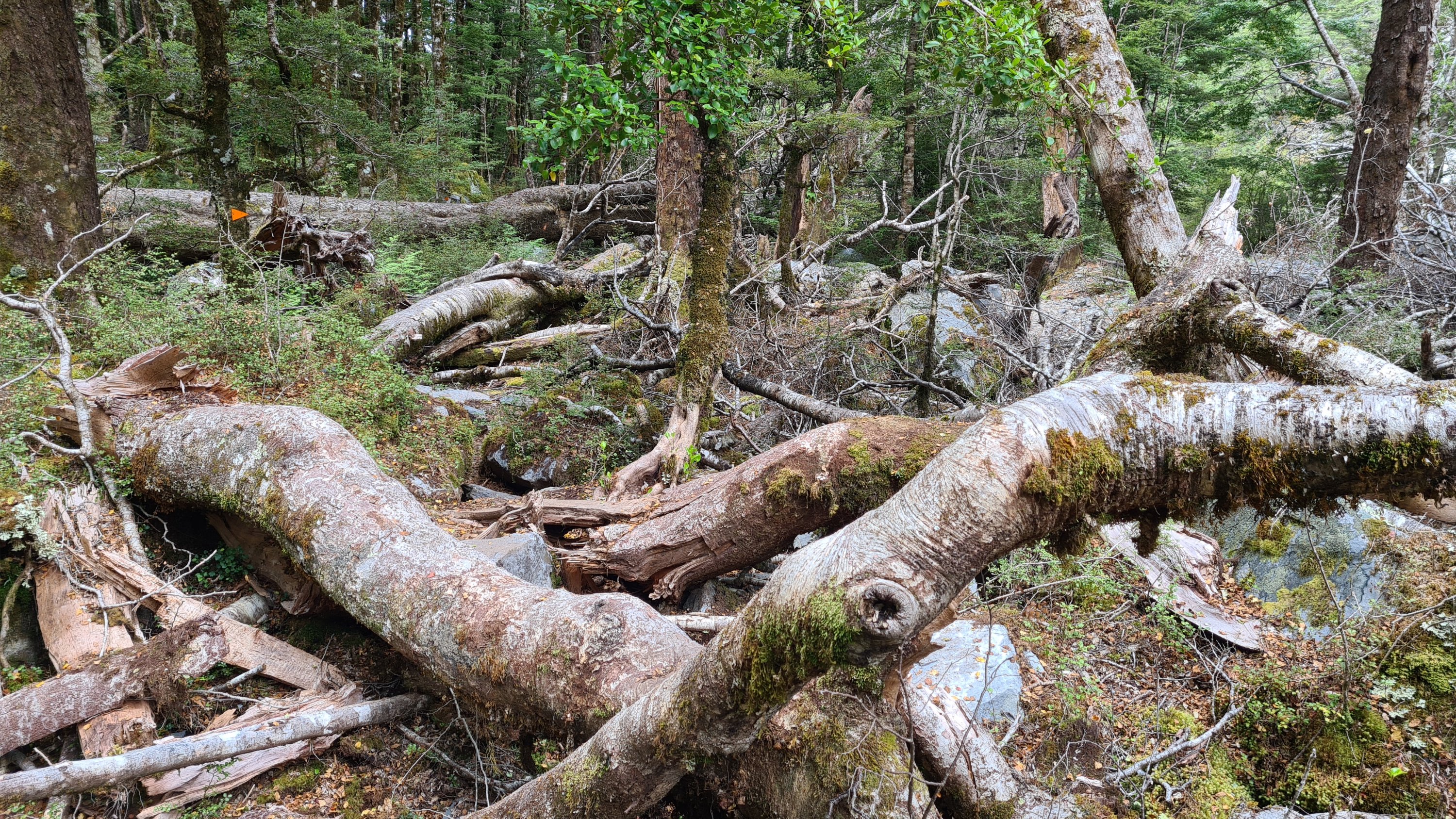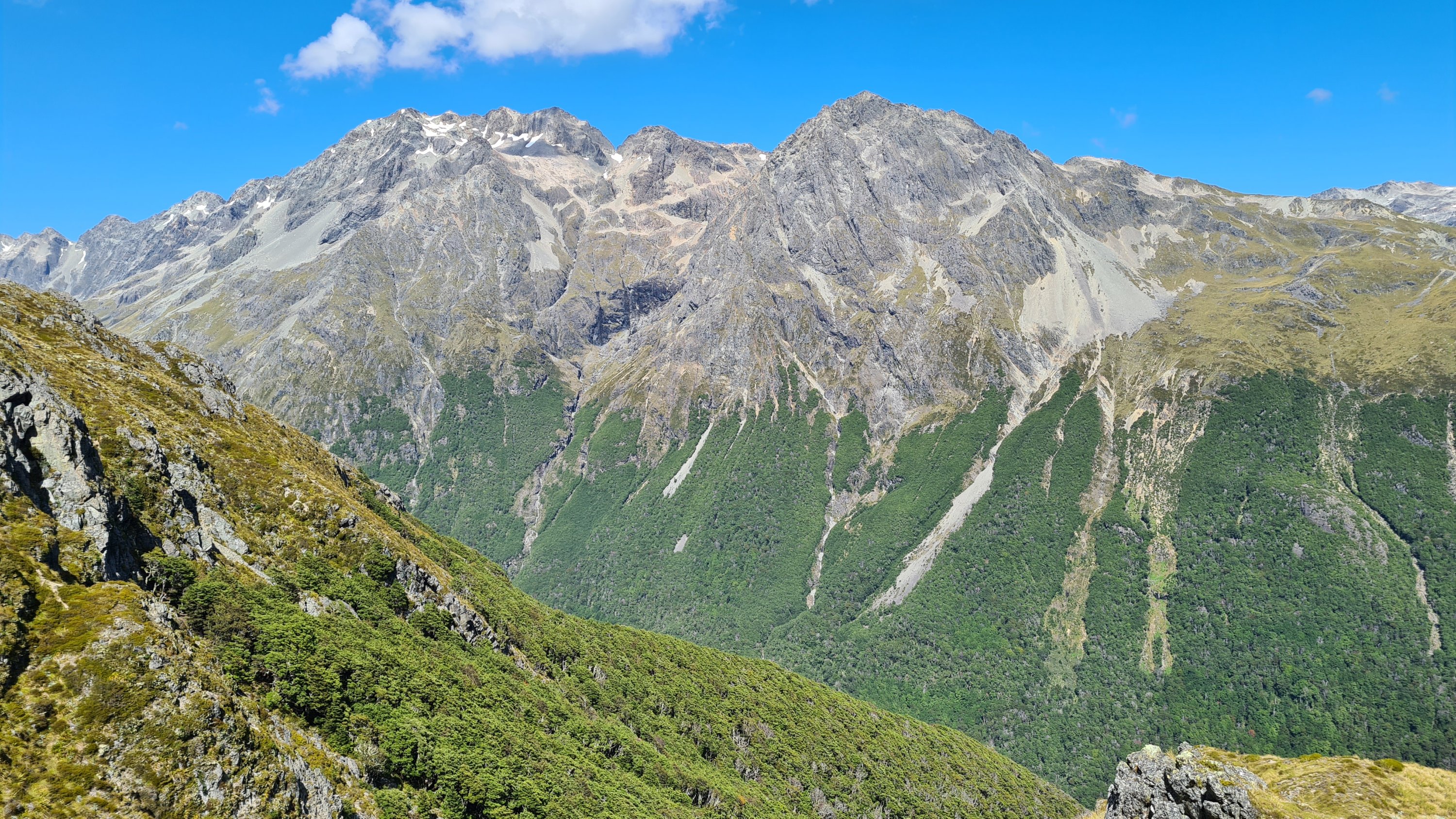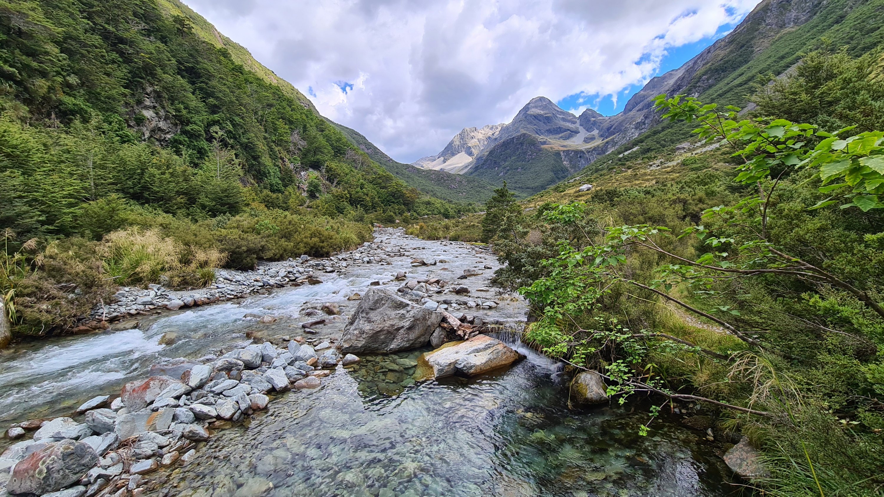 The way down took twice as long as the way up. I dropped around 900m of elevation. I don’t know how my knees handled it. My lower back didn’t like it and is now aching badly. Eventually I came to the east branch of the Sabine River and stopped for lunch. Salami and cheese wraps and some electrolites. I followed the east branch down to where it combines with the west branch. At one point I crossed a small bridge over a very narrow gorge. I could only hear the water roaring through below but could not see it because it was pitch black. It could have been 30 meters below. At the junction the track followed the west branch upstream to West Sabine Hut. I had planned to stay there for the night but it was only 2.30pm when I arrived. I knew the next day was also going to be a big one and the next hut was only three more hours away so I decided to push on to Blue Lake Hut.