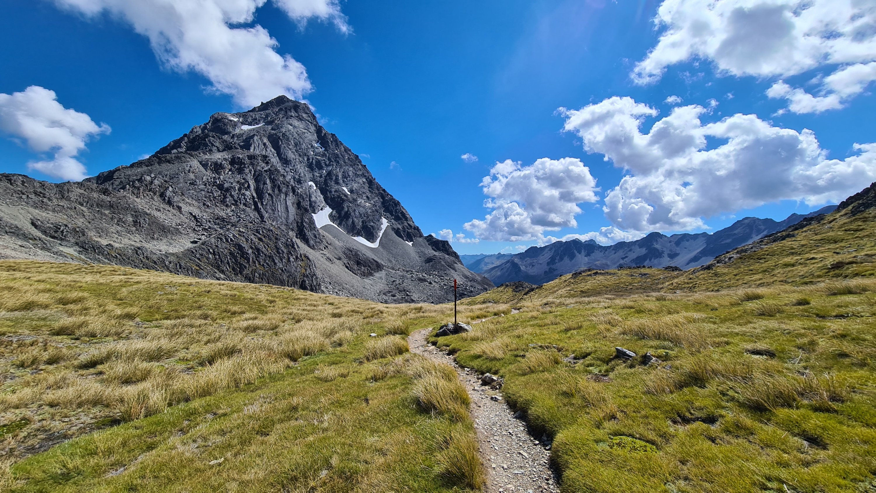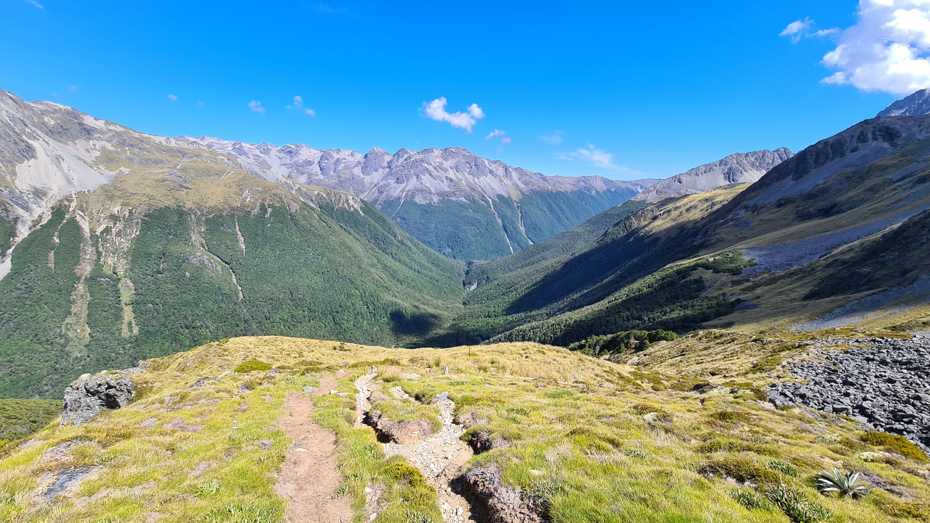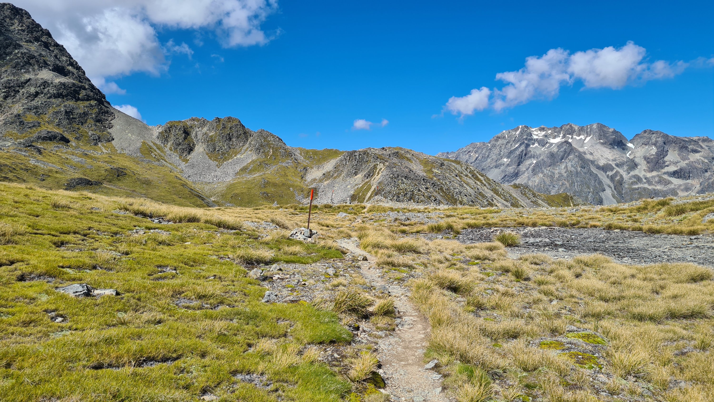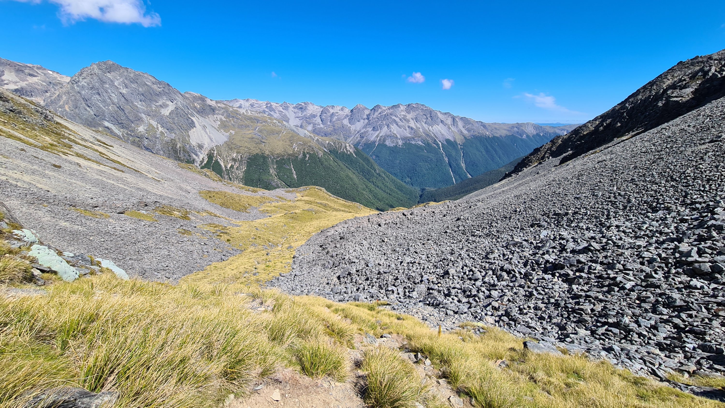 Wow what a day! Nelson Lakes National Park is amazing. I started out at 7am continuing up the Travers river to Upper Travers Hut which sits below Travers Saddle. I was there by 9am and had a snack before starting my climb up and over the saddle. It was a fairly big climb. There was mixed terrain with grassy tussock and boulder fields. The mountain tops were towering around me and I could now see patches of snow on them. This is real Lord of the Rings country here. It was just like the movie. I passed a couple on the way up. Once I was on top of the saddle a whole new set of mountains came into view. It was breathtaking.