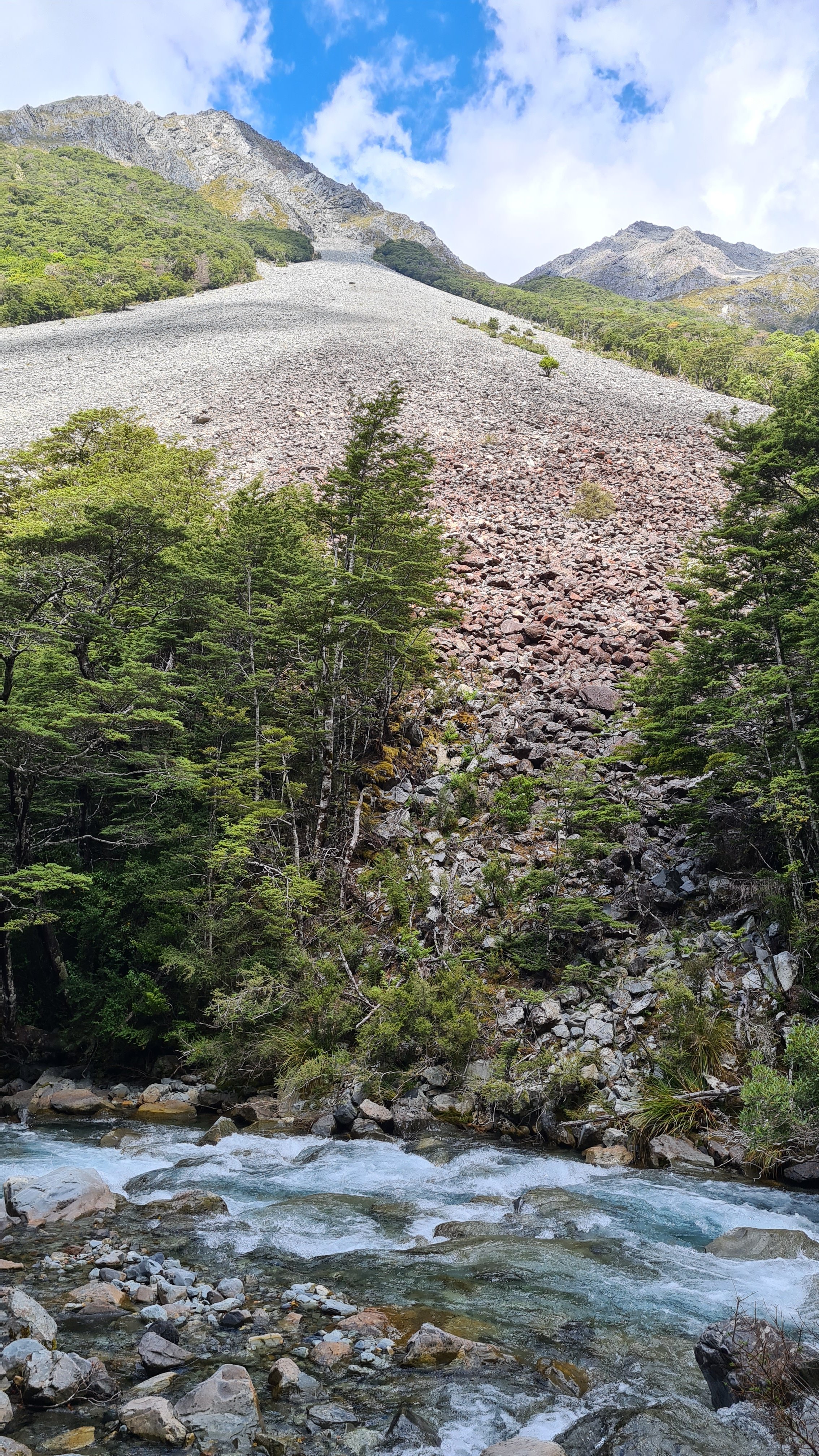 The track continued up west Sabine River. The rivers here are so beautiful. The flow was intense in places and there were huge rapids. Mountains were still towering either side of me. I passed through several different avalanche zones during the day. There were huge slips that were hundreds of meters high. They feed the river with more rocks and boulders every time the earth shakes. There must have been some major floods through here over the last year or so because long sections of the trail were wiped out with giant trees ripped out of the ground and spread all over the place.