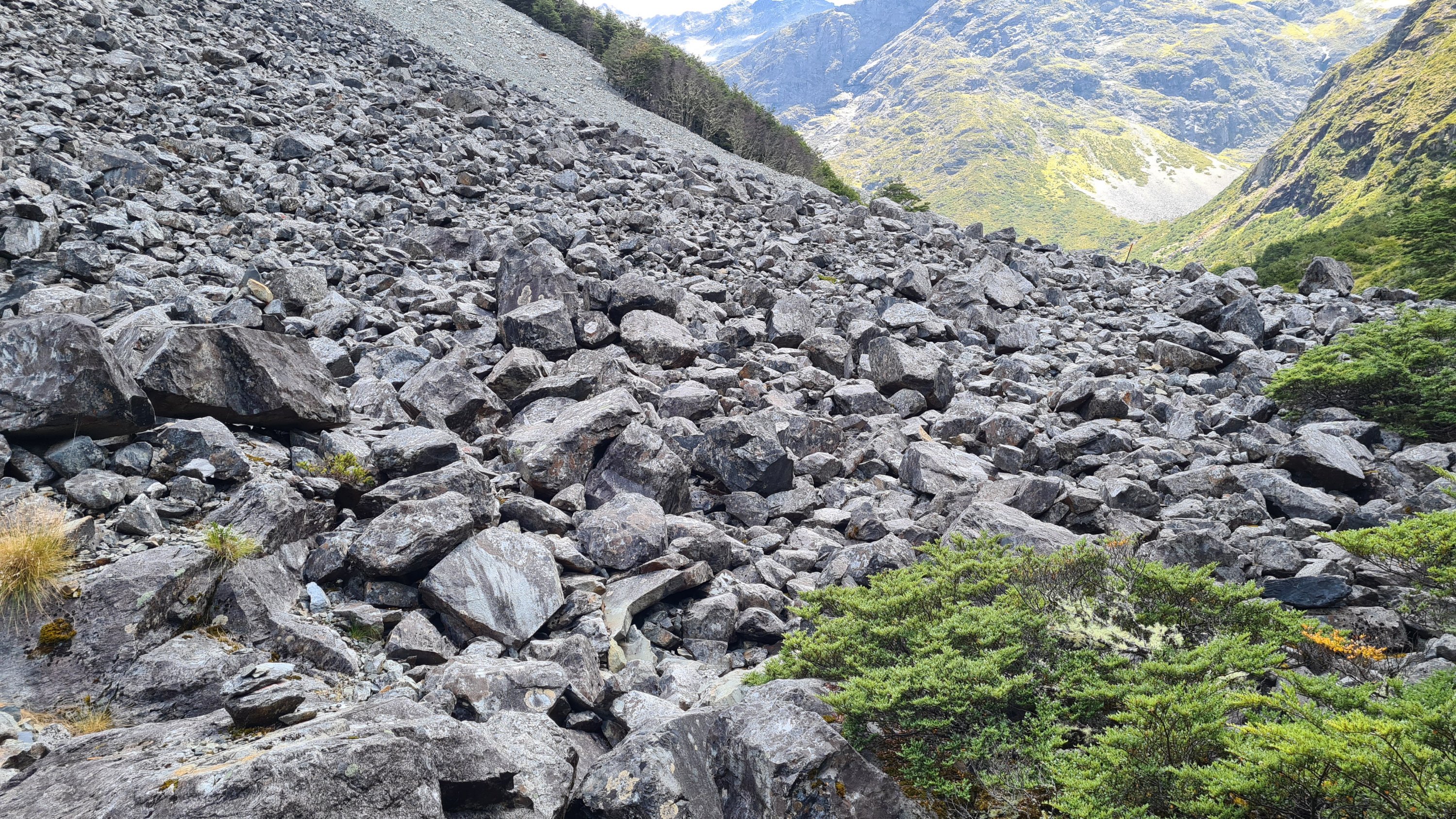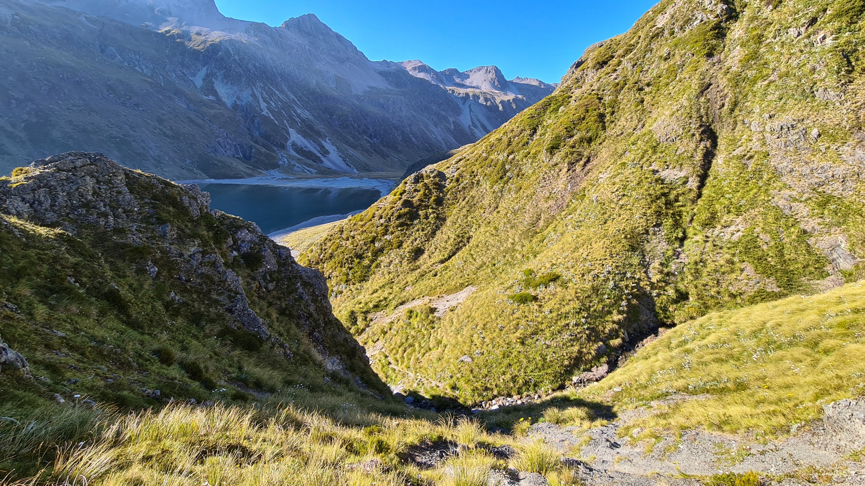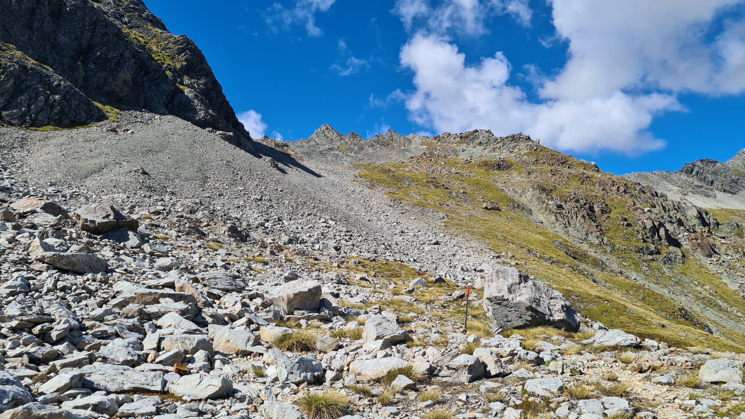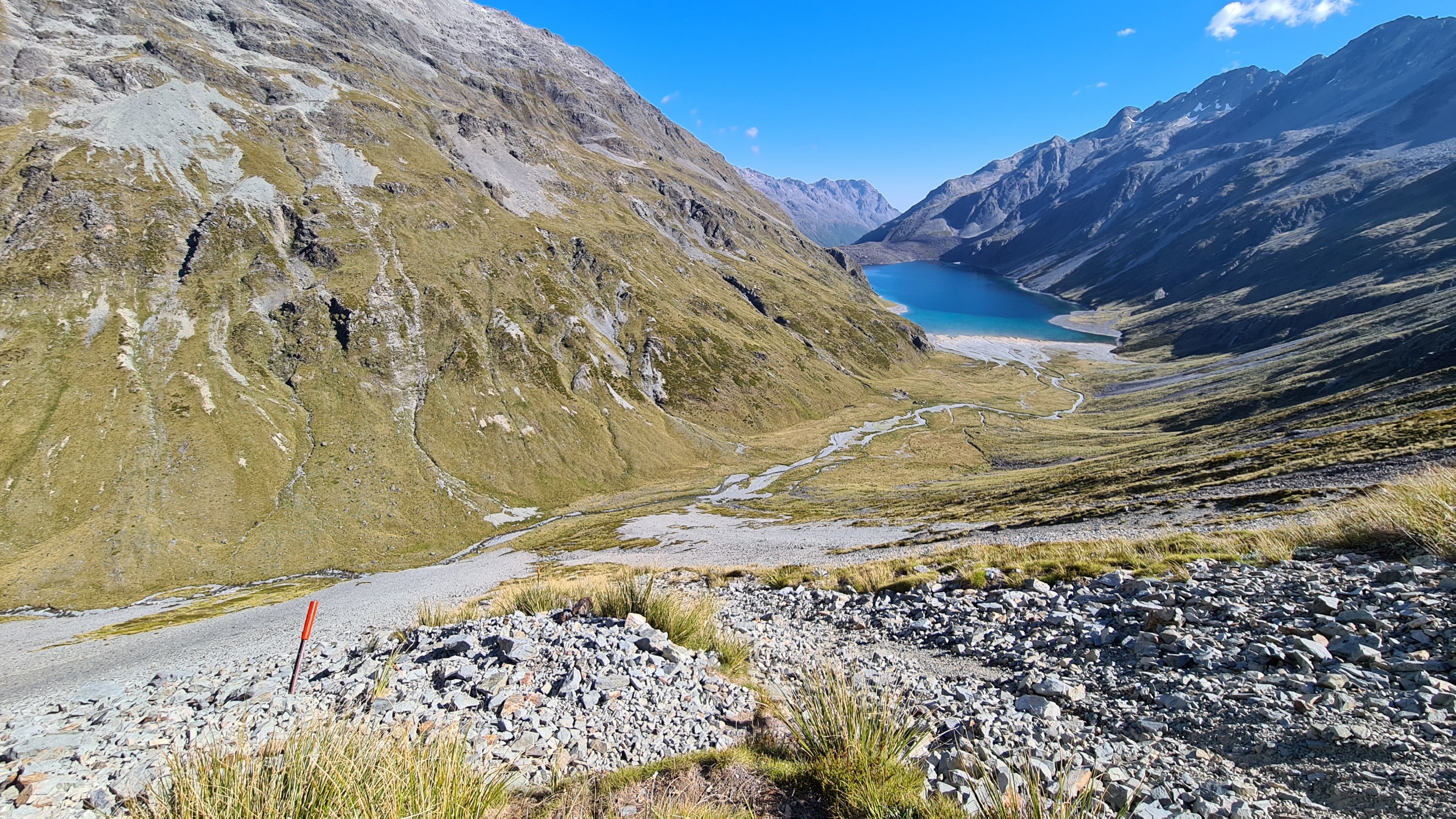 The hut was full last night but nobody was heading the same direction as me today. Everyone else had only come up to Blue Lake and were returning again down the Sabine River which meant I was doing a solo mission over the Waiau Pass. I started out with a quick climb up to Lake Constance. I lost the trail for a while after crossing a large slip about 30 meters across and a few hundred meters high. I went down instead of up because I could not see a marker pole but I did see a cairn someone had constructed below. These are common navigational aids on remote parts of the trail when marker poles are far apart. I checked my map and realised the track was high above me so I spent a bit of time cutting my own track up some steep terrain that was rocky and thick with tussock. It was a relief to see the orange marker again. The terrain was rough and rocky and very steep in places when descending back down to the lake.