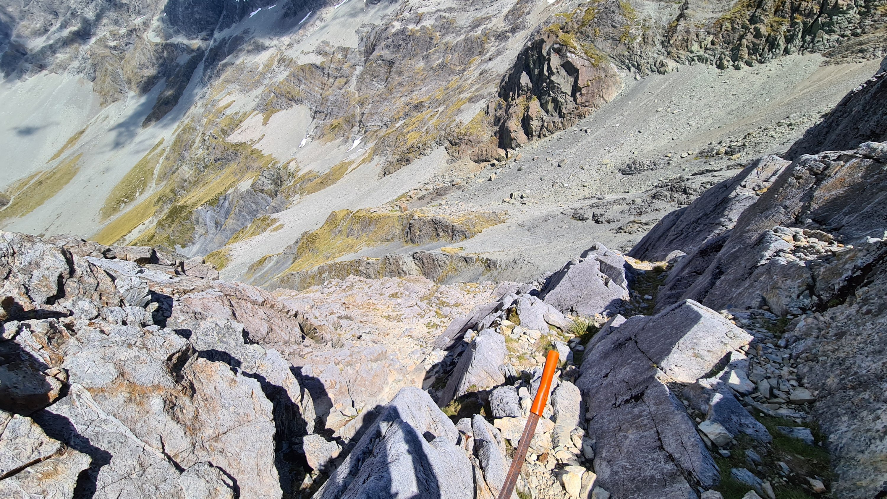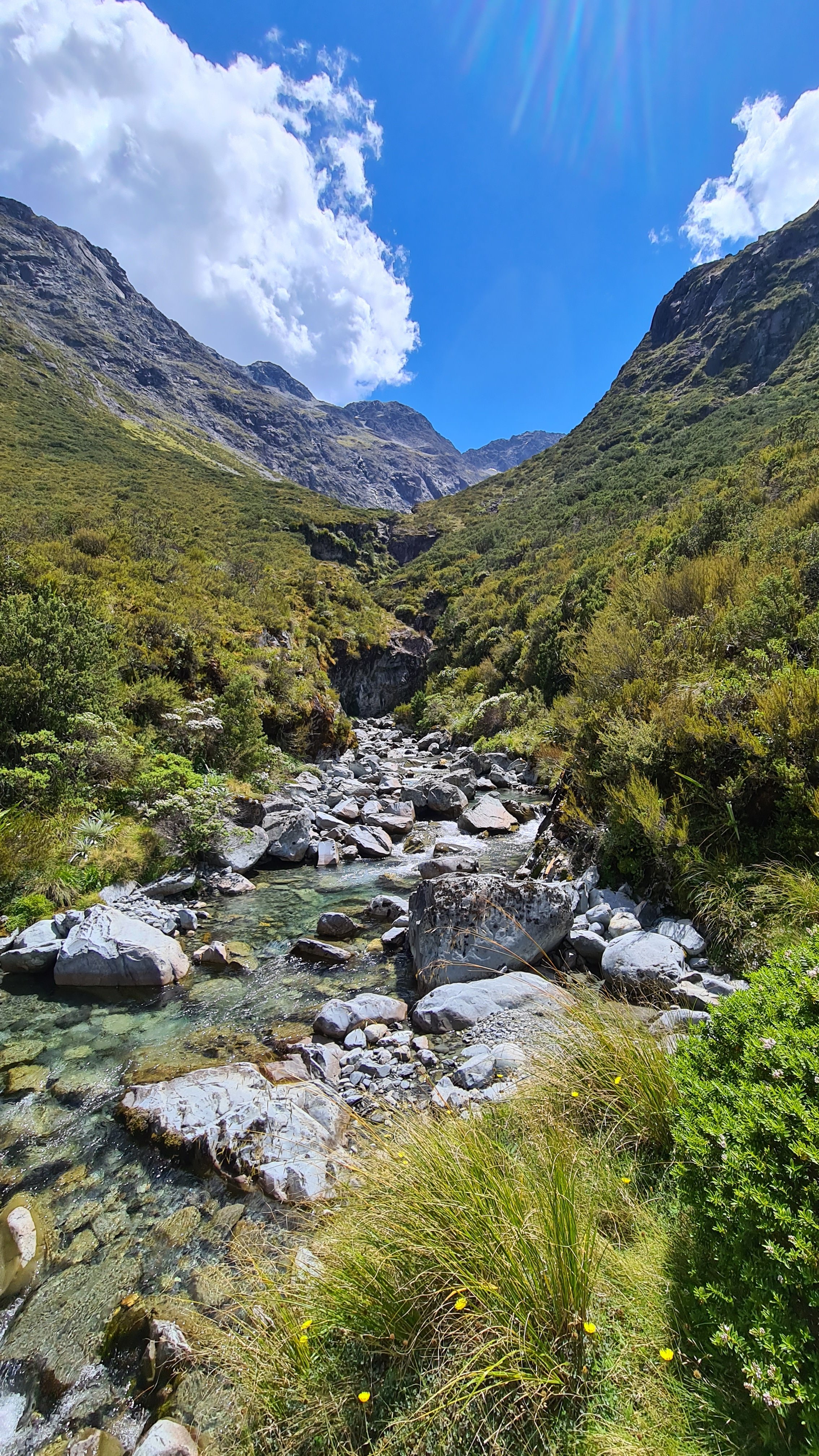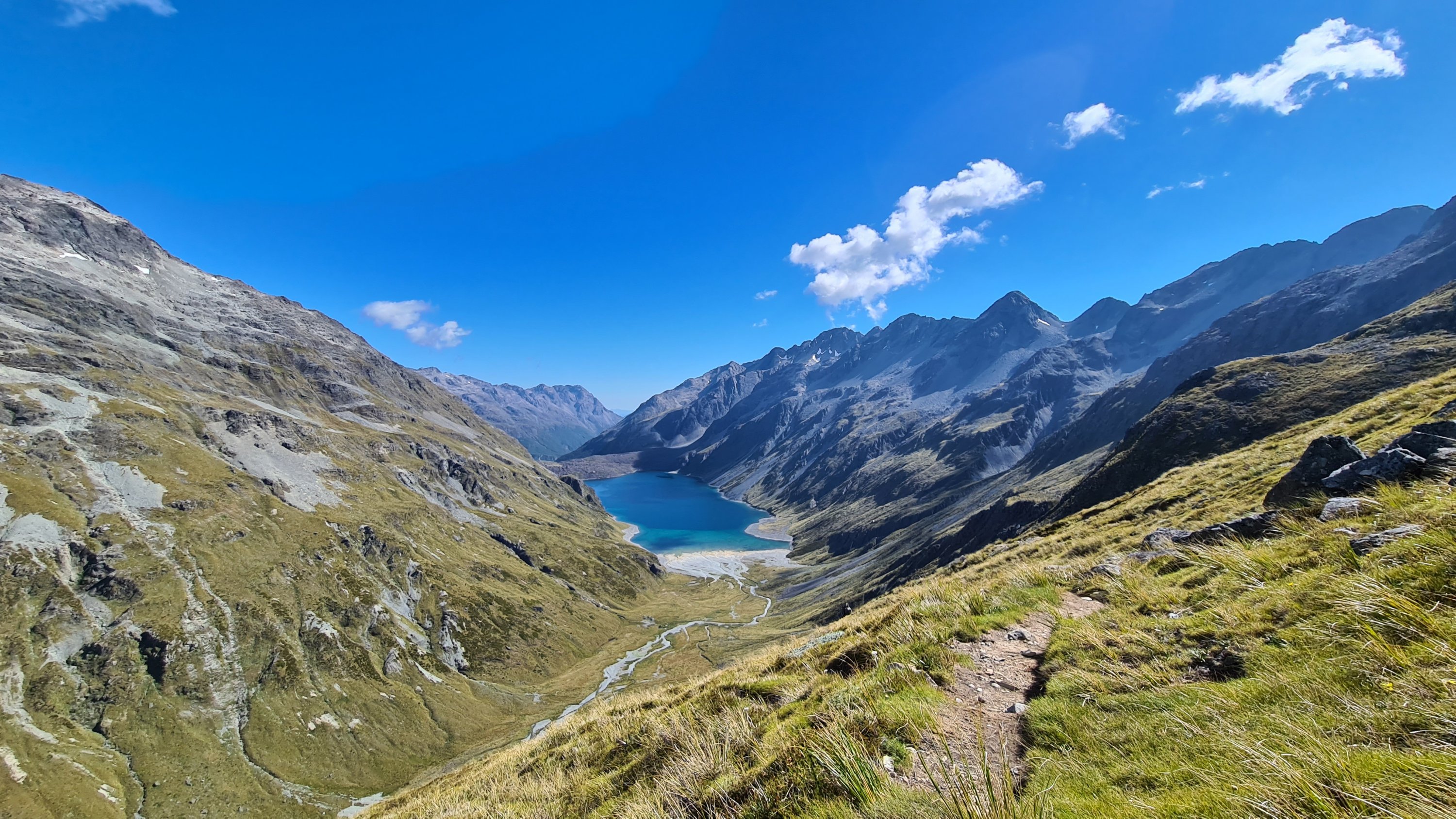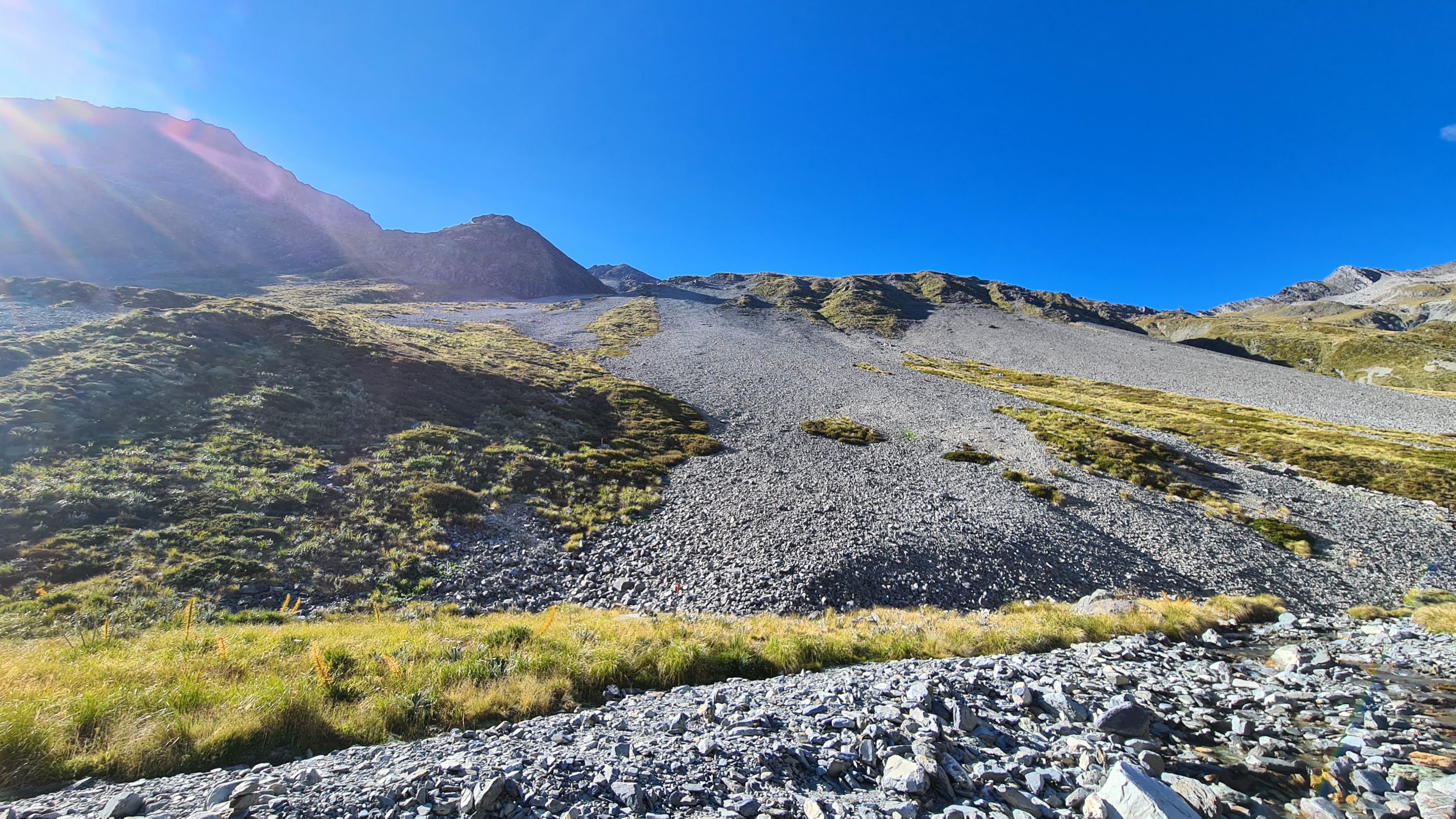 I continued up the valley to what looked like a dead-end. This is the Waiau Pass. There is no way around it and you have to climb a 500m high scree slope to get over it. The photos don’t do it justice but imagine the sky tower next to it which is 328m. I stood at the bottom for a while looking up and I must admit I was feeling a wee bit scared of it. I had to pump myself up for it and thought about the other challenging sections I have done before. I had a good feed of trail mix then started the ascent. I would have stopped about a dozen times on the way up to catch my breath. My legs were tired from the big day yesterday which didn’t help. About half way up, the track goes sideways across the scree slope before ascending straight up again to the top of the pass. I took some photos looking back down at Lake Constance before it was out of view. The final climb was slow and I took it one marker pole at a time. They are only about 20 meters apart at that point. It was an amazing feeling reaching the top and I felt a huge sense of achievement. A whole new set of mountains came into view. I sat down and had a rest and soaked it all in before going down the other side. The weather was perfect. It was a very long and slow descent to the valley floor. The initial descent was straight down and involved putting my sticks away and climbing down rock faces. There were plenty of hand and foot holds so it was easy enough but tiring again on the knees and quads.
