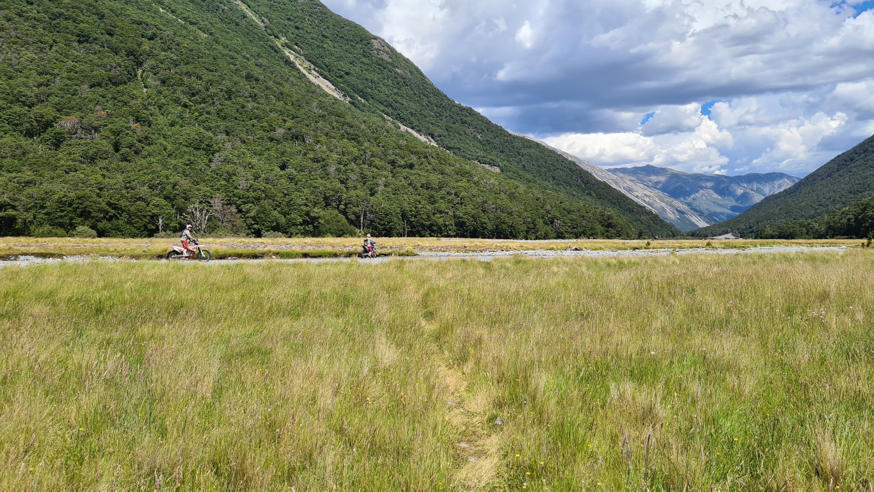 The track followed the Waiau river down to the hut. There were several rock and boulder fields to cross from big slips off the side of the mountains before the terrain flattened out on to the valley floor. I met two men who had come up on their motor cross bikes and were having a break at an old decommissioned hut. They had come up as far as they could. Tomorrow there is the St James Ultra event further down the valley where a few guys are running 100 miles non stop. There is also a 100km run and a 60km mountain bike ride event. The guys on the bike are part of the safety support crew.