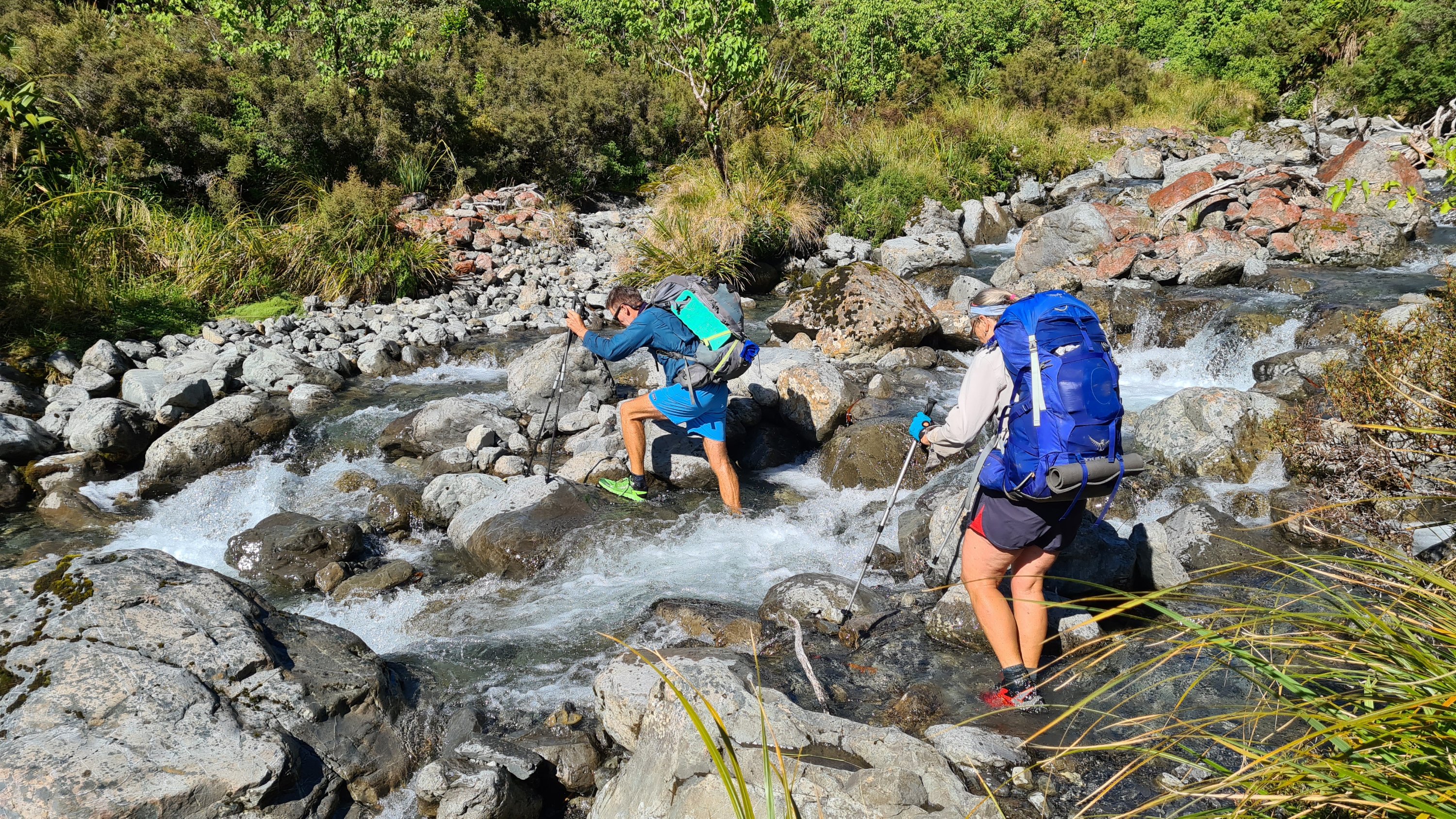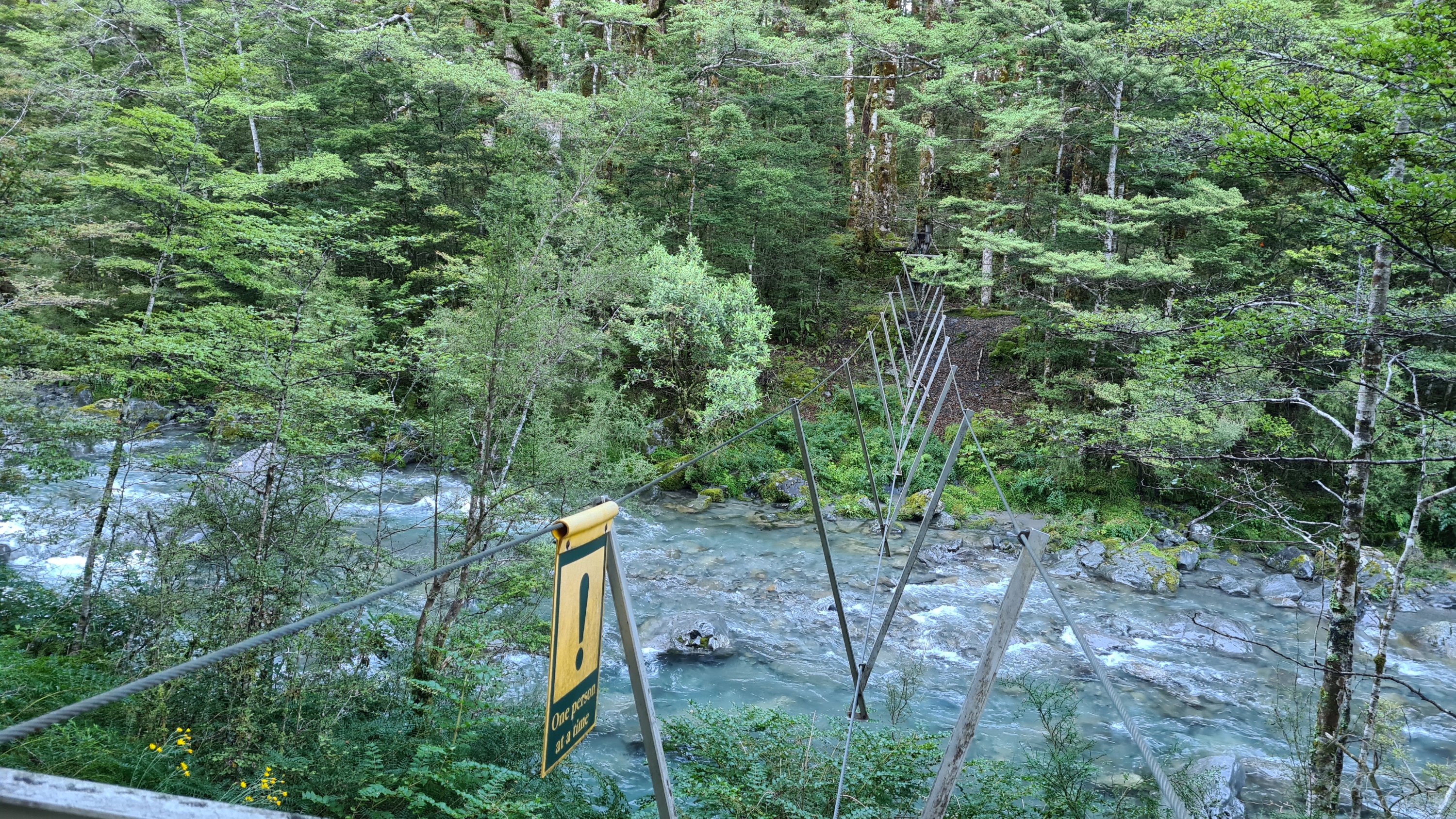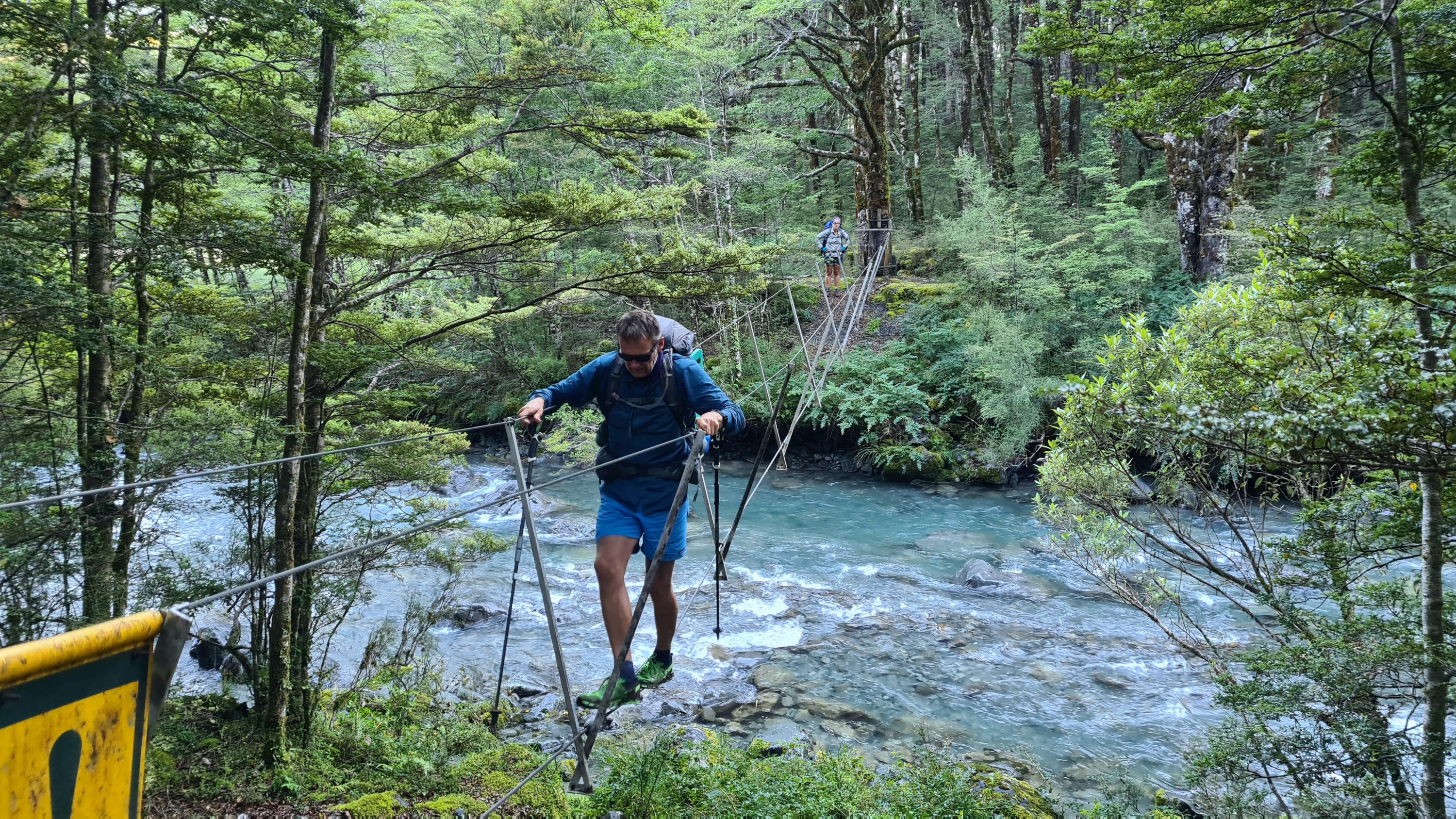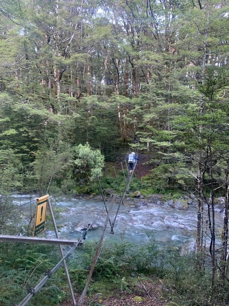 Scott, Jane, Tui and I all set off together at 7am. One of the first streams we crossed had a three wire bridge. That was fun and easy enough but took a bit more concentration. Tui shot ahead early on and we did not see him again today.