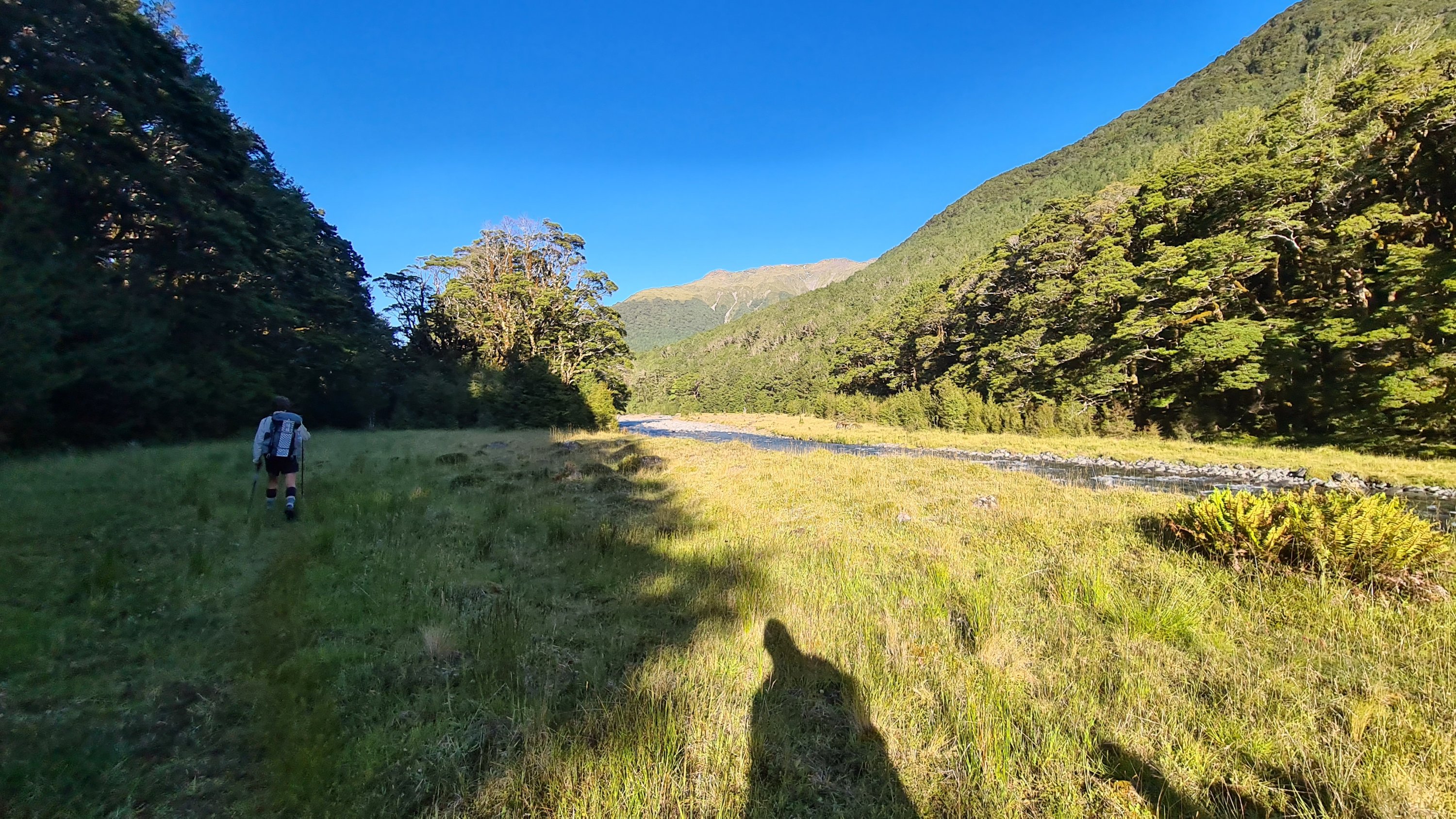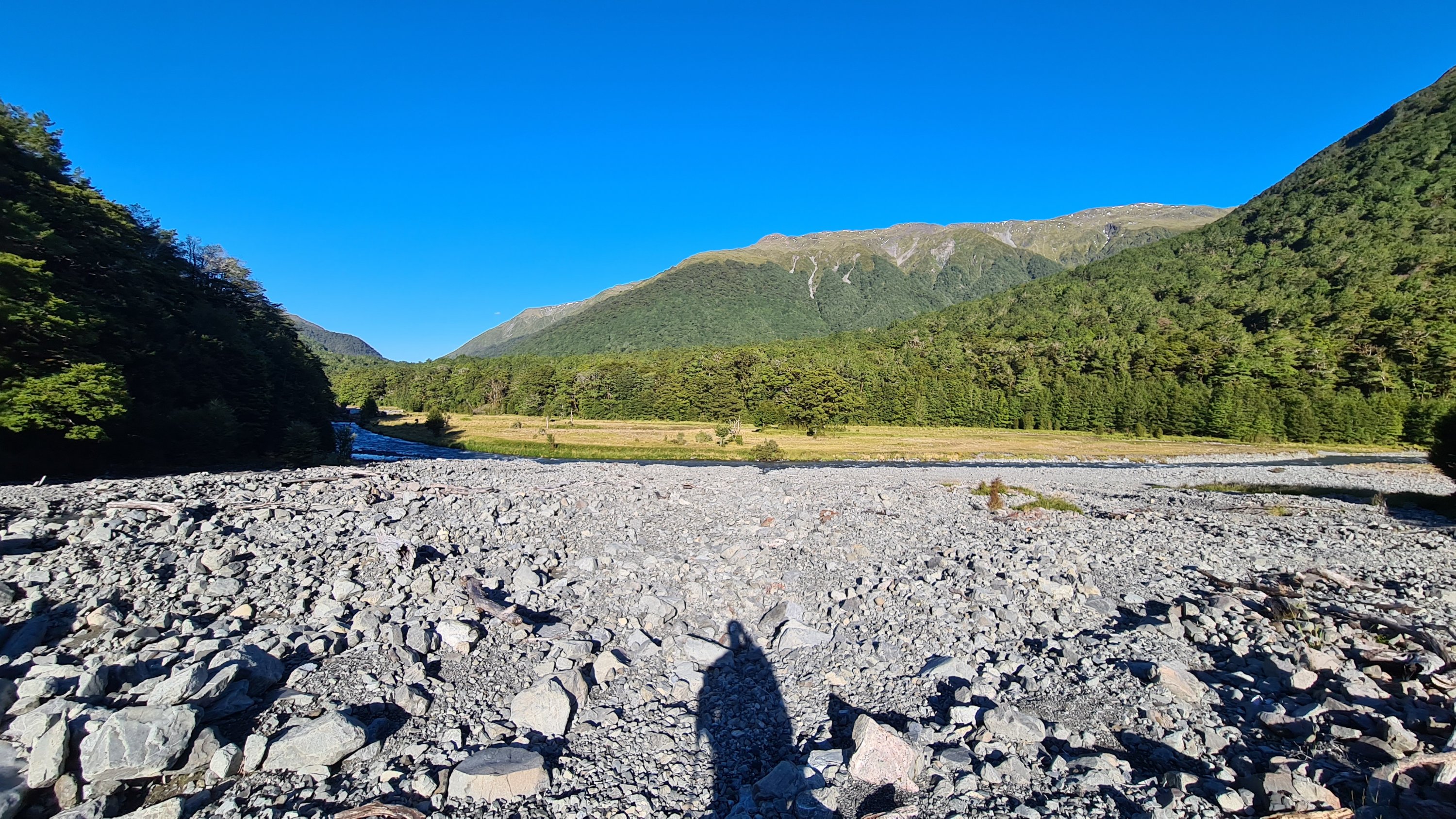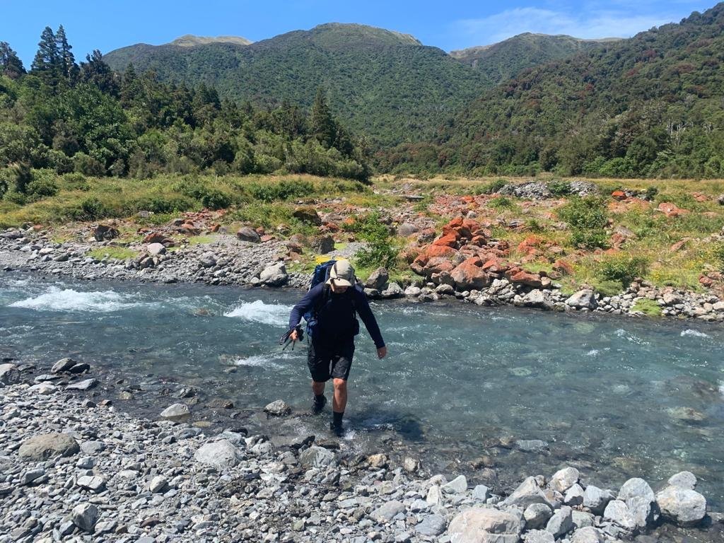 We stopped at Locke Stream hut for lunch and then continued on down the valley. We crossed the Taramakau and then followed the true right side down for several kilometers on open flats and dry river beds. There were dozens of streams coming down from the hills that we crossed and drank from as the sun started to heat up. We stopped for another break at the junction to Kiwi Hut and checked our maps and identified a good place to camp on open grass flats and next to the river so we had water. We pushed on for another 7kms to get there but it was not an easy 7kms. We had to cross the Taramakau again and it was getting big down there. Where we were meant to cross was flowing too fast and deep so we walked upstream until we found a safer place to cross where the river split in two. We took our time studying the best way over before committing. The first braid was easy enough but we had to link up for the second part. The water was over my waist and moving fast. We held strong and moved well together. It was a real thrill and I was stoked when we got to the other side! I had been thinking about this crossing for a few days and I really got to put my river crossing skills to practice.