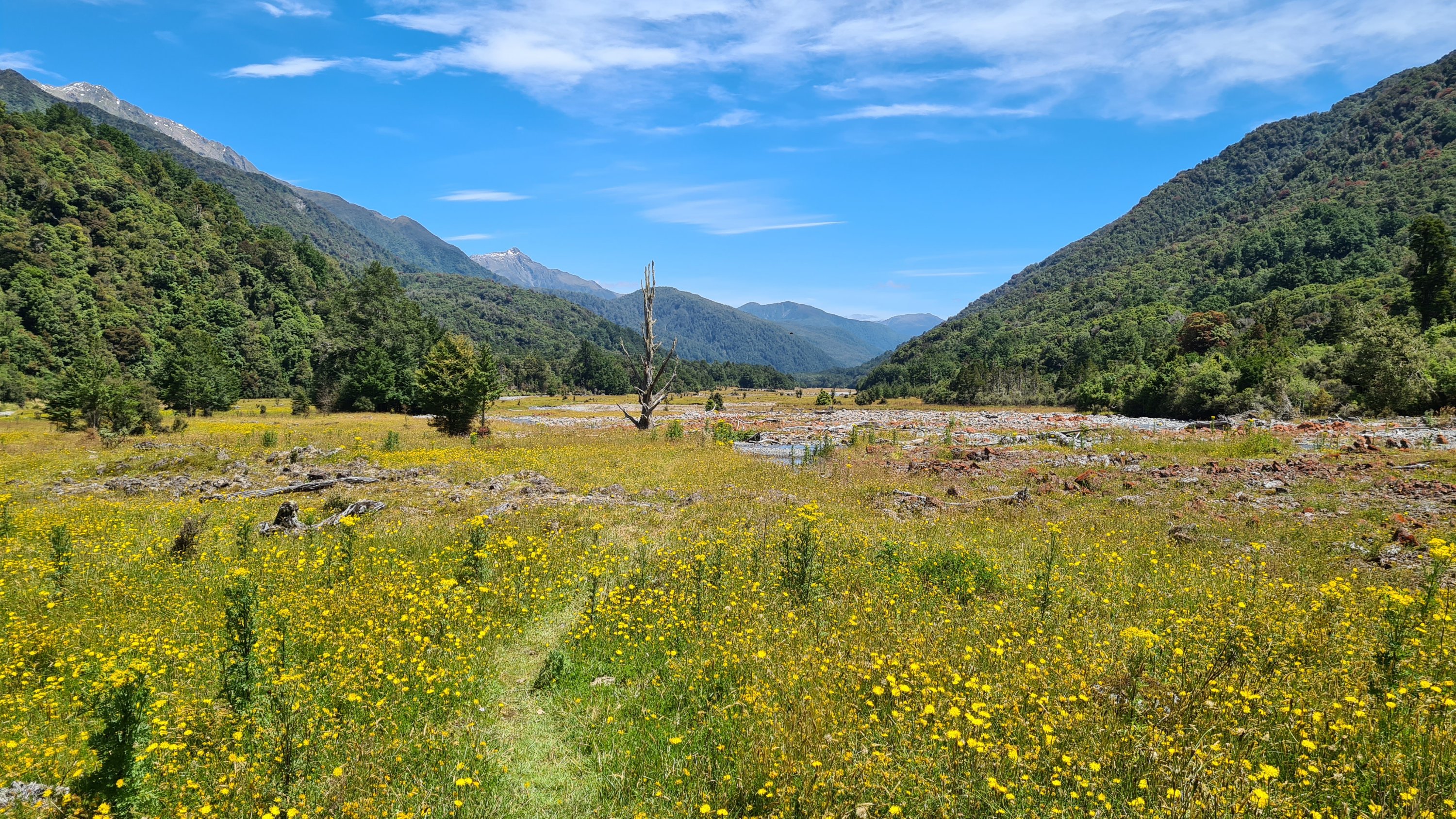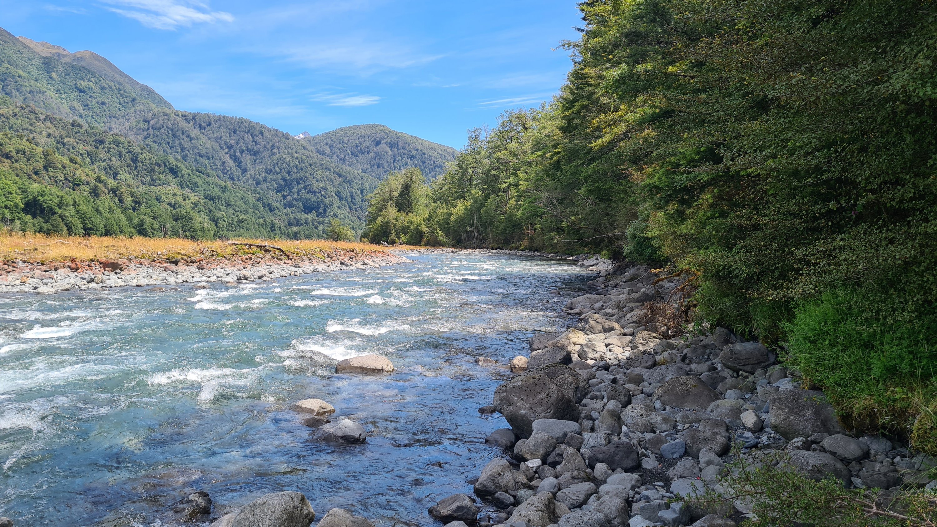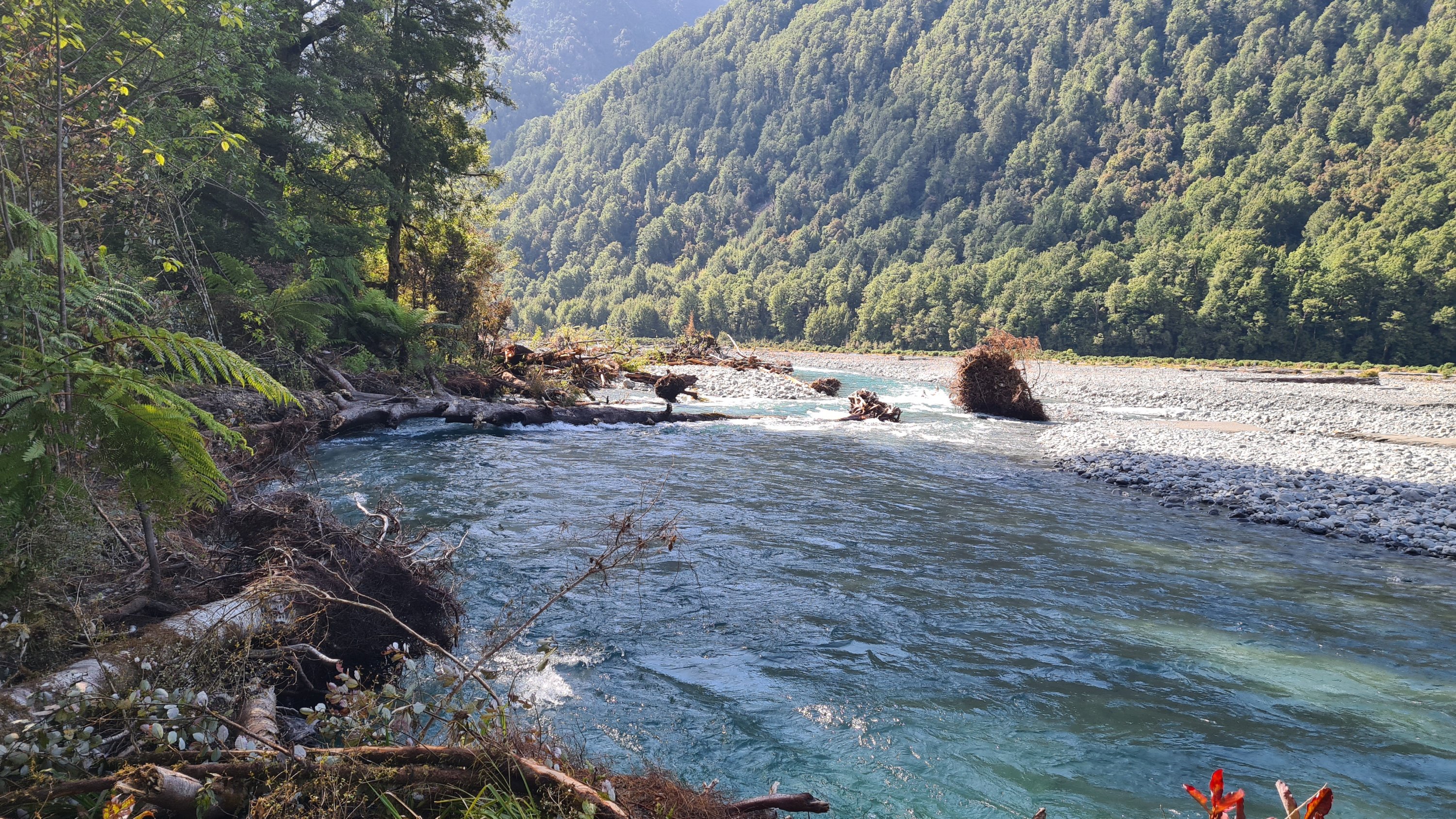 We stopped at Locke Stream hut for lunch and then continued on down the valley. We crossed the Taramakau and then followed the true right side down for several kilometers on open flats and dry river beds. There were dozens of streams coming down from the hills that we crossed and drank from as the sun started to heat up. We stopped for another break at the junction to Kiwi Hut and checked our maps and identified a good place to camp on open grass flats and next to the river so we had water. We pushed on for another 7kms to get there but it was not an easy 7kms. We had to cross the Taramakau again and it was getting big down there. Where we were meant to cross was flowing too fast and deep so we walked upstream until we found a safer place to cross where the river split in two. We took our time studying the best way over before committing. The first braid was easy enough but we had to link up for the second part. The water was over my waist and moving fast. We held strong and moved well together. It was a real thrill and I was stoked when we got to the other side! I had been thinking about this crossing for a few days and I really got to put my river crossing skills to practice.