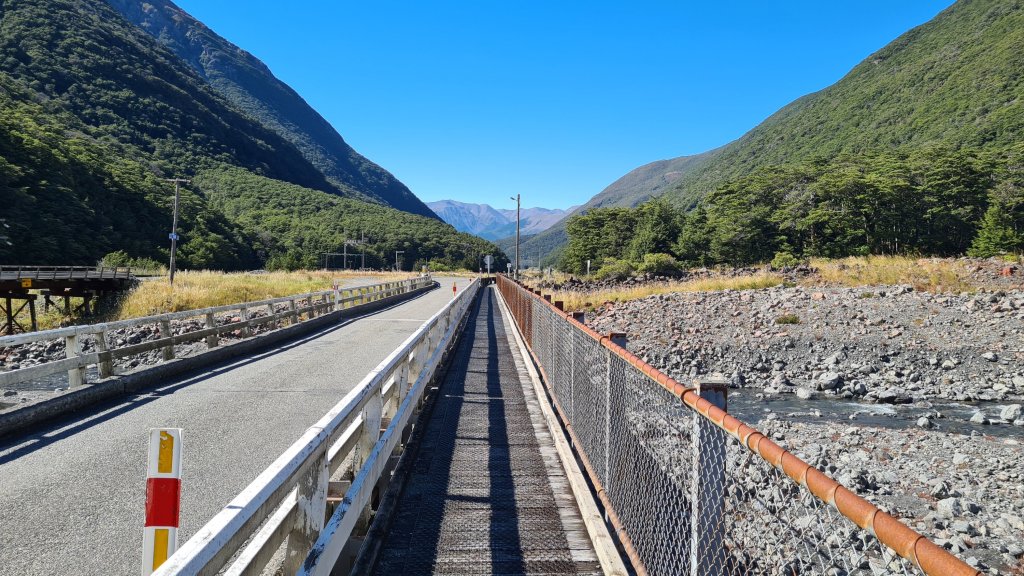 I was able to sleep in this morning and then didn’t leave the backpacker’s until 10am. I had a coffee and breakfast at the Cafe before leaving then took my time down the road. As I approached Klondyke Corner I could see the hill and saddle behind Bealey that I will be climbing over tomorrow. It is the first big climb since Waiau Pass. There was one long single lane bridge I had to run across. I arrived at Bealey Hotel not long after lunch and sat outside until I could check in. I put my washing on the waited for dad and Janeen to arrive.