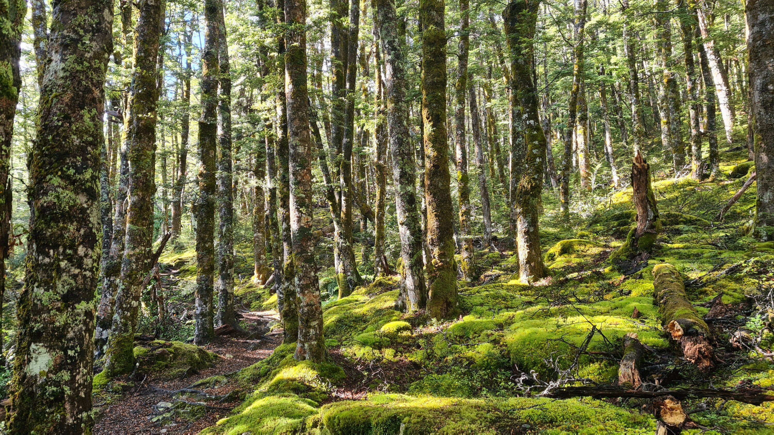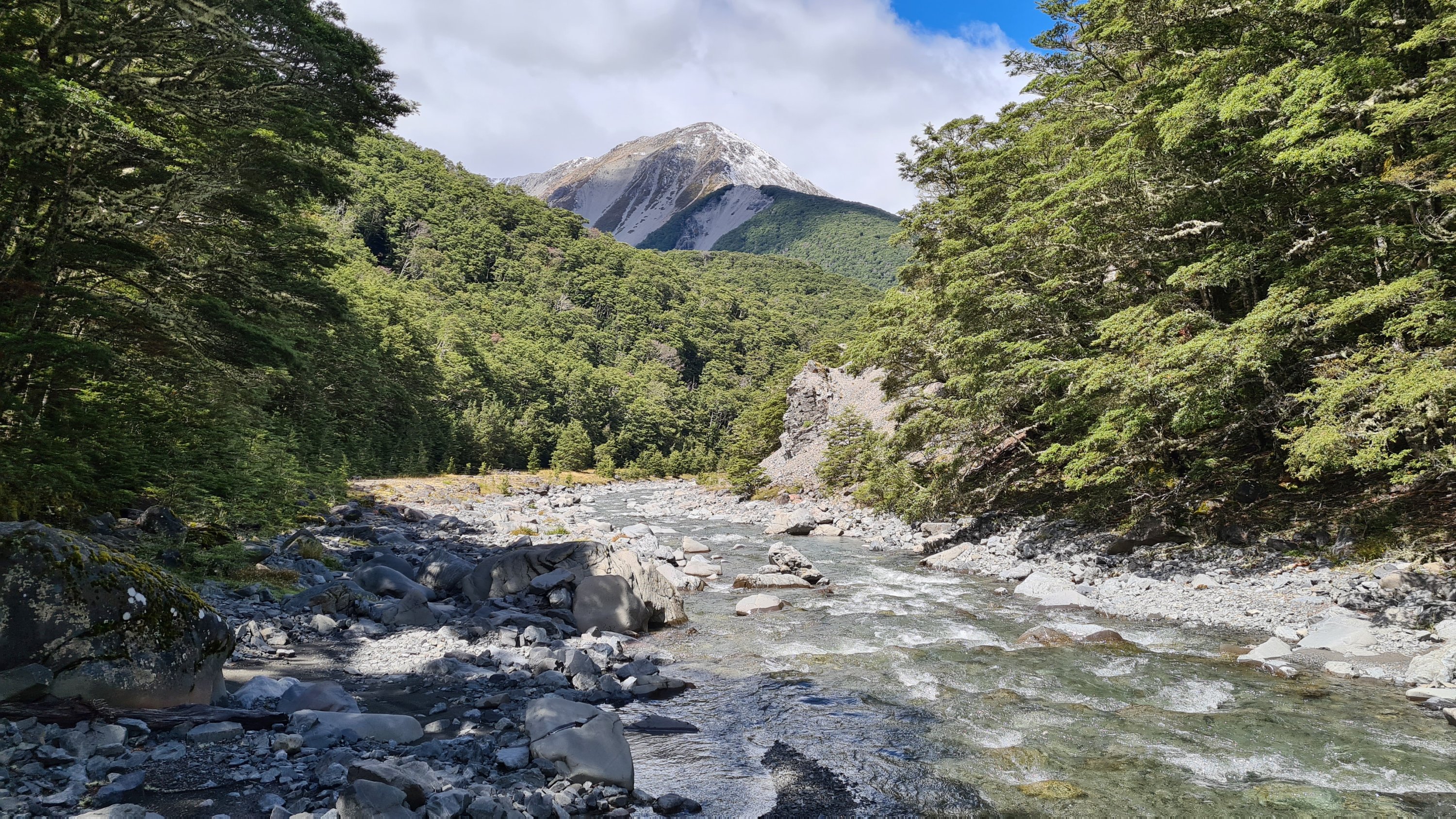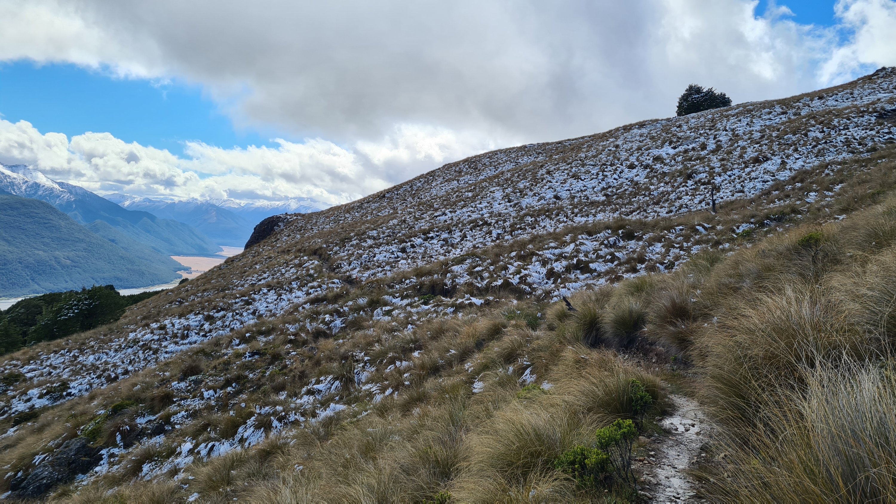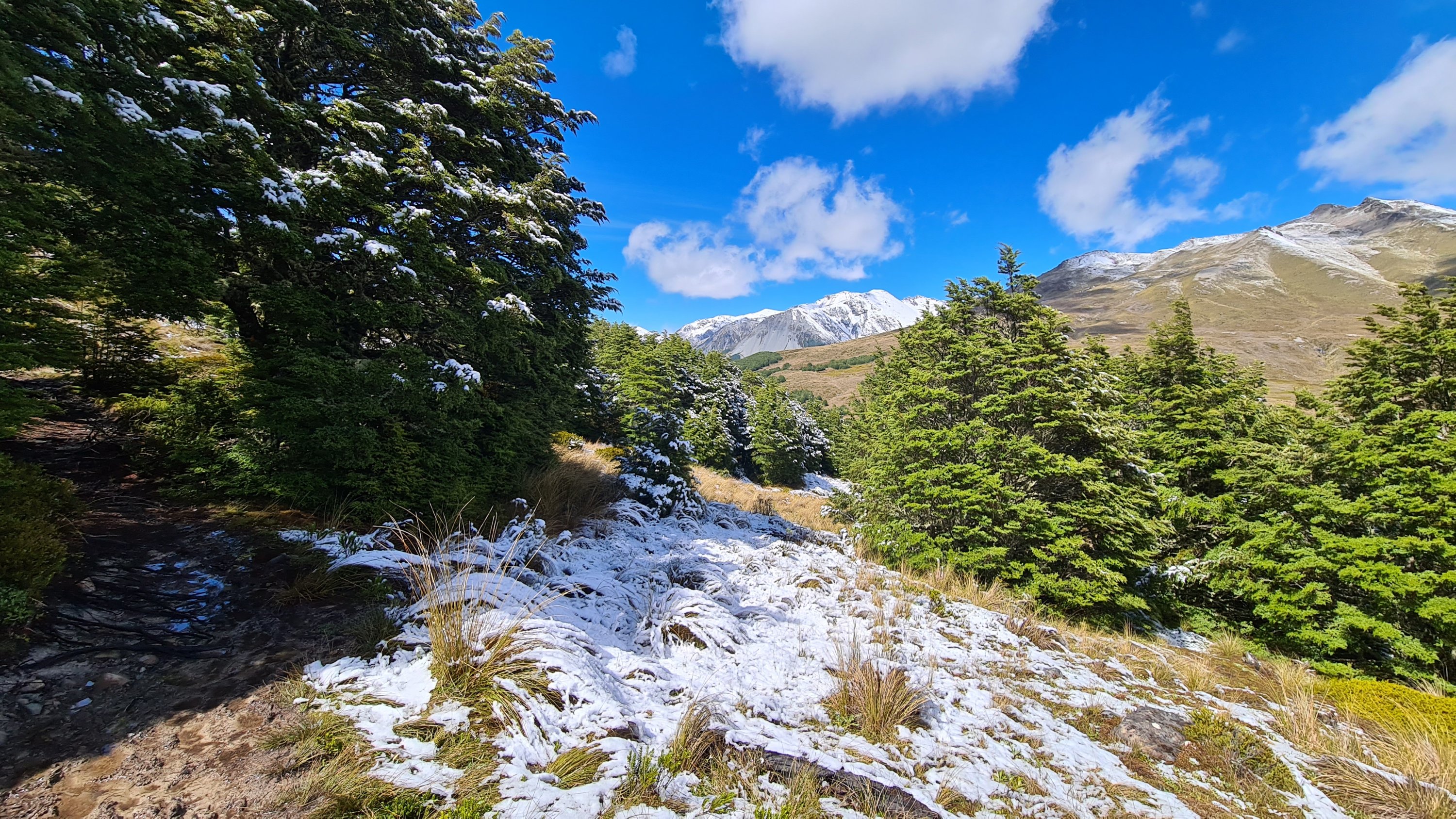There are good days and bad days on the trail. Most days are good. Then there are the occasional days like today that are really good! I enjoyed every moment of it. It was a nice walk down the road to warm up my legs before a long but gradual climb up through beech forest and open tussock around the north face of Mt Bruce and then over Lagoon Saddle. The air was crisp after a good dusting of snow last night on the tops. I reached the snow level at around 1200m elevation. I didn’t think I would get up high enough today. It is weird being in snow at this time of year. It was really beautiful and I had a great view over the valley and back up to Arthur’s Pass. From the saddle I was looking south to the Grey Range and Craigeburn Range.