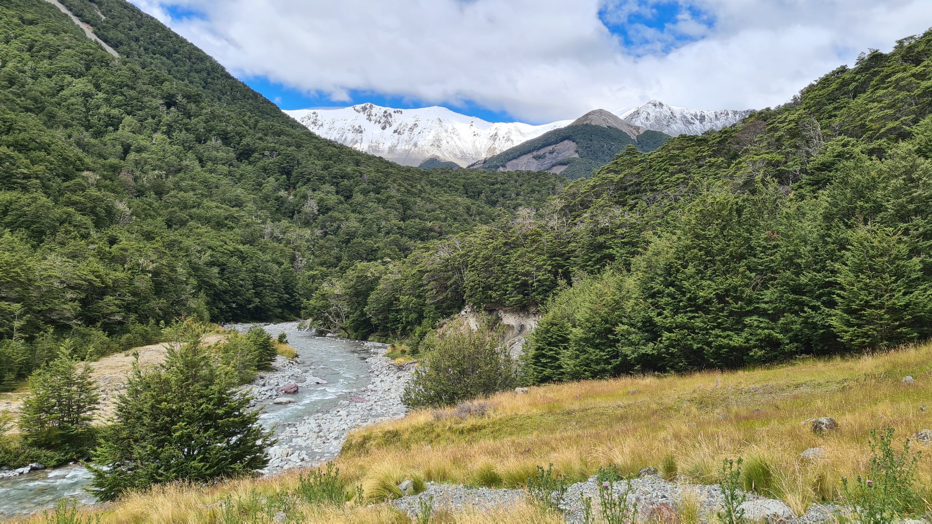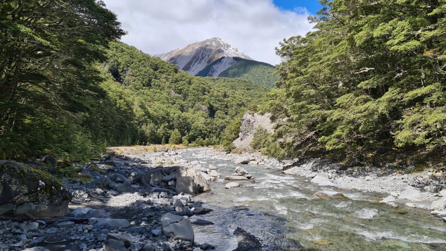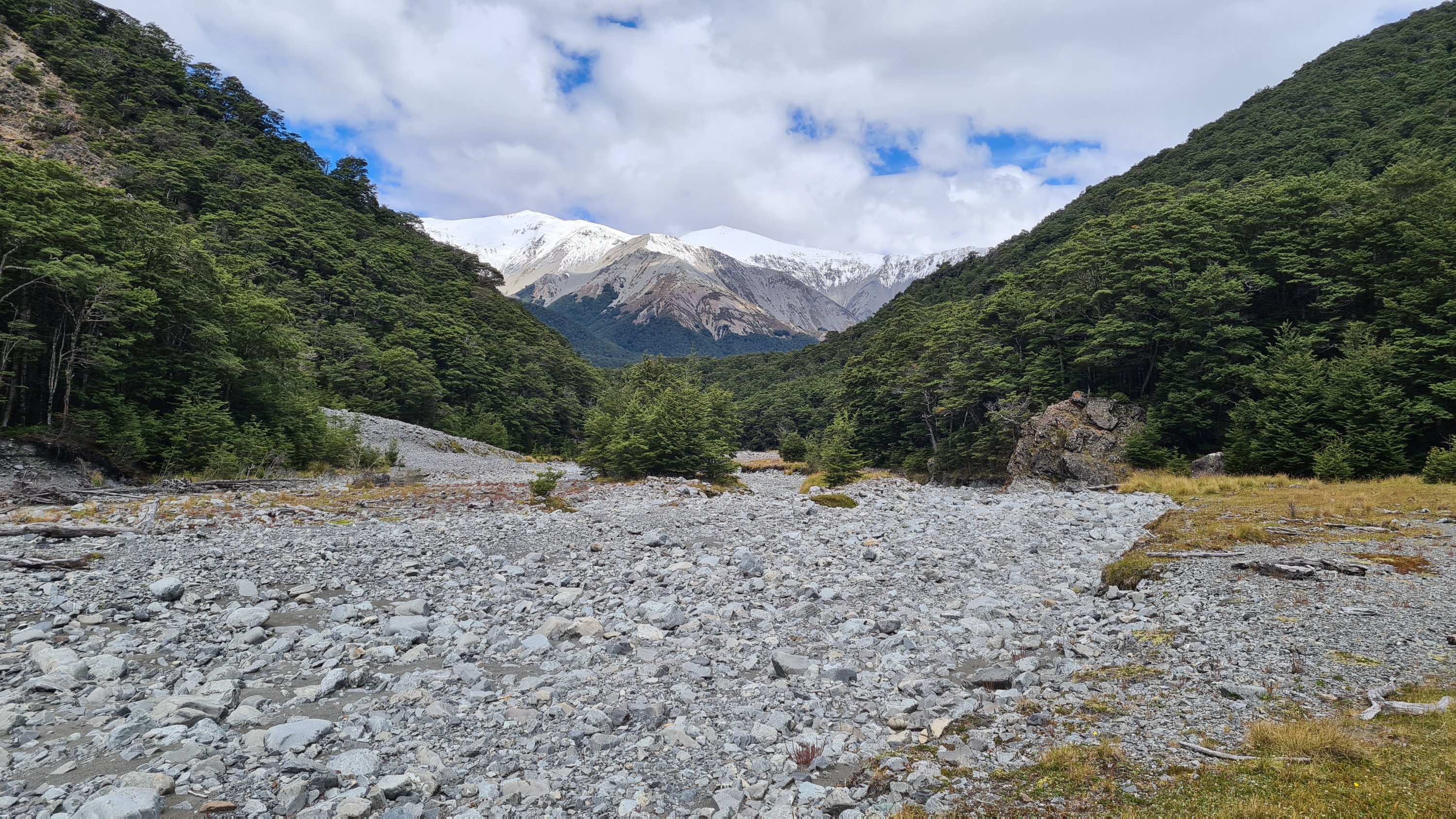 The track descended down a valley following the Harper River. The snow was melting fast and the river was icy blue. I crossed it a few times. Wet clumps of snow were dropping from branches around me. The track was an easy tramping grade. It was mostly bush but at times I was following cairns down the river bed. The view down the valley was changing constantly every time I came around a bend in the river. I passed three huts before arriving at Hamilton Hut around 4pm.