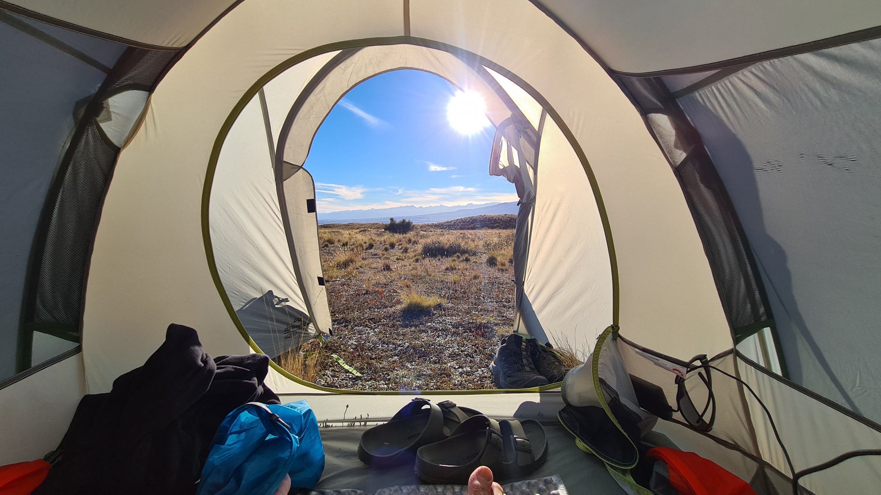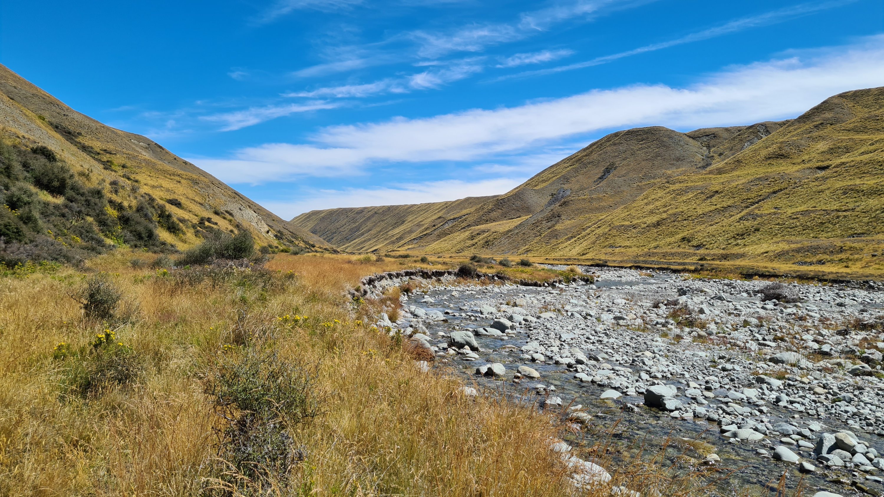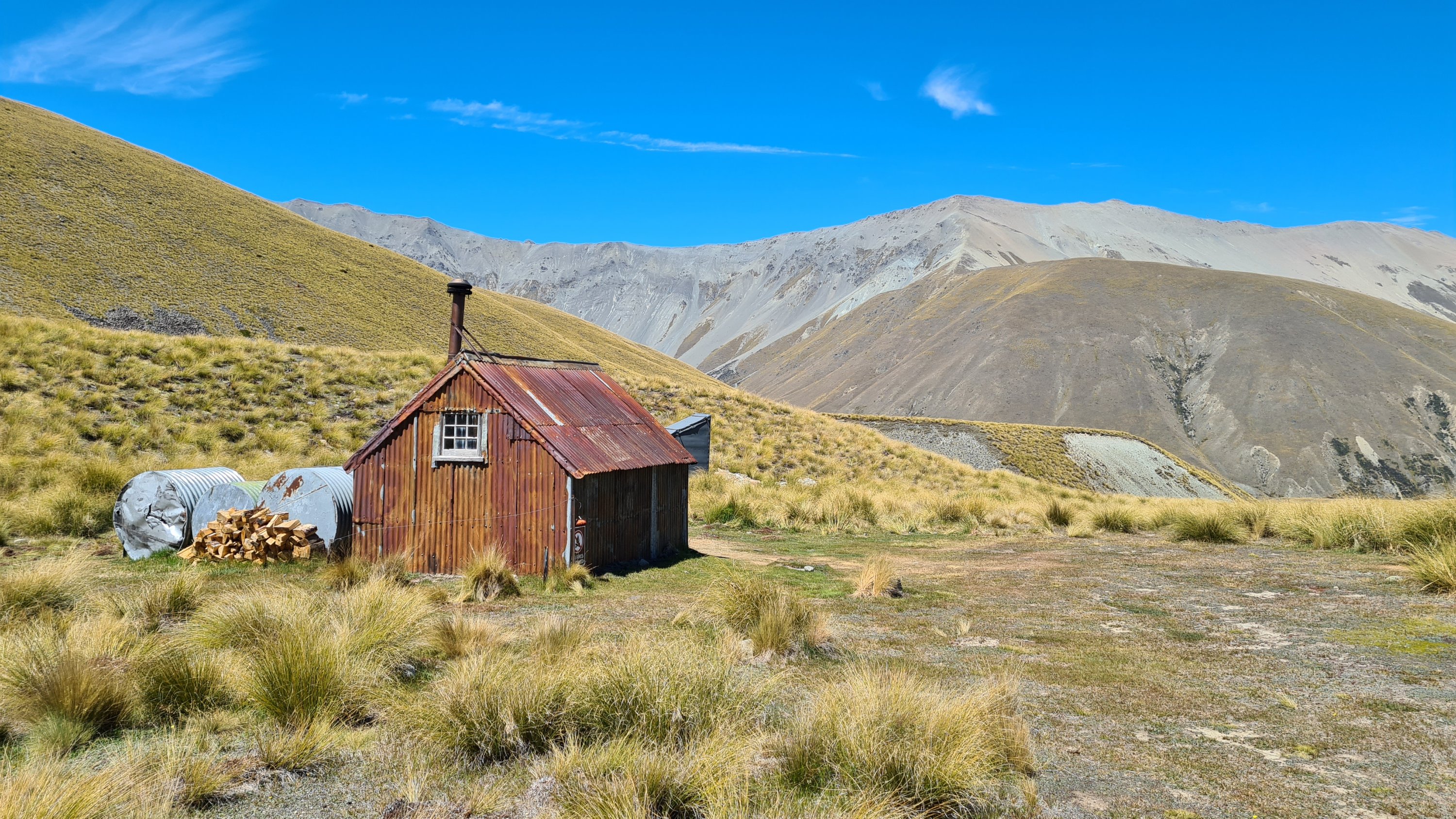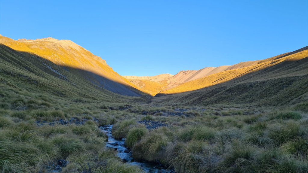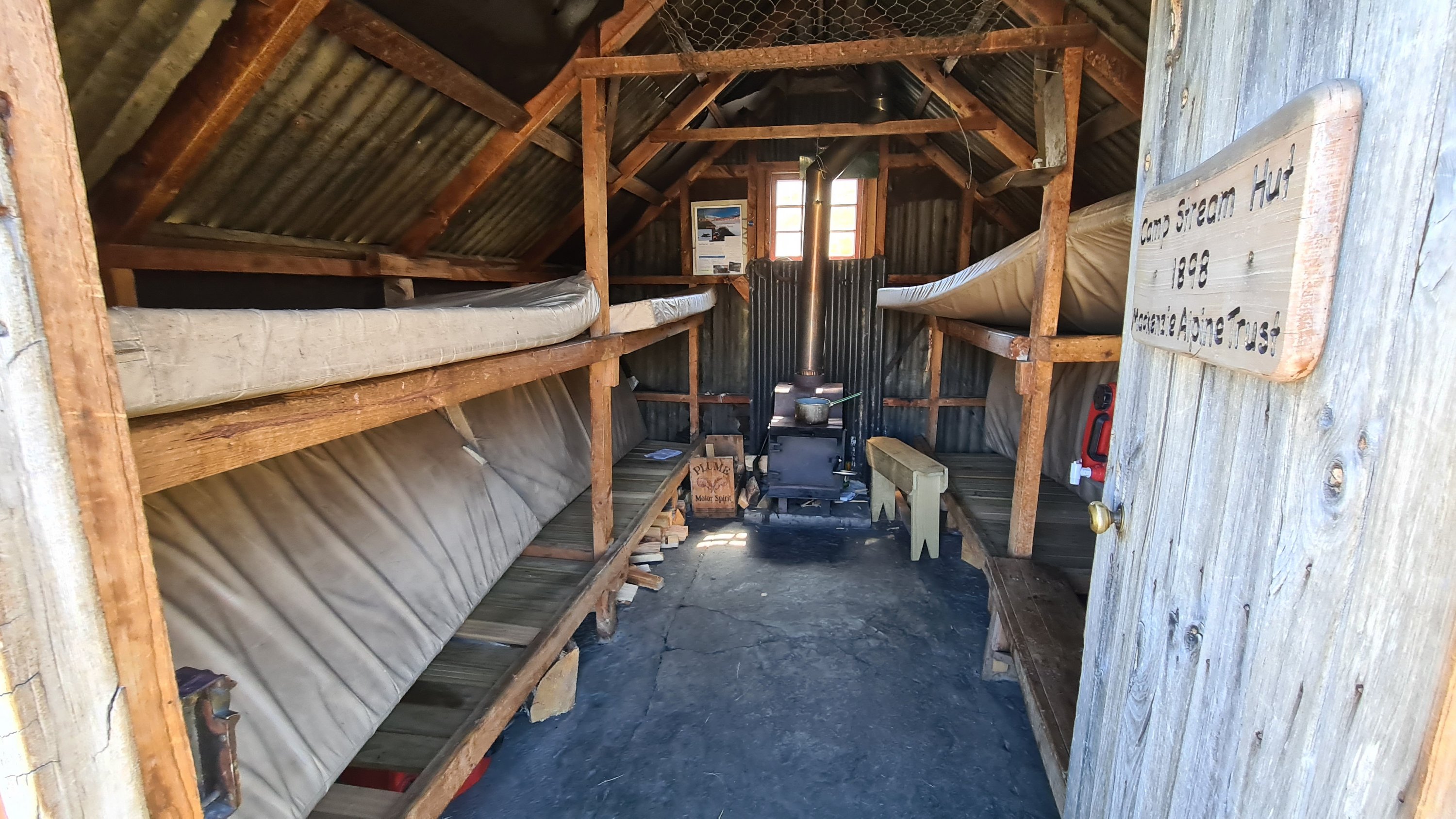 We dropped down into a gorge and stopped at Camp Stream Hut for a break. A very old hut with a reputation for mice infestation. I wouldn’t stay there unless I had to. Then we had a steep climb out of the gorge before coming out at the Roundhill Ski Area. We crossed the road and joined the Richmond track and walked another 4kms until we found a good stream to camp next to at around 5pm. It’s a great spot with views over the lake and ranges. Another day in paradise!