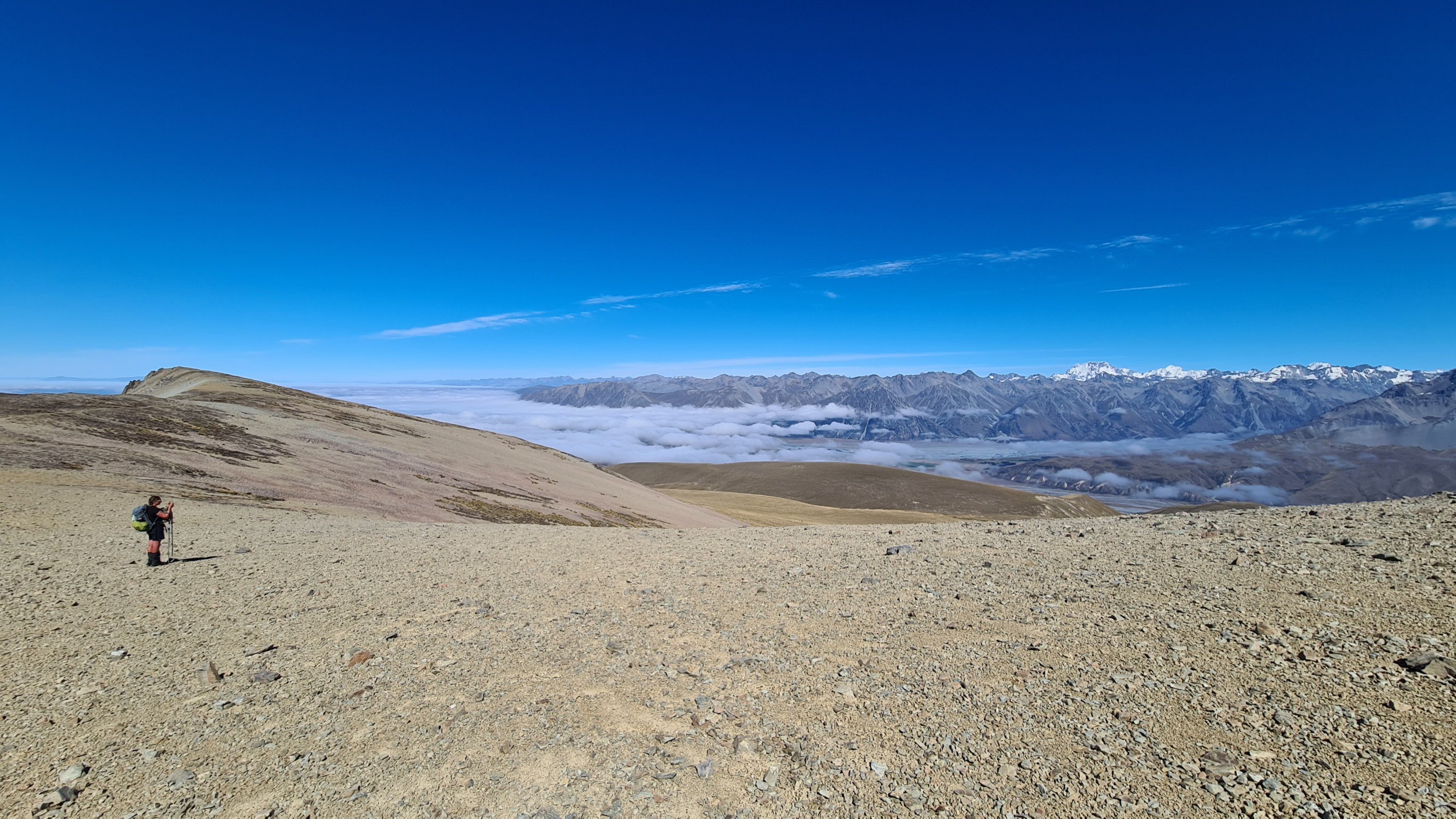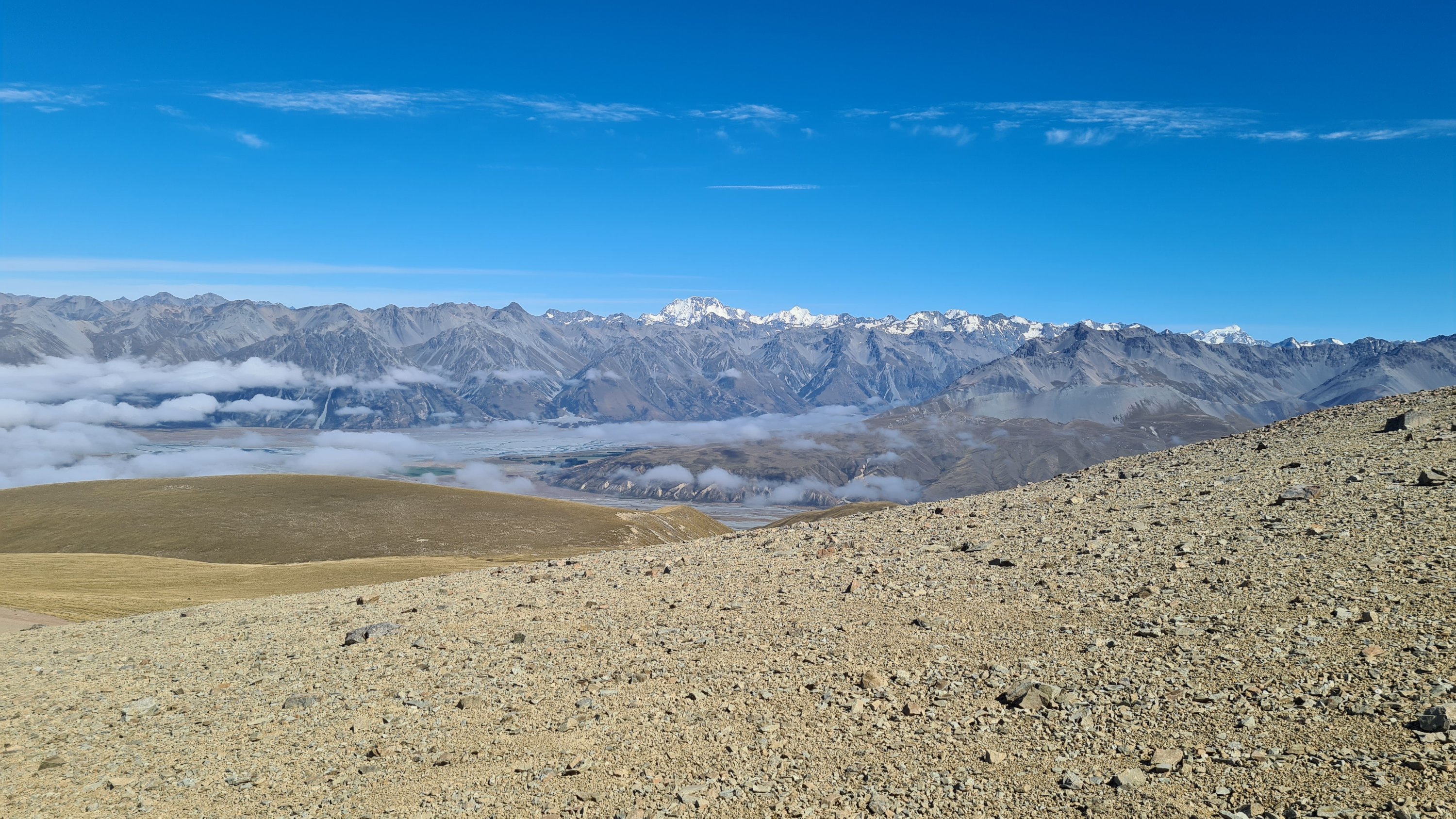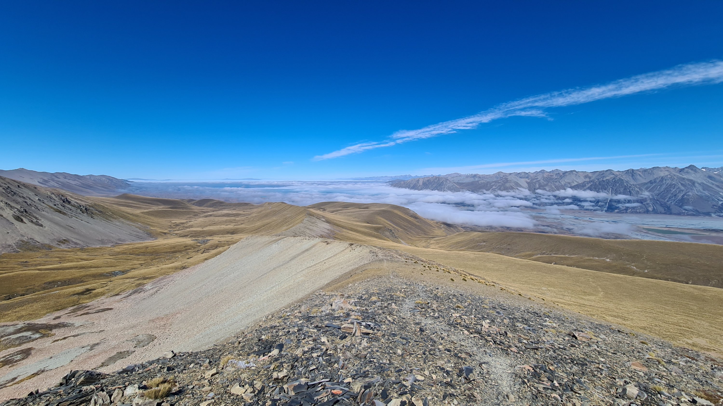 It was a long climb up to Stag Saddle, the highest point of the whole TA at 1925 meters above sea level. We were up there by 9am. From the saddle I was looking south down to Lake Tekapo but it was under a blanket of cloud at that time. That looked cool anyway. We sat up there for an hour and a half, soaking up the amazing views and drinking hot coffee.