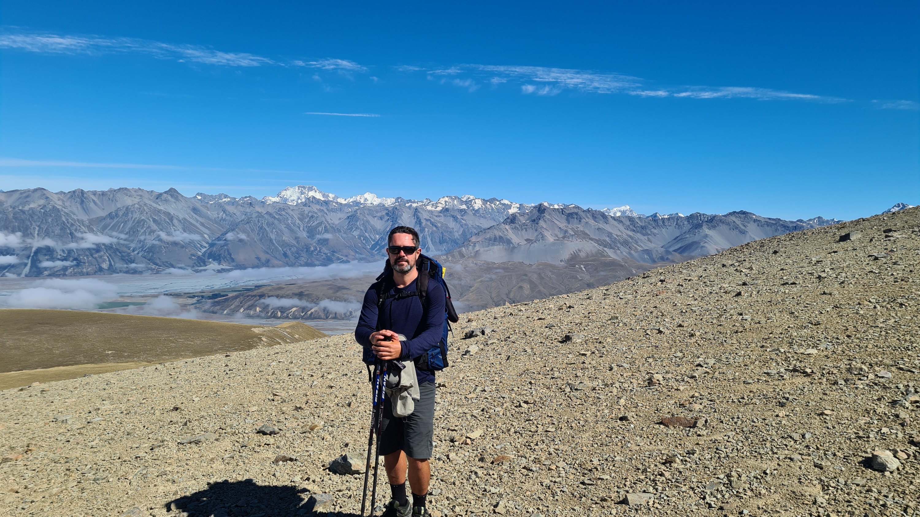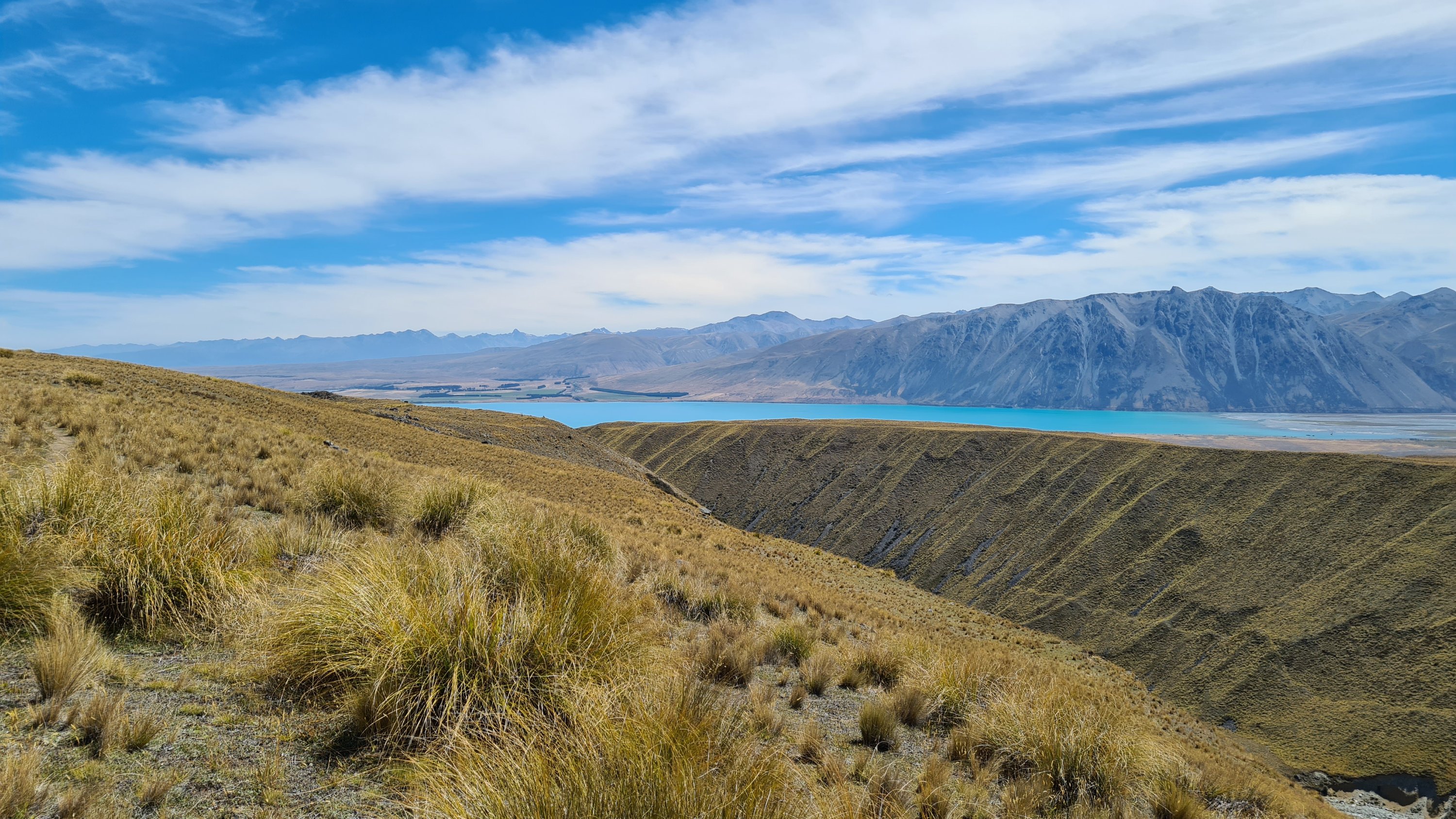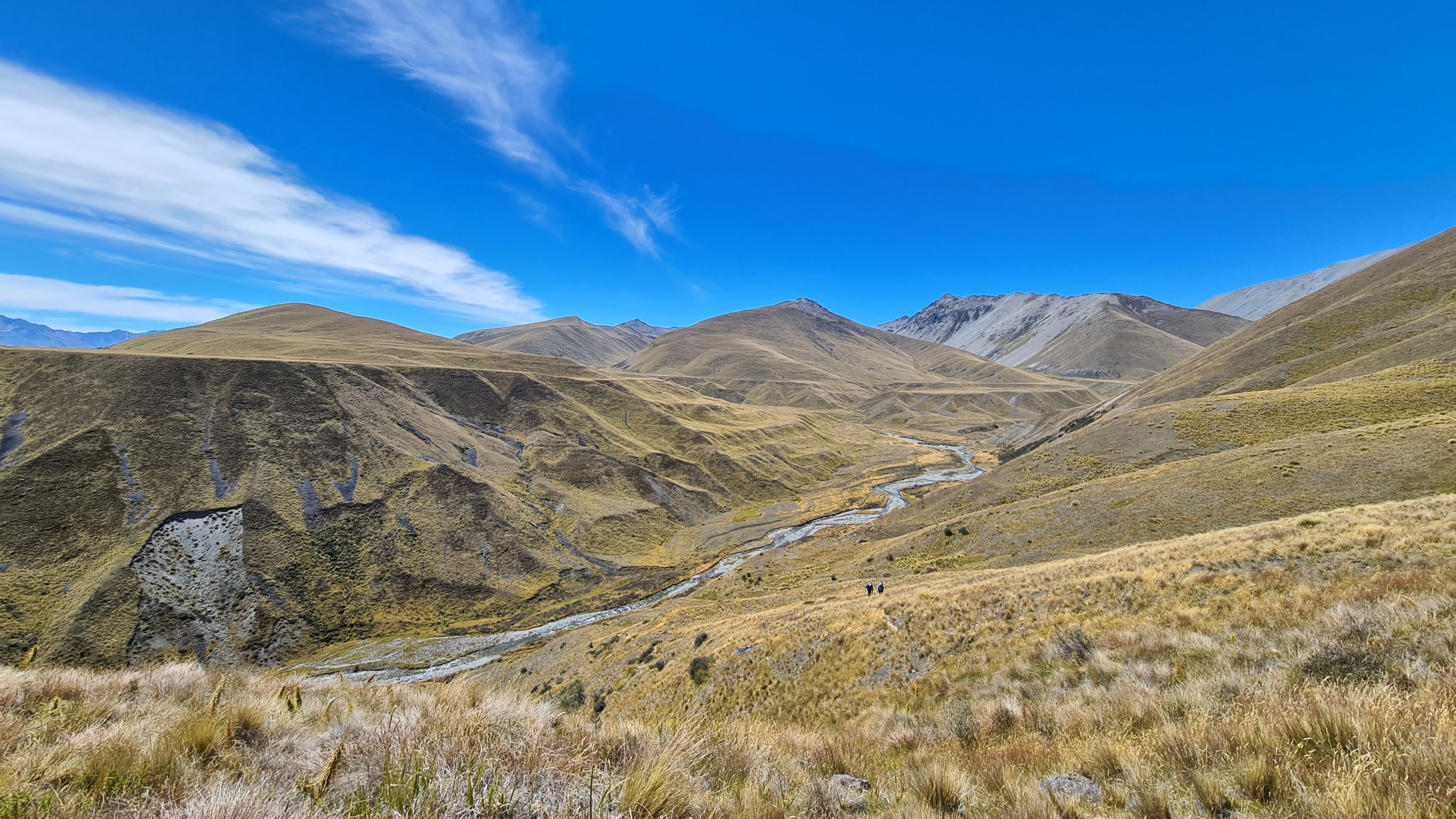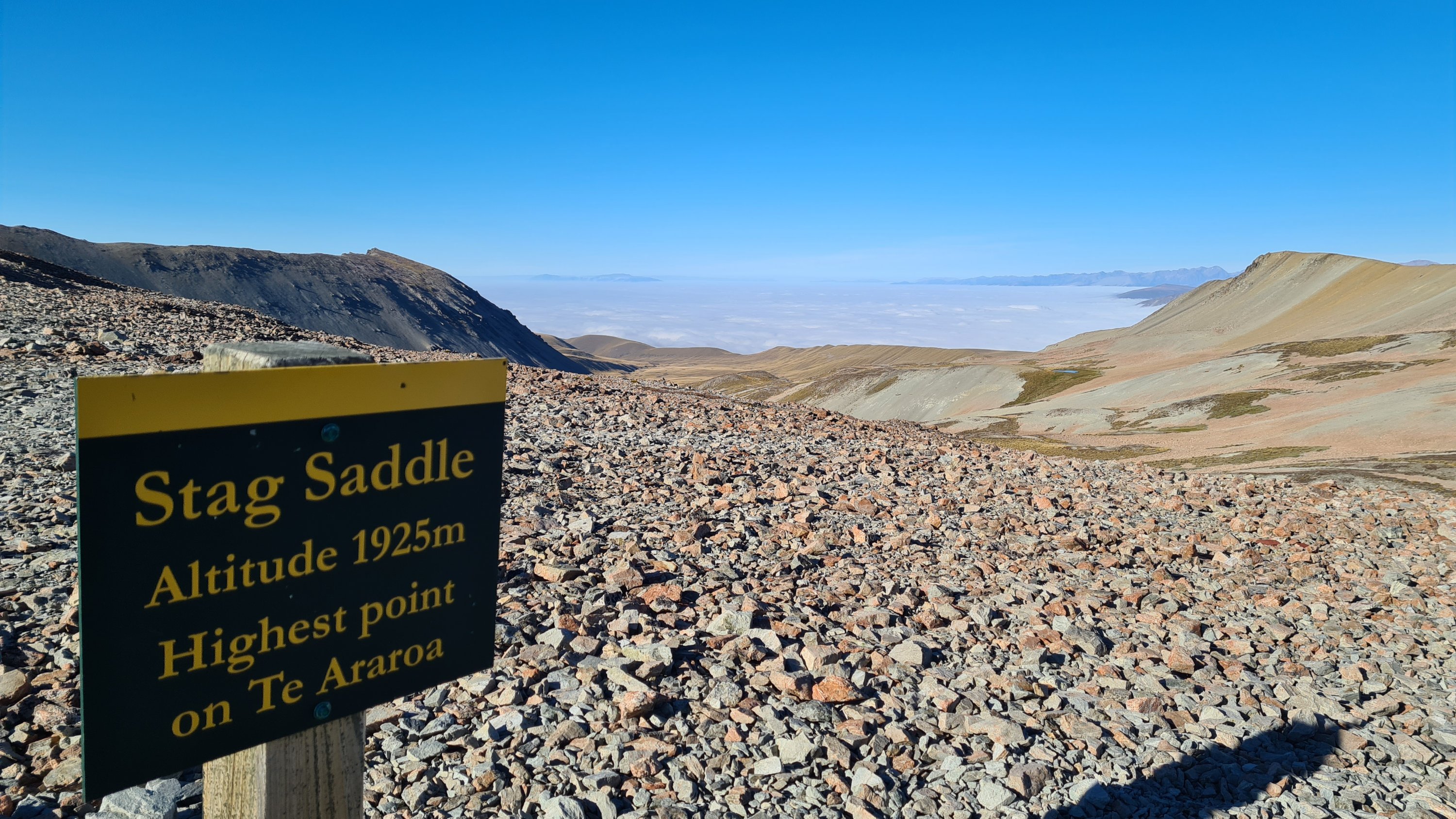 It was a long climb up to Stag Saddle, the highest point of the whole TA at 1925 meters above sea level. We were up there by 9am. From the saddle I was looking south down to Lake Tekapo but it was under a blanket of cloud at that time. That looked cool anyway. We sat up there for an hour and a half, soaking up the amazing views and drinking hot coffee.