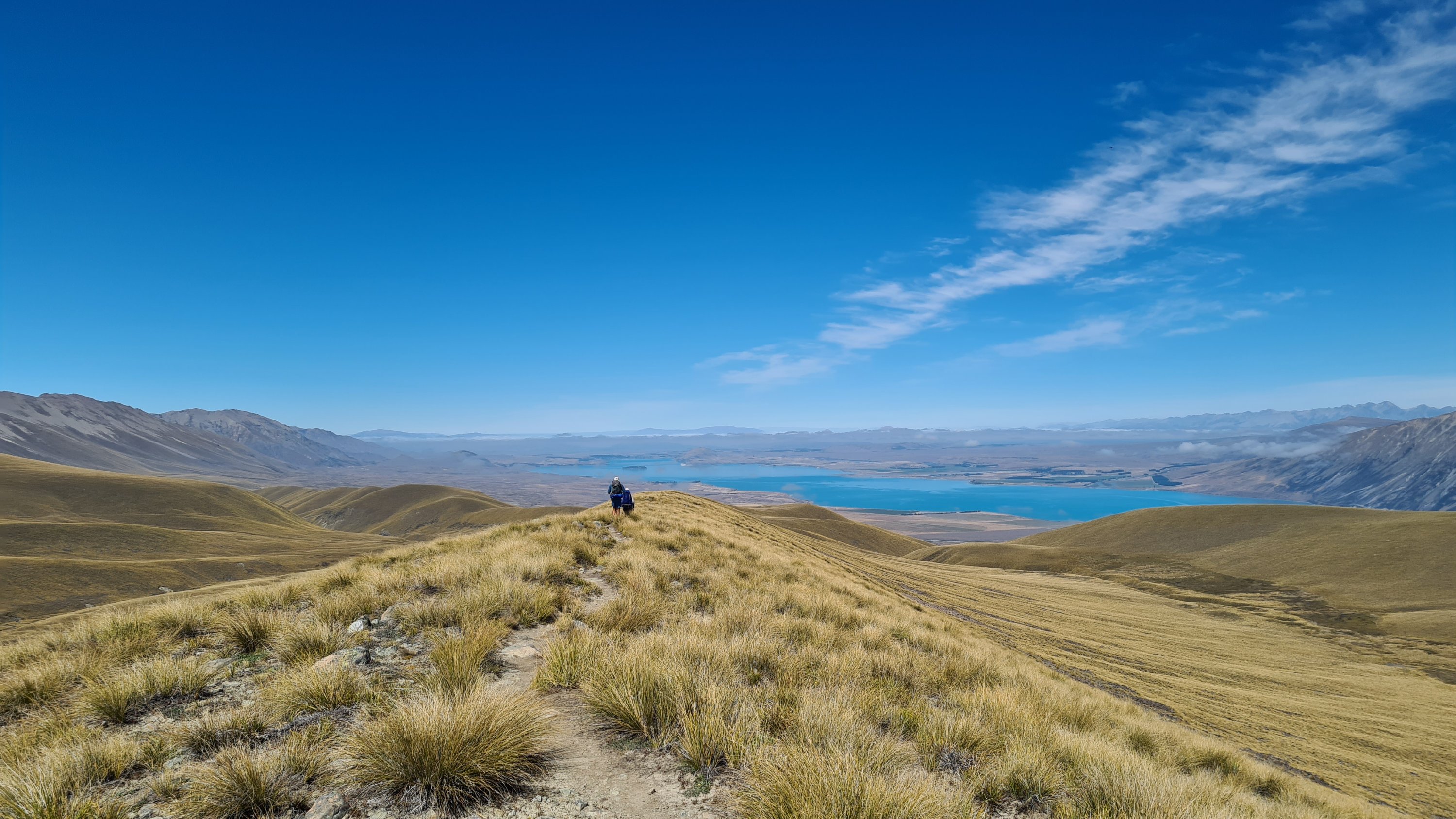 The cloud disappeared as we made our descent so we could see everything. It was the perfect day to be up there. We decided to take an alternative route down that we heard about, following the ridgeline to our right that merges with the TA at the bottom of the valley. We were so pleased we did as we had incredible views all the way down of the lake and across to Mt Cook.