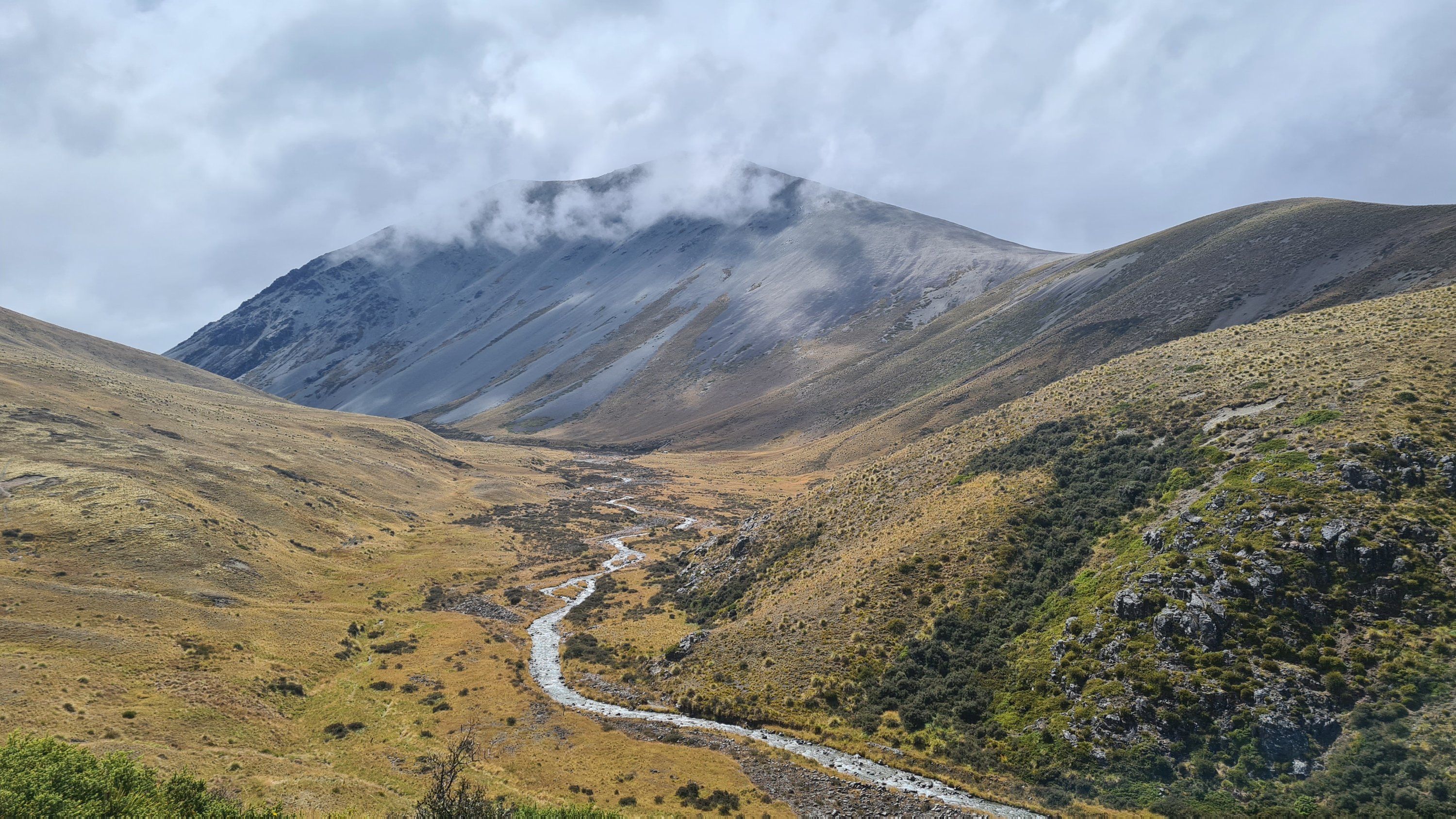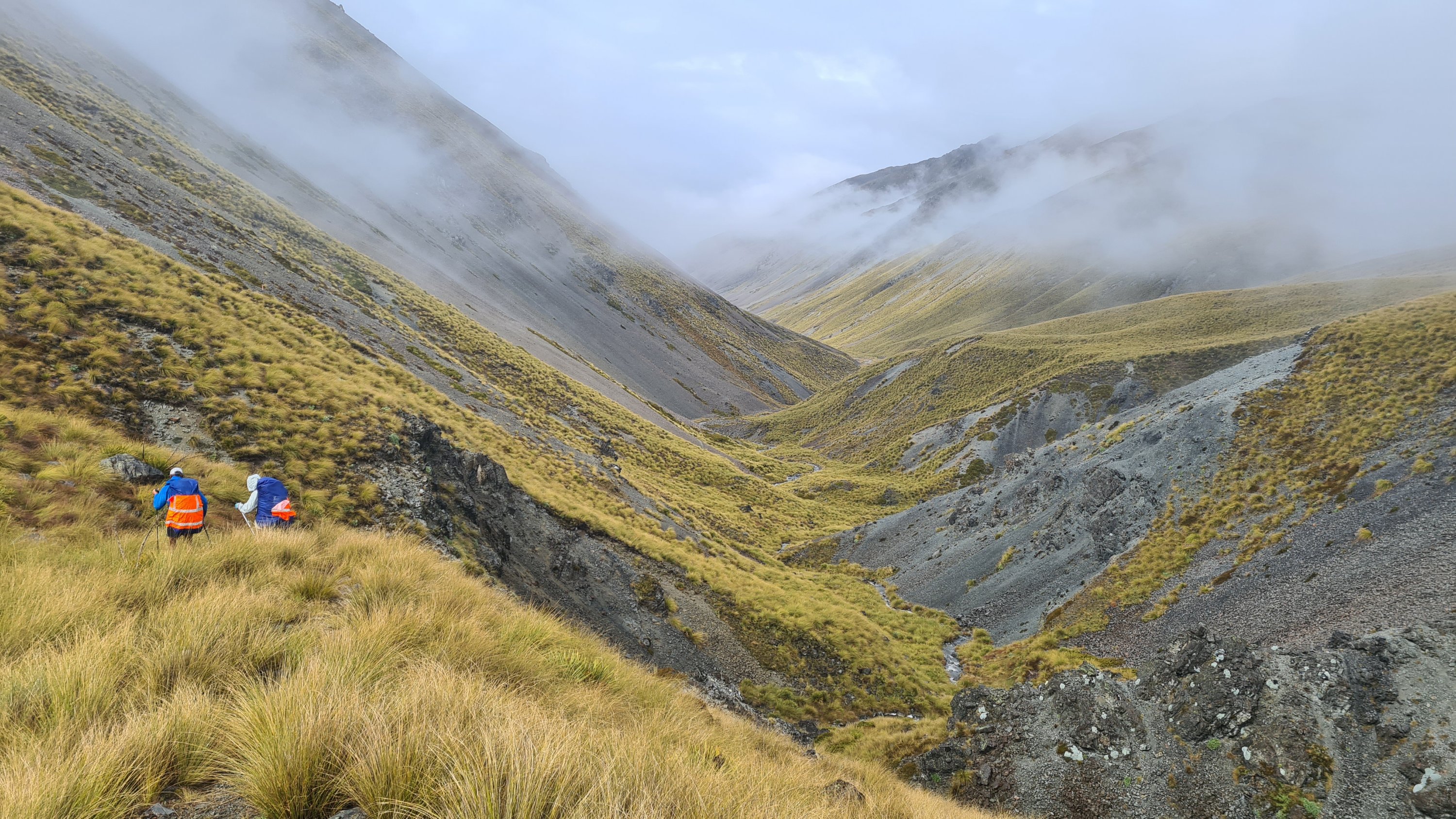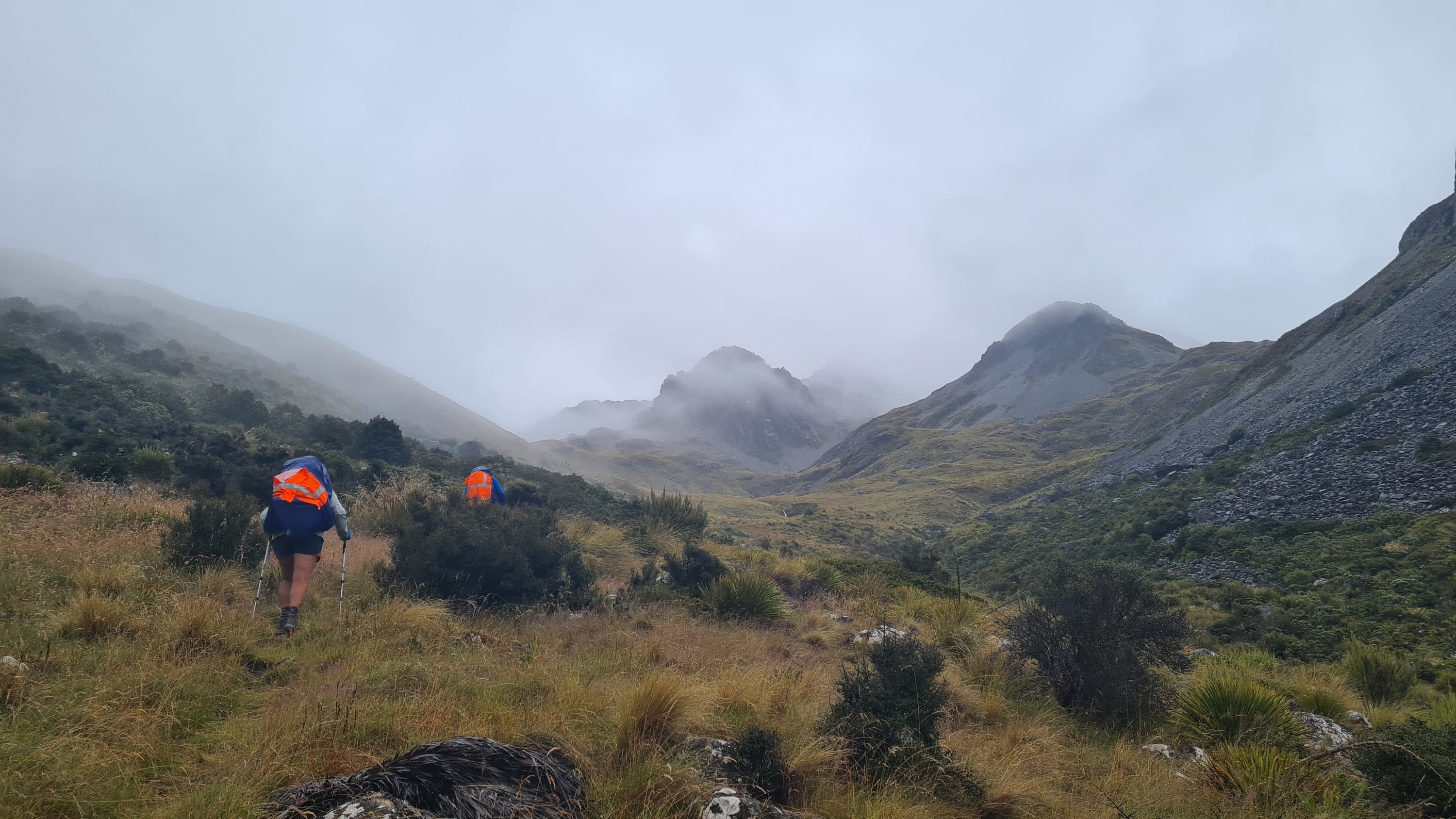 We walked a track up the true right of Freehold Creek through Beech forest to the top of the valley. It was a gradual up-hill walk. As we got higher the forest ended and openned up to tussock. It was beautiful up there with lots of waterfalls coming out from the mountains around us. We then climbed over a pass and descended down to the east branch of the Ahuriri River. We followed the river for another 15kms through tussock, swamp and at times siddling the bottom of scree banks. The weather was off and on, raining mostly and at times freezing cold. I was wearing my rain jacket and rain pants all day. We stopped for lunch next to the river when it looked it like it was starting to clear up. After about 10 minutes the clouds rolled into the valley again and the temperature plummeted. We got moving quickly again but my hands were so cold they went numb. It is amazing how quick temperatures change in these valleys.