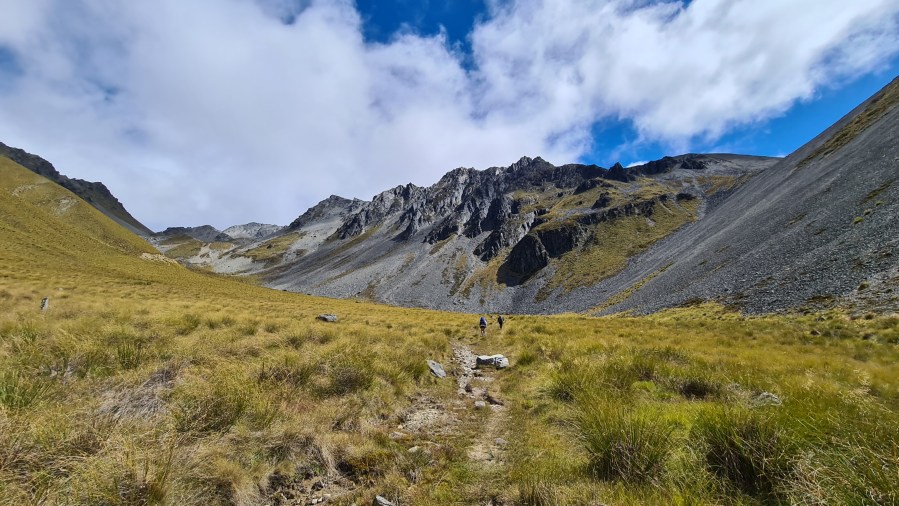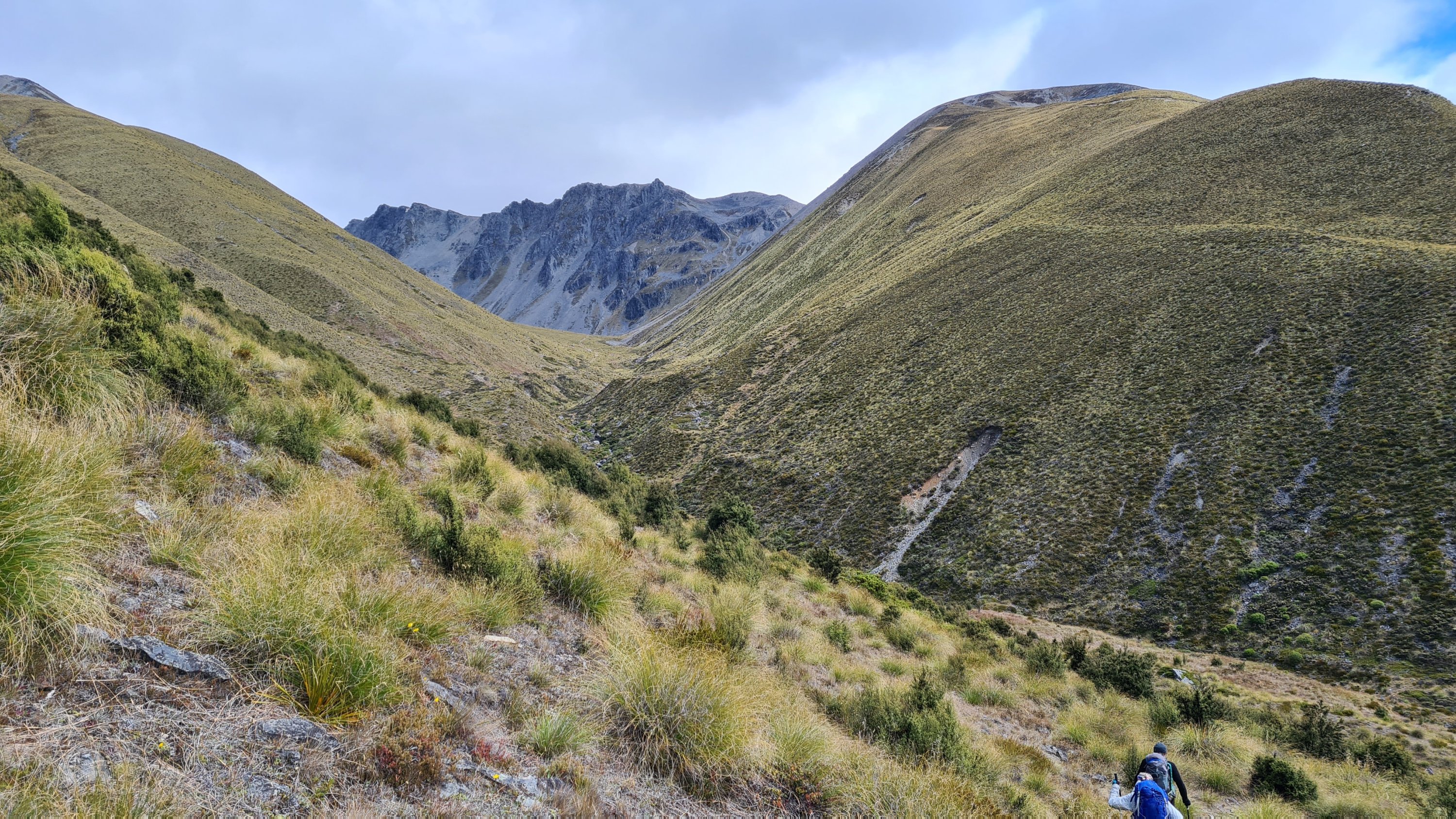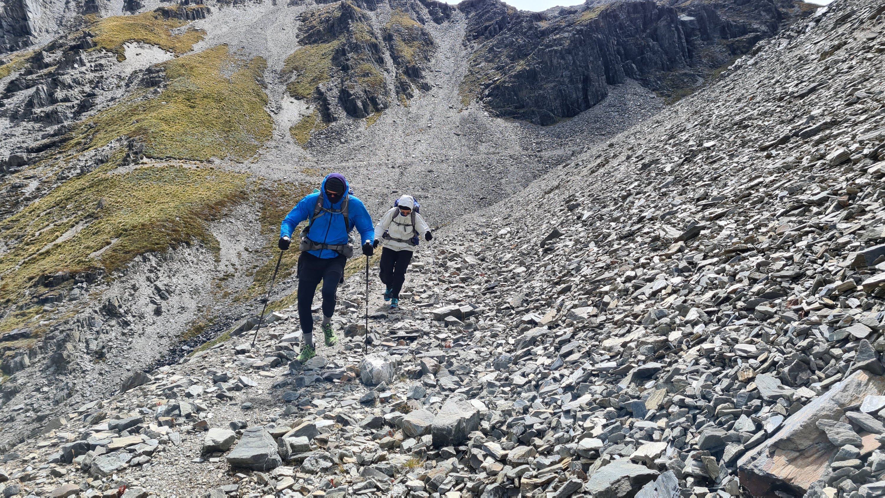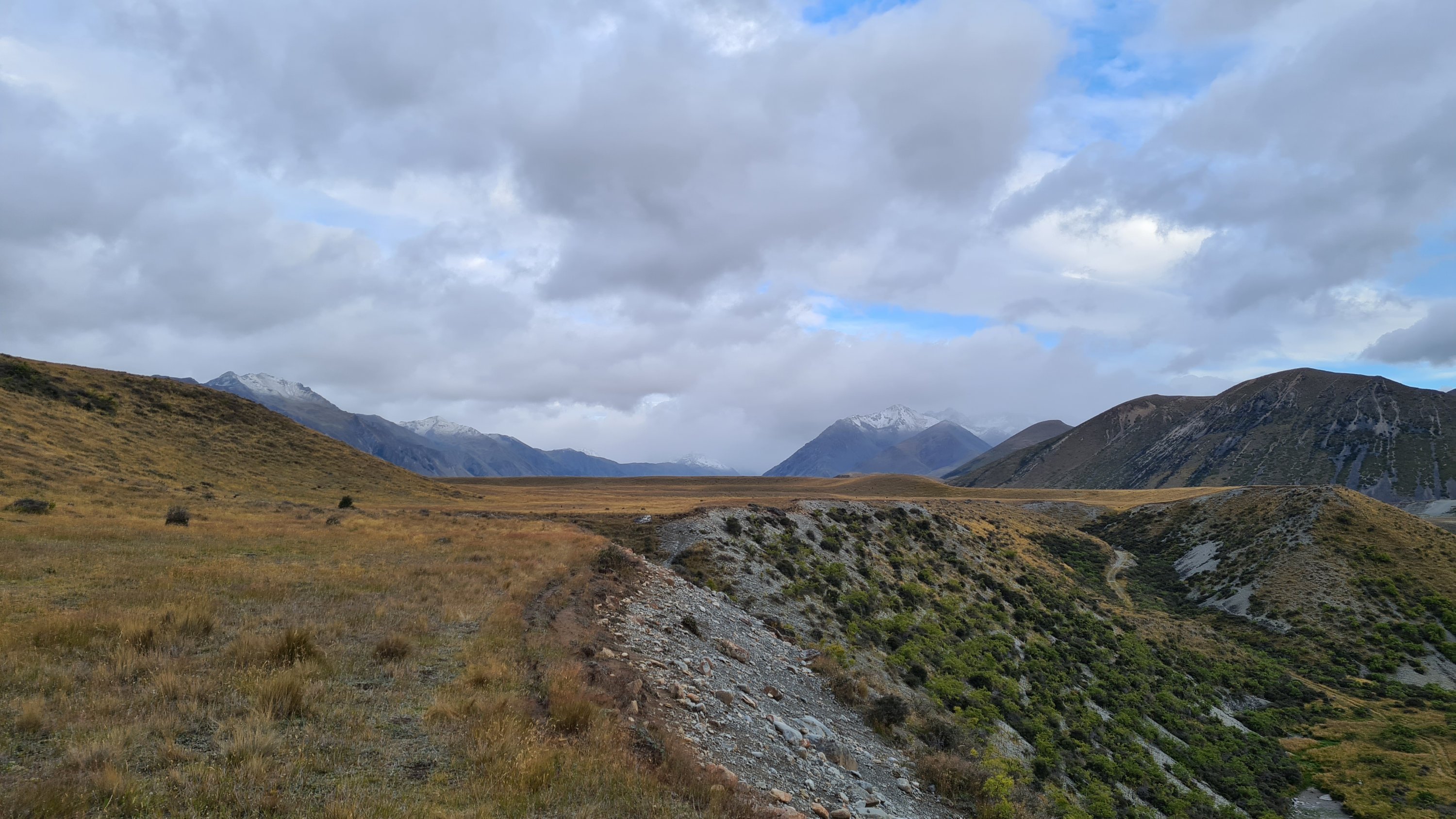 Scott is nursing a sore foot so we took it easy but kept going at a steady pace. The terrain was very rocky. The wind was still up and was getting stronger and colder as we got higher up. I was layered up with my goretex jacket and pants, beanie and neck gaiter for most of the day. The wind coming over the saddle was incredible. The weather was coming from that side of mountains so we were very exposed once we crossed over. The gusts were at least 80-100km/hr. Over the saddle the way down was a very steep scree slope to the bottom. Thankfully the track zig zagged down the face. On the way down at times the wind would hit you hard and you couldn’t walk through it so we were bracing ourselves until the gust died out. One time I was side on to the wind and it caught me and my pack and pushed me into the side of the mountain. I couldn’t stop myself.
