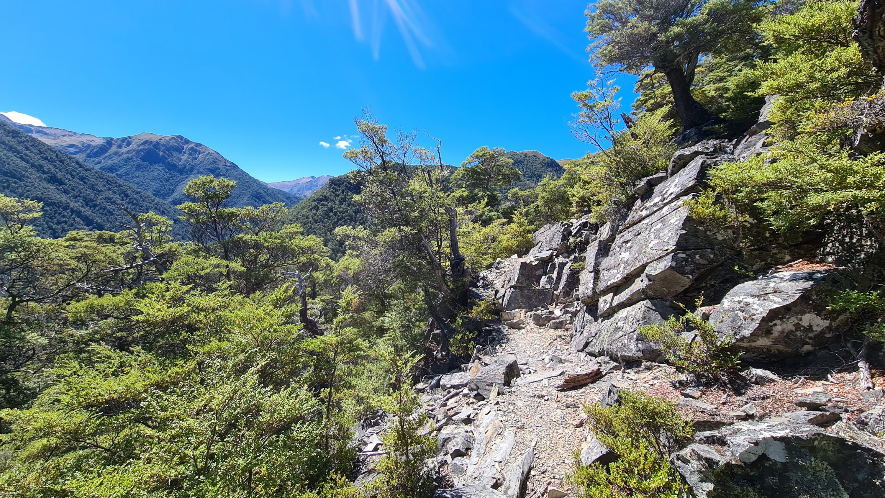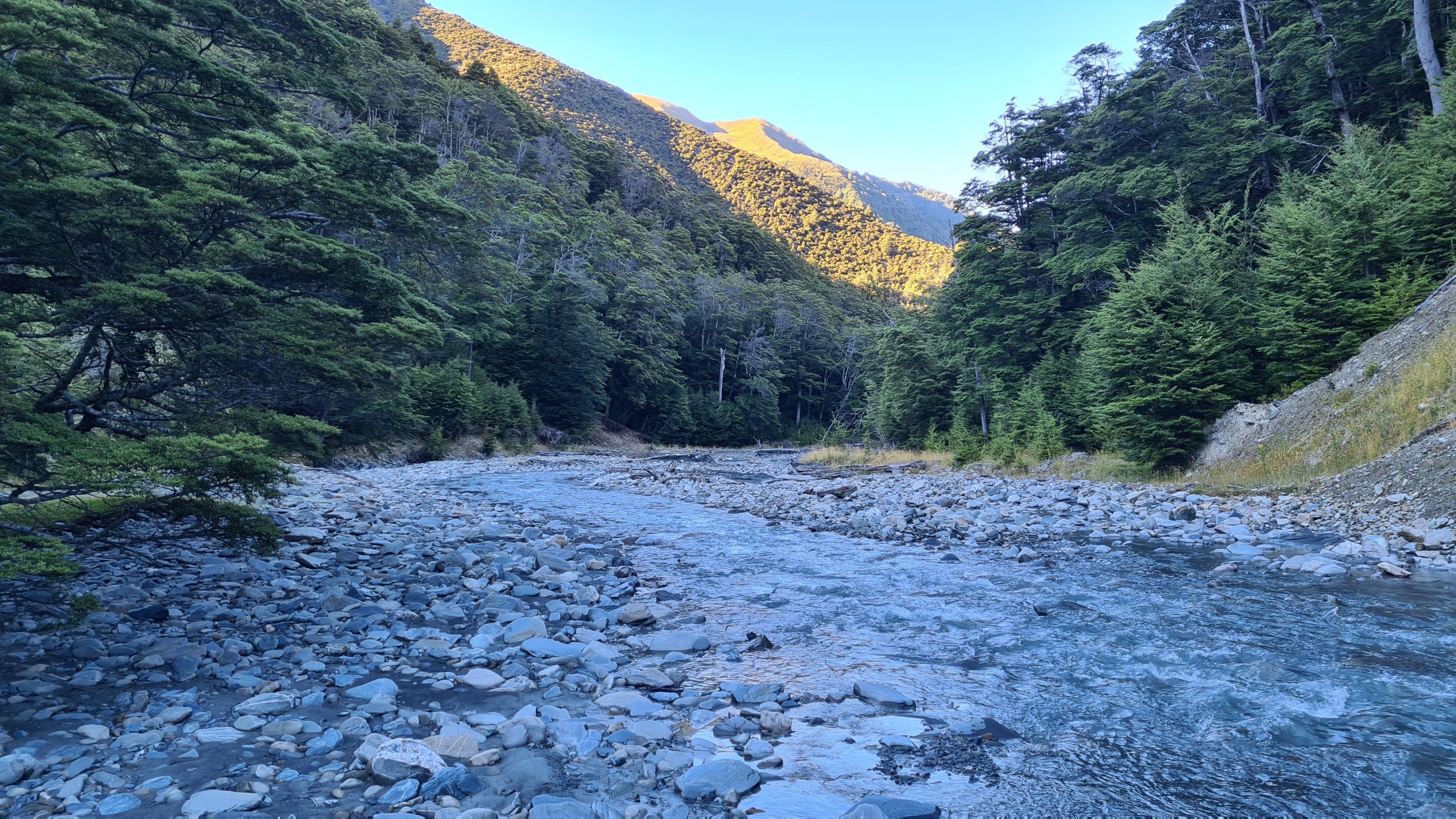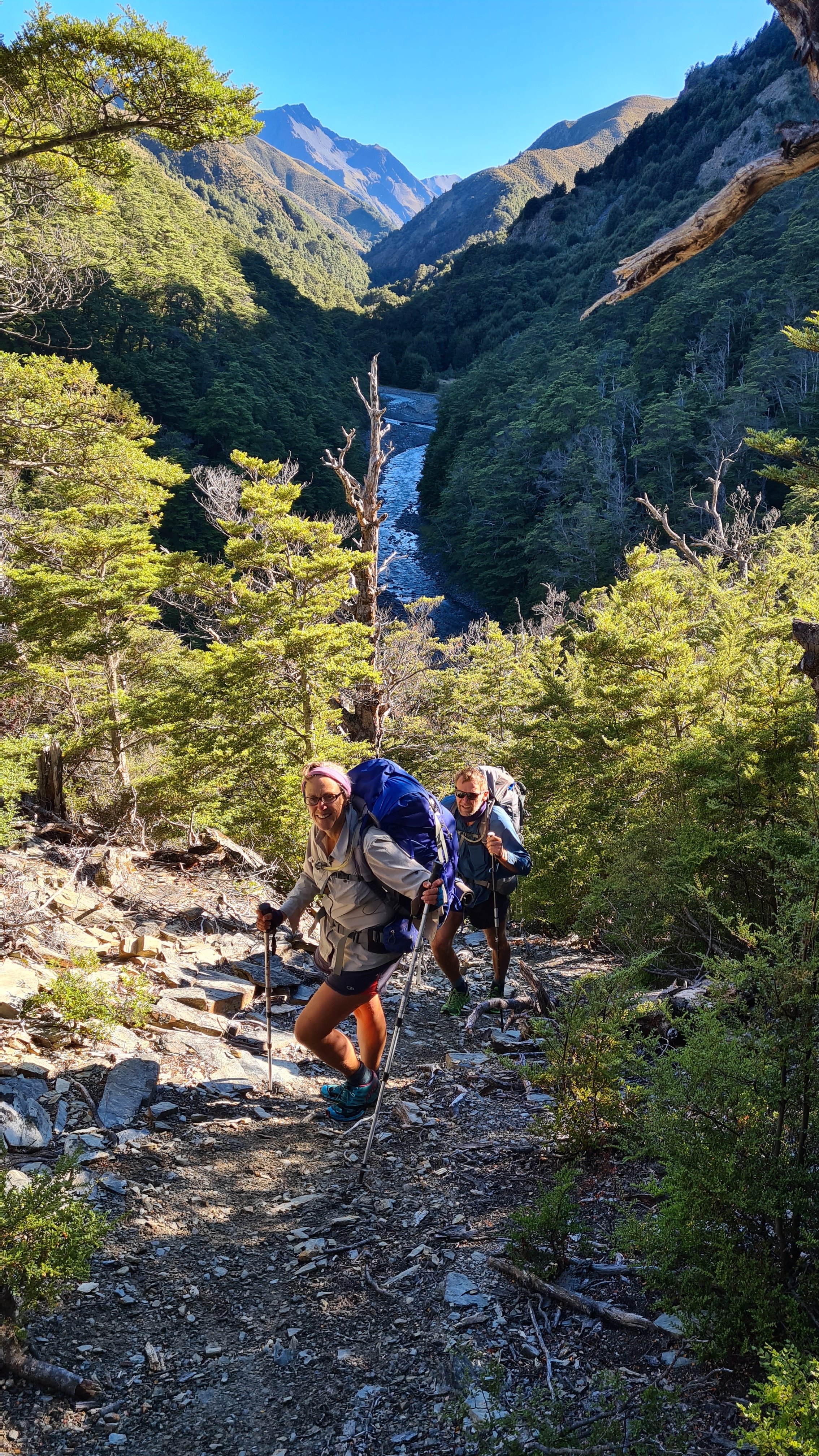 Today turned out to be much bigger than anticipated. We continued down the Timaru River for several kms. The track sidled the river bank through beech forest and was very narrow and high above the river in places. It was a challenging track that had lots of short and steep climbs. Along the bottom we crossed the river about eight times where and when it was required.