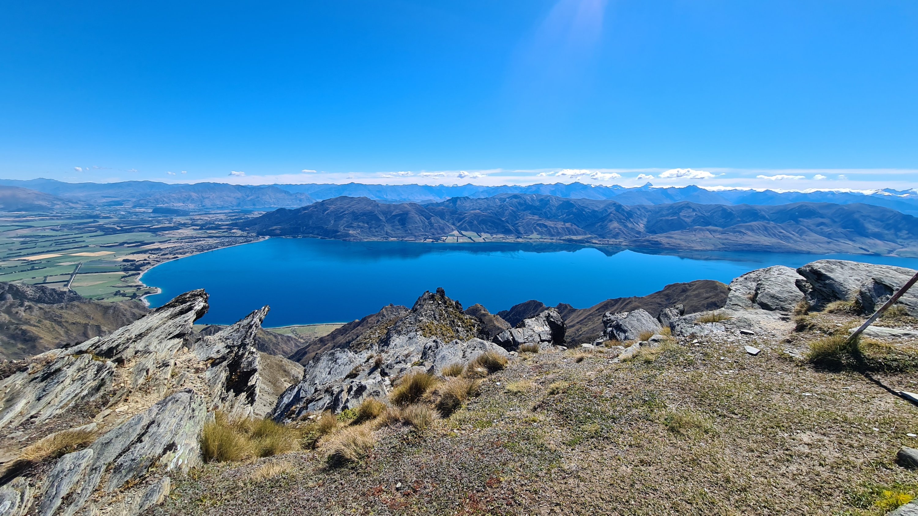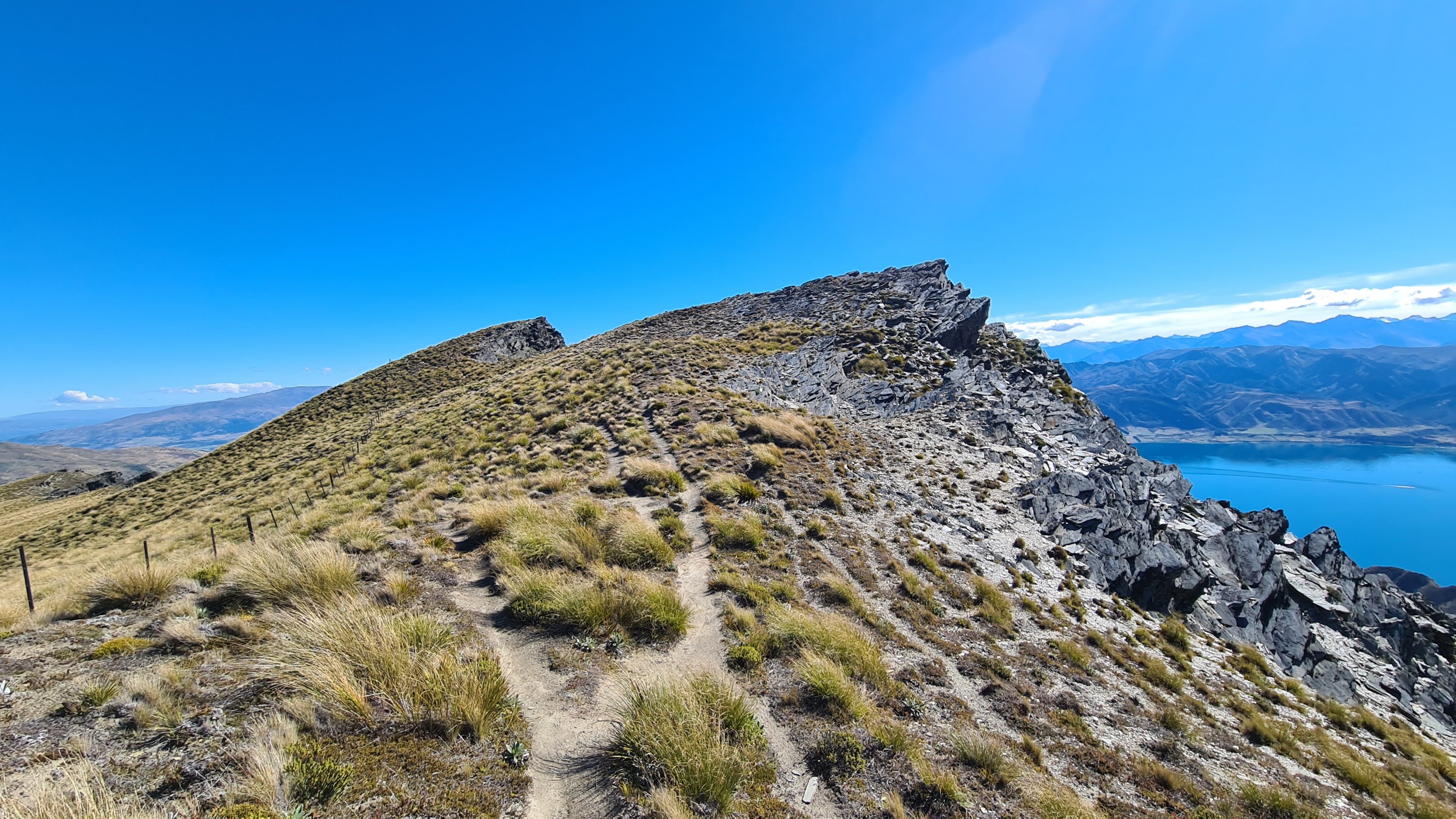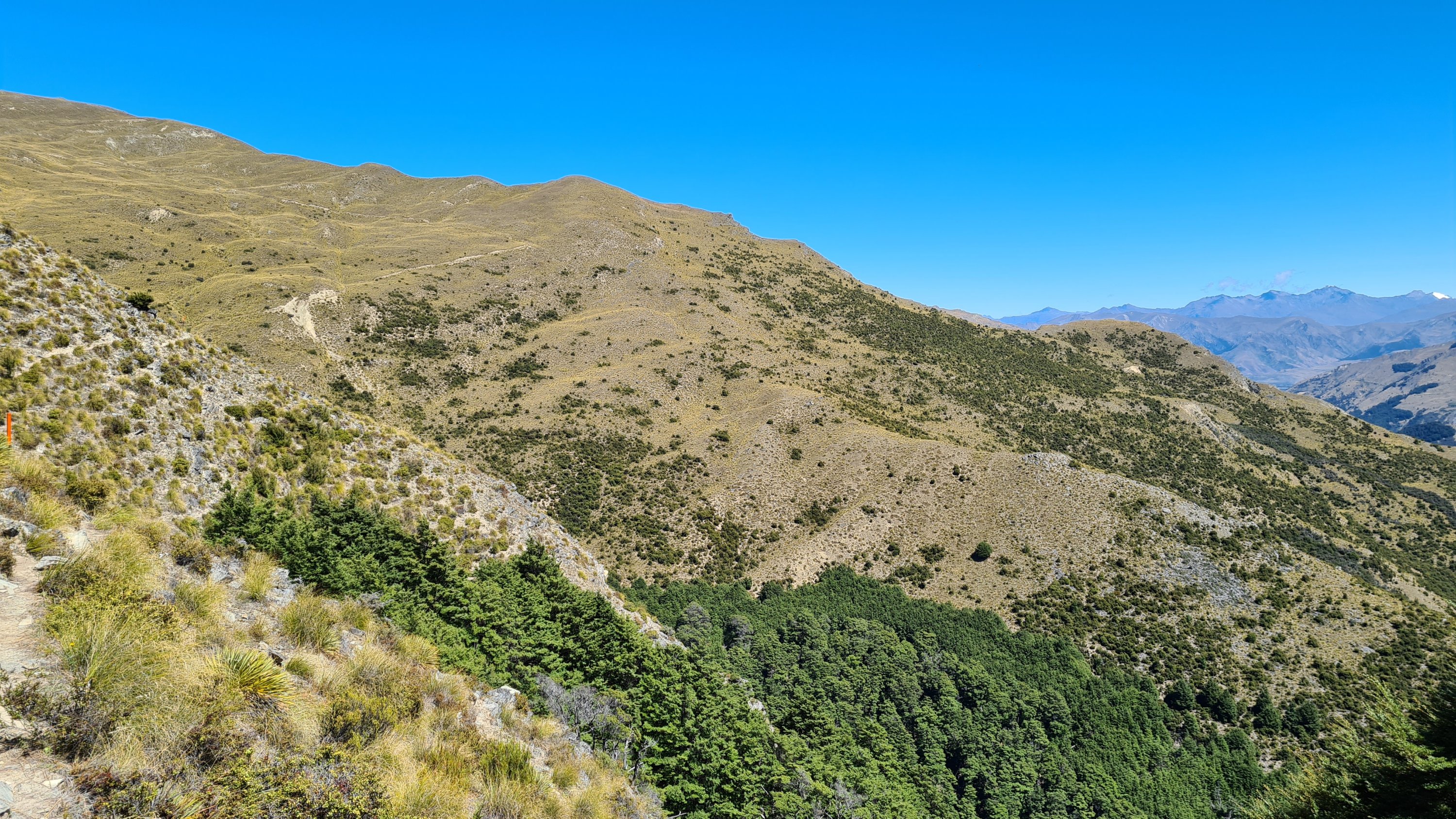 At 12pm we reached a track junction and headed up and away from the river. It was straight up for about an hour and was really tough and involved scrambling up some rock faces. Still in beech forest for the most part but then it openned up as we came out of the tree line and reached Stody’s hut. Another hut you couldn’t pay me to stay at. We had lunch there and then continued for another hour following a farm track all the way up to the ridge line. A total of 800m elevation up from the river. The track then continued along the top of the undulating ridgeline and into Hawea Station for another 8kms until one final push up to the top of Breast Hill which overlooks Lake Hawea. The view was stunning as you come up over the brow of the hill and it is a big drop off with the lake way down below. You can see the mountain ranges behind it, including Mt Aspiring and even lake Wanaka poking out around the corner. I have attached the video of the moment I got there.