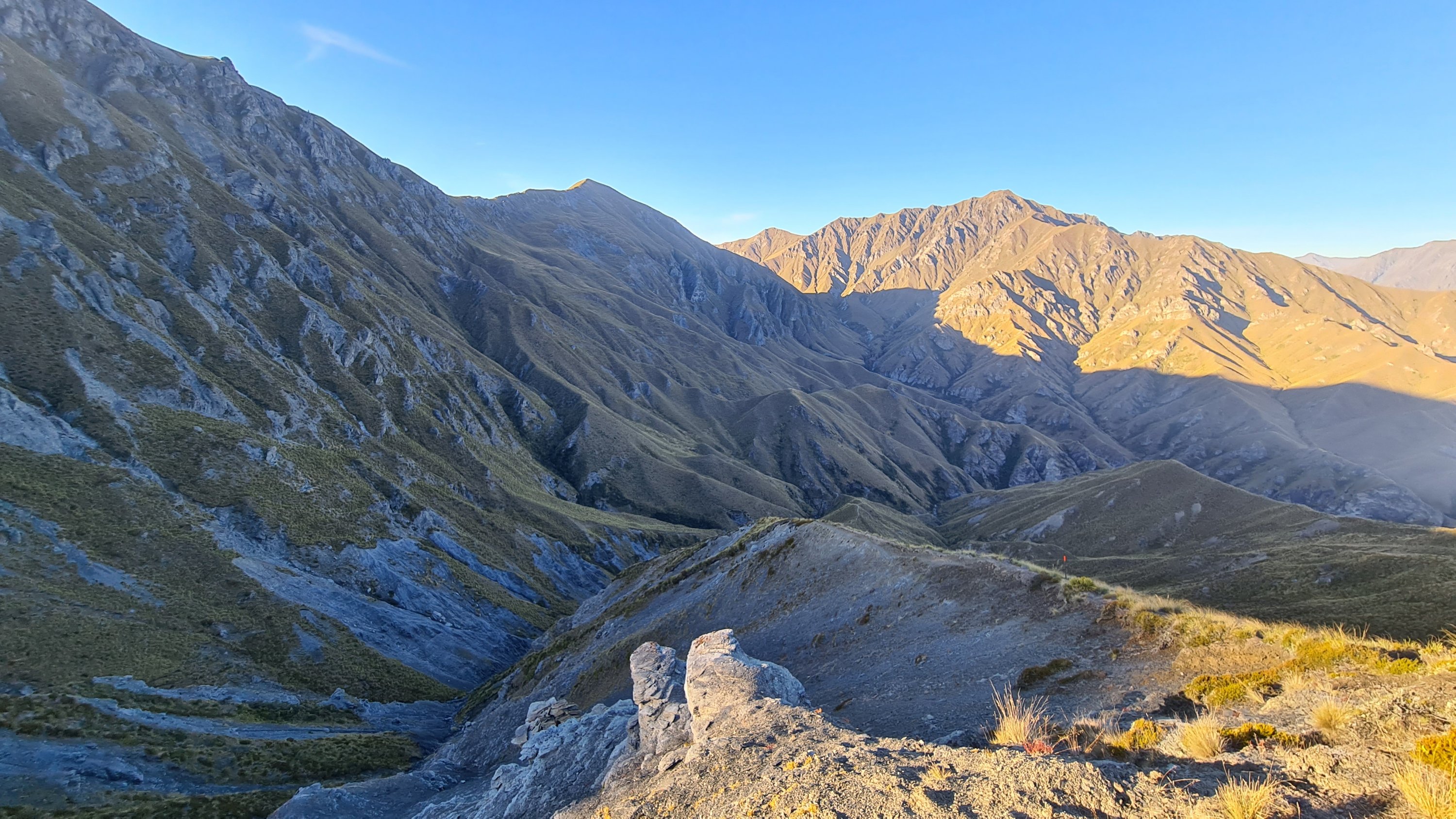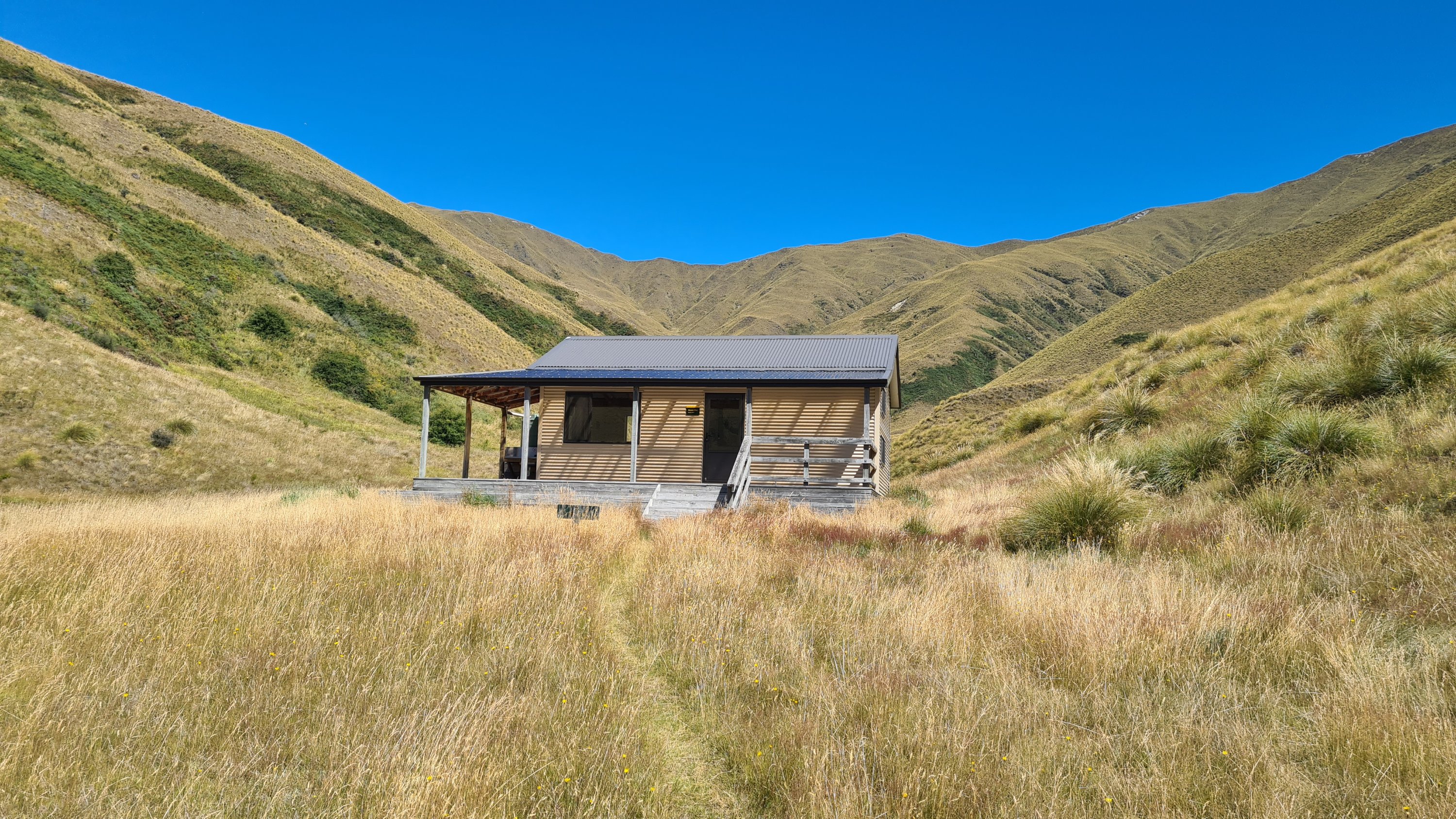 I had only been walking for five hours but it was challenging terrain and I was already starting to feel a bit tired. Another long climb immediately followed up towards a major ridge off Knuckle Peak. I took my time getting up there. I turned around to see views right the way back through the valley to Lake Wanaka and ahead down Golspie Burn in the valley below. I had some reception up there so sent a few messages and got a bit of admin done but did not hang around for too long as it was hot and I wanted to get to the hut and finish for the day. The final descent was hard on my knees and it felt like it took forever to get down into the valley floor and across to Roses Hut. It felt good to get out of the sun, get my boots off and have a wash and get a clean set of clothes on. Now I am just relaxing for the rest of the afternoon in the hut.
