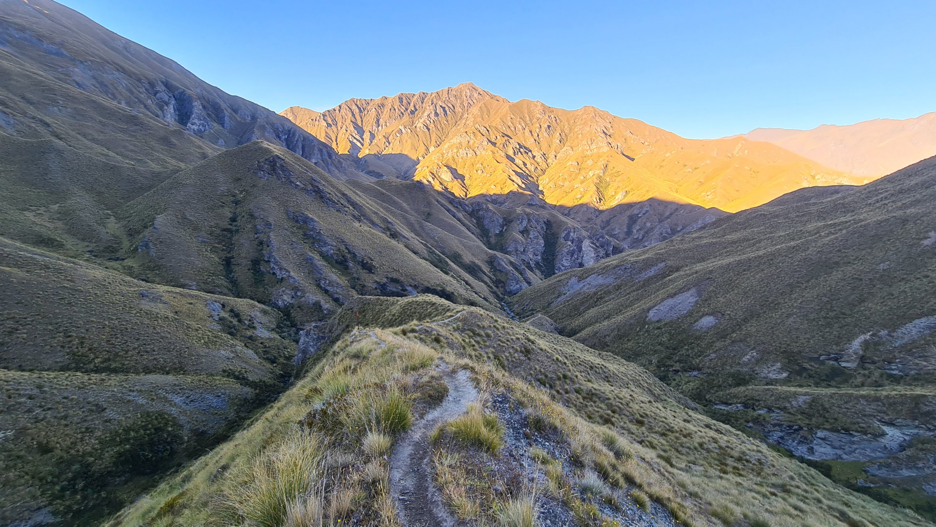 From the hut I followed the track further up the Fern Burn and up on to Jack Halls Saddle. That was the first of three big climbs today. My calves were a bit stiff from hitting that straight out of the hut. I descended down a ridge to a creek before arriving at Highland Creek Hut. I stopped there for a snack and refilled my water bottles. I could feel the heat from the sun turning up as it rose high enough to fill the deep valleys.