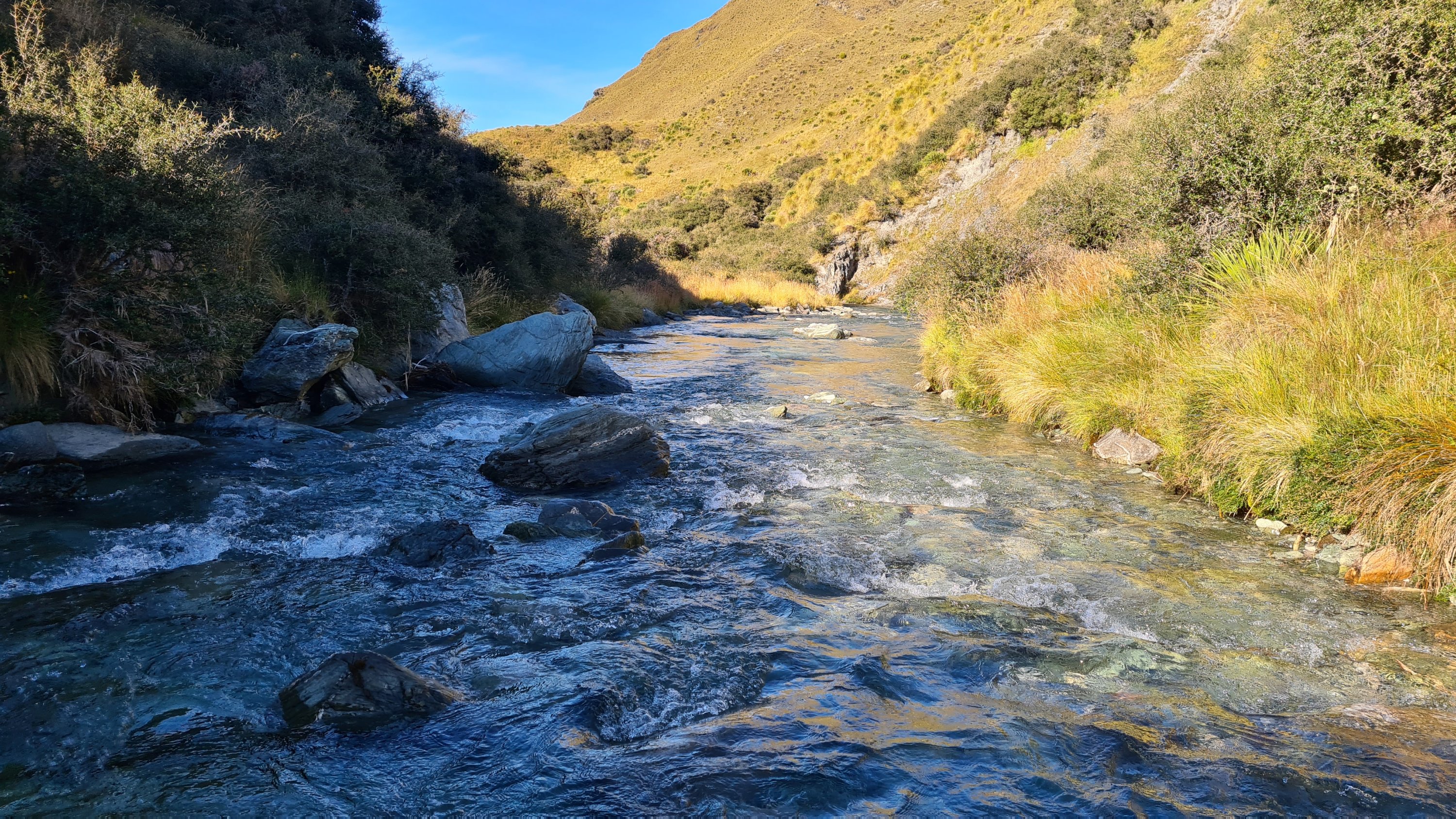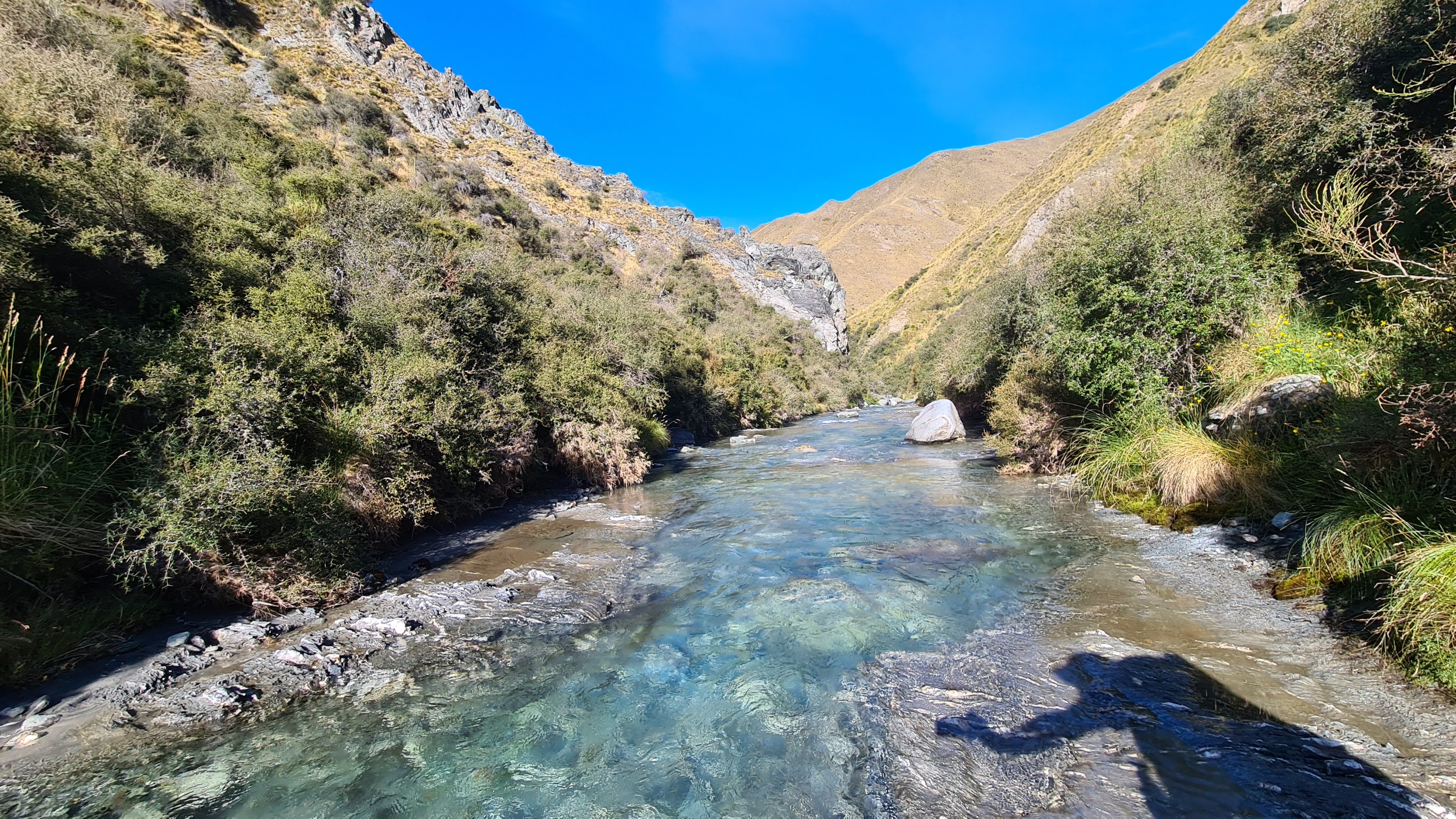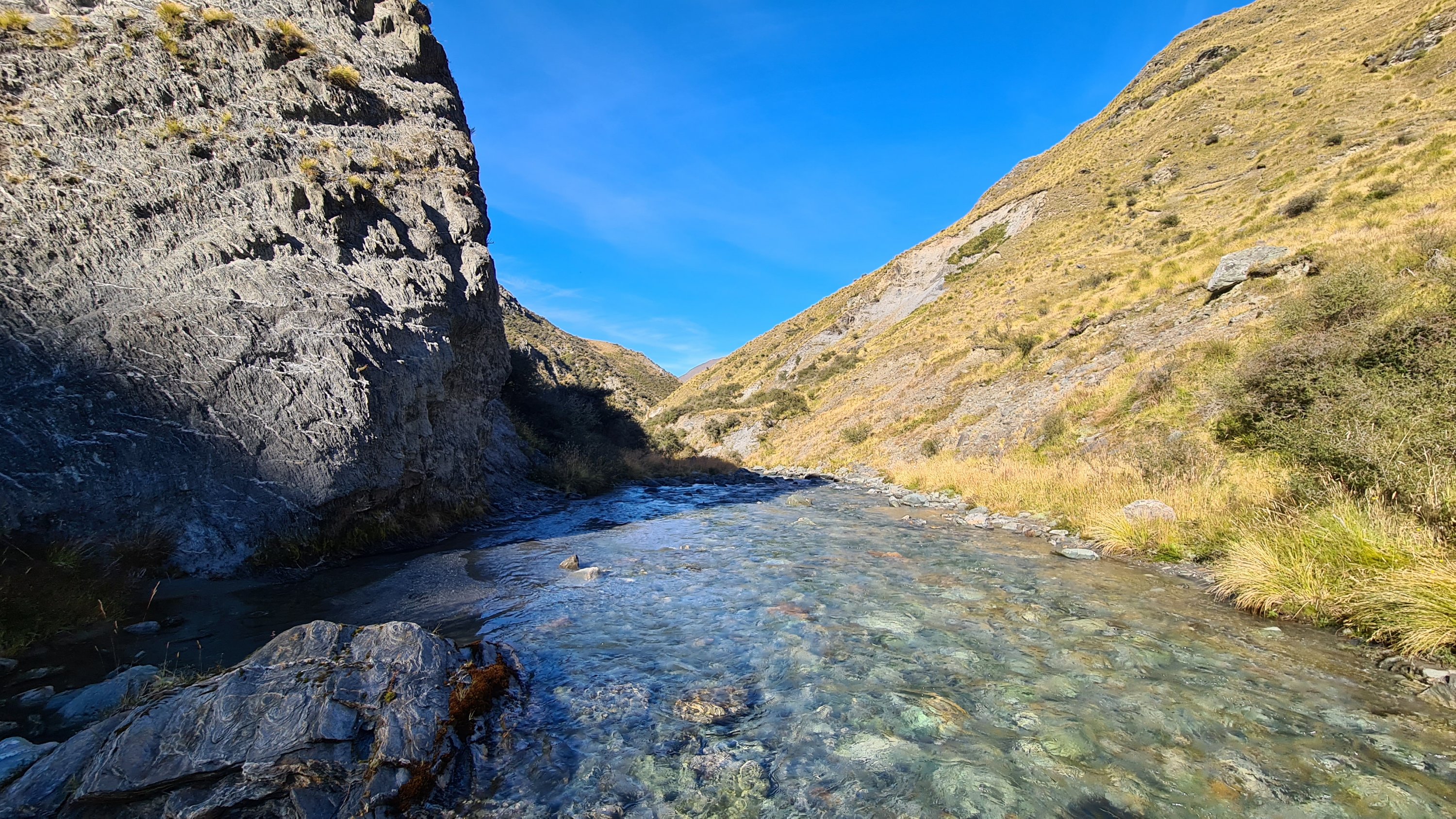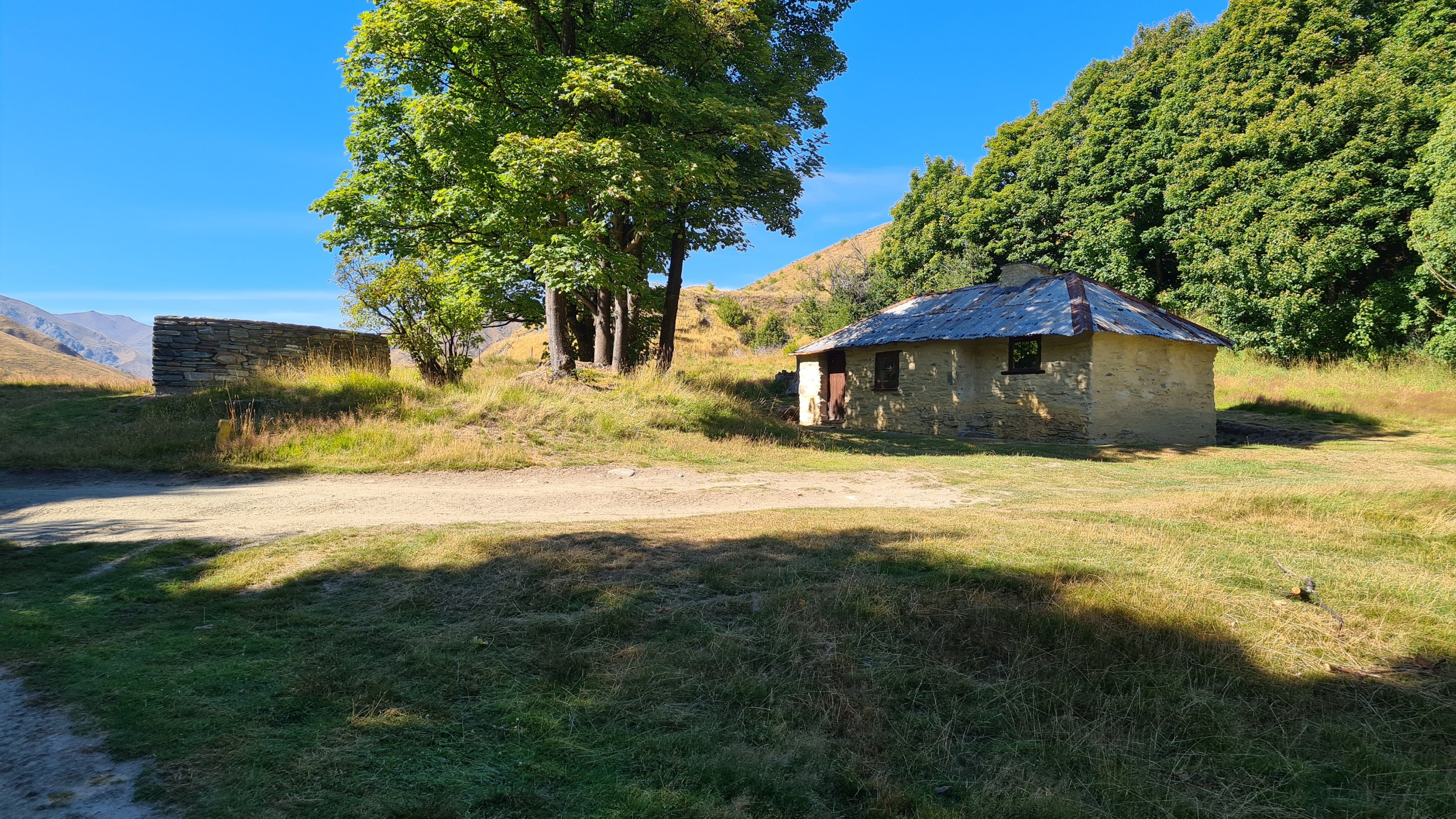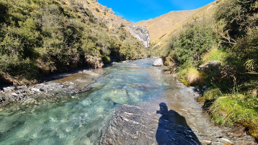 The first order of the day was to get up and over Roses saddle and down to Arrow River. It took me an hour or so to get there. You can choose to walk the flood track or down the river for 5kms to Macetown. I chose the river as it is running low and safe enough to do so and I love river walking. I also wondered if I might get lucky and find some gold in there! The alternative track is ugly and much harder as it siddles the river bank. Wading down the river was great. The water was so clear and the riverbed was glistening with quartz crystal all the way down. There were large rocks of solid quartz too, some with red or brown tones and other colorful rocks too, orange, green, blue and red. Its easy to understand the rich mining history of this area. I arrived in Macetown, an old gold and quartz mining ghost town from late 1800’s, and looked in one of the old stone buildings that had been restored. The rest of the town used to stand alongside it but there is nothing there now. There were a few information boards around that explained the history of the town and had some really cool stories about some of the locals and what it was like living back in those times. It is still only accessible by a 15km 4wd track or a tough climb over the ‘Big Hill’ track from Arrowtown. I followed the Big Hill track and sat at the top for a while for a rest. As I descended, Arrowtown and Queenstown came into view right below me. I was admiring the view looking across to the Remarkables when a Falcon had a go at swooping me. I moved on quick! They are beautiful birds though.