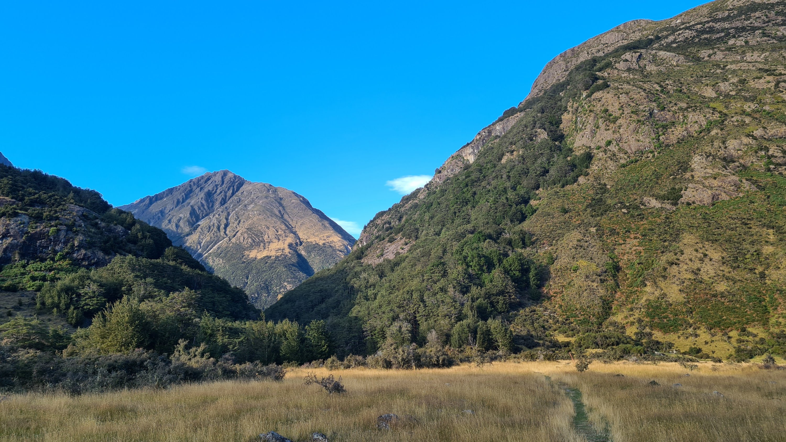 The track was really nice and well formed, through forest and running alongside the river. It is a popular track up to Greenstone hut. I crossed a large swing bridge right before the hut and stopped there for a snack. The landscape is beautiful through here, walking up the forested river valley with mountains all around. I saw a Stag only about 20 meters away. It must not have heard me coming and got a fright when I came around the corner and took off. It was quick so I didn’t get a good look at him but was a decent size with big antlers. I know there are plenty around in the South Island but I never see them.