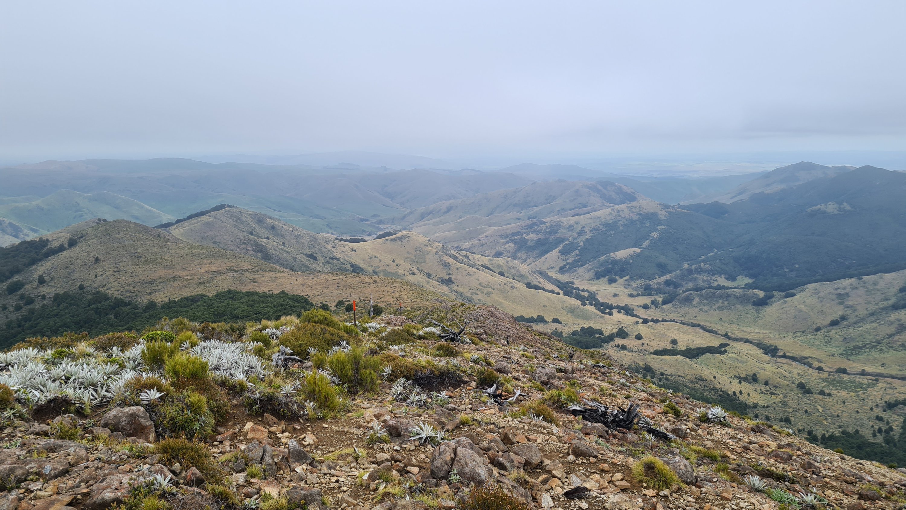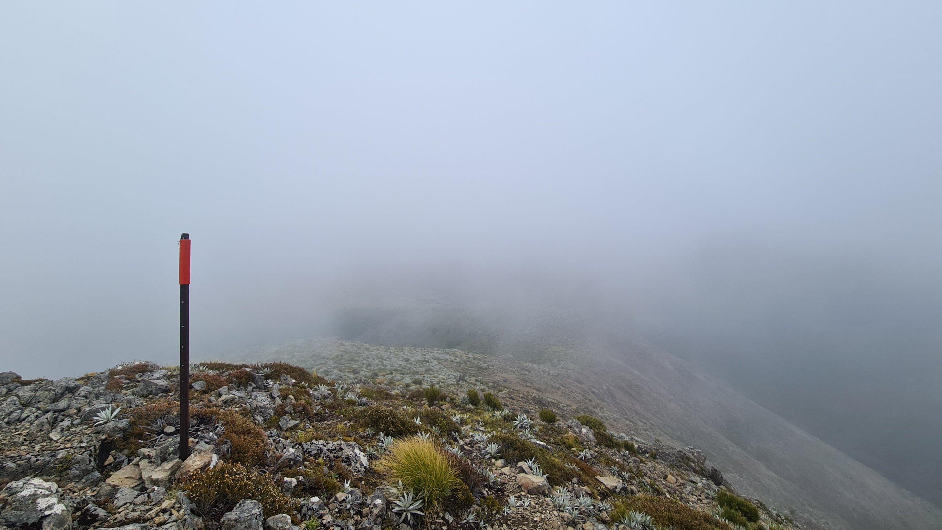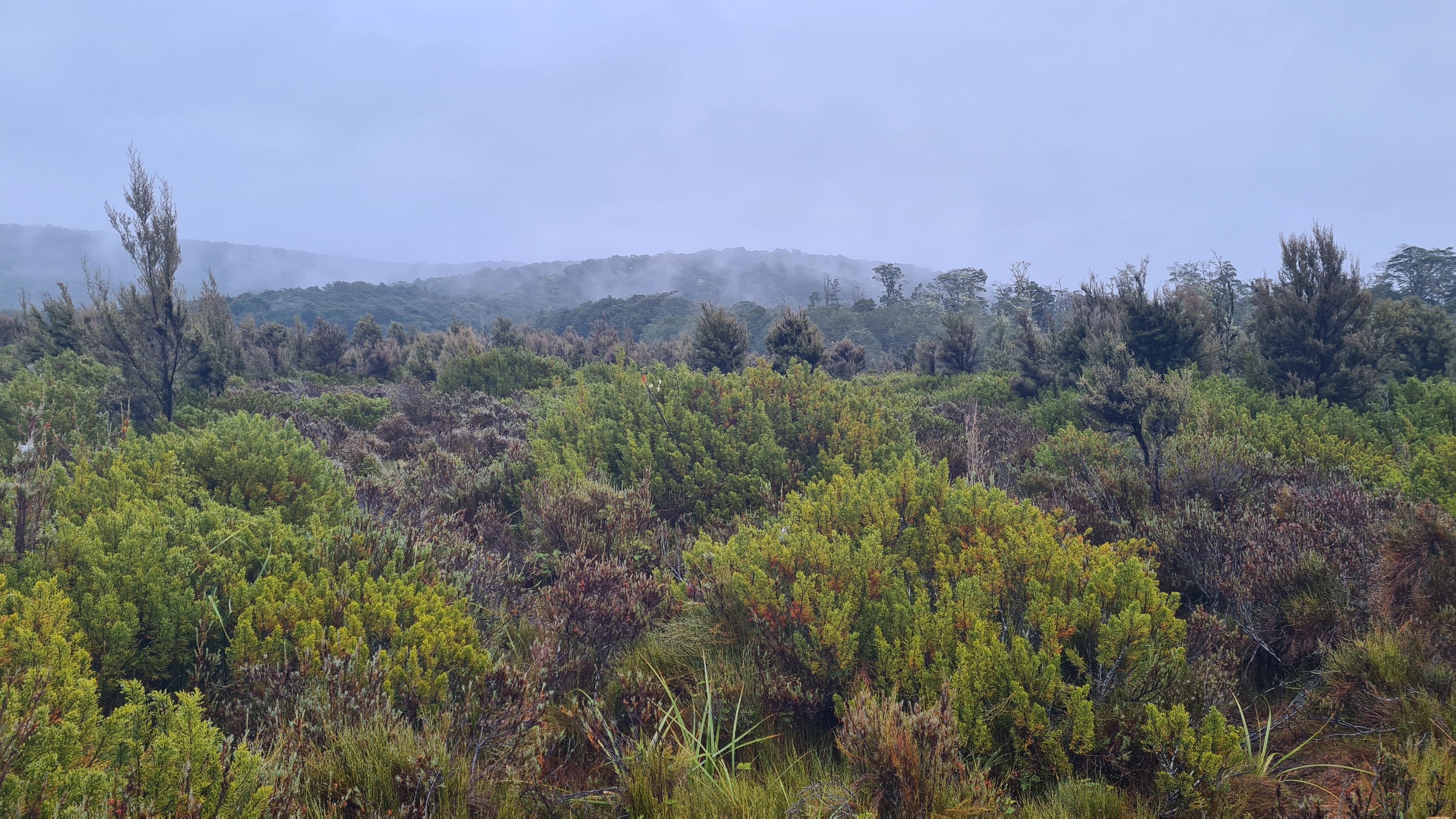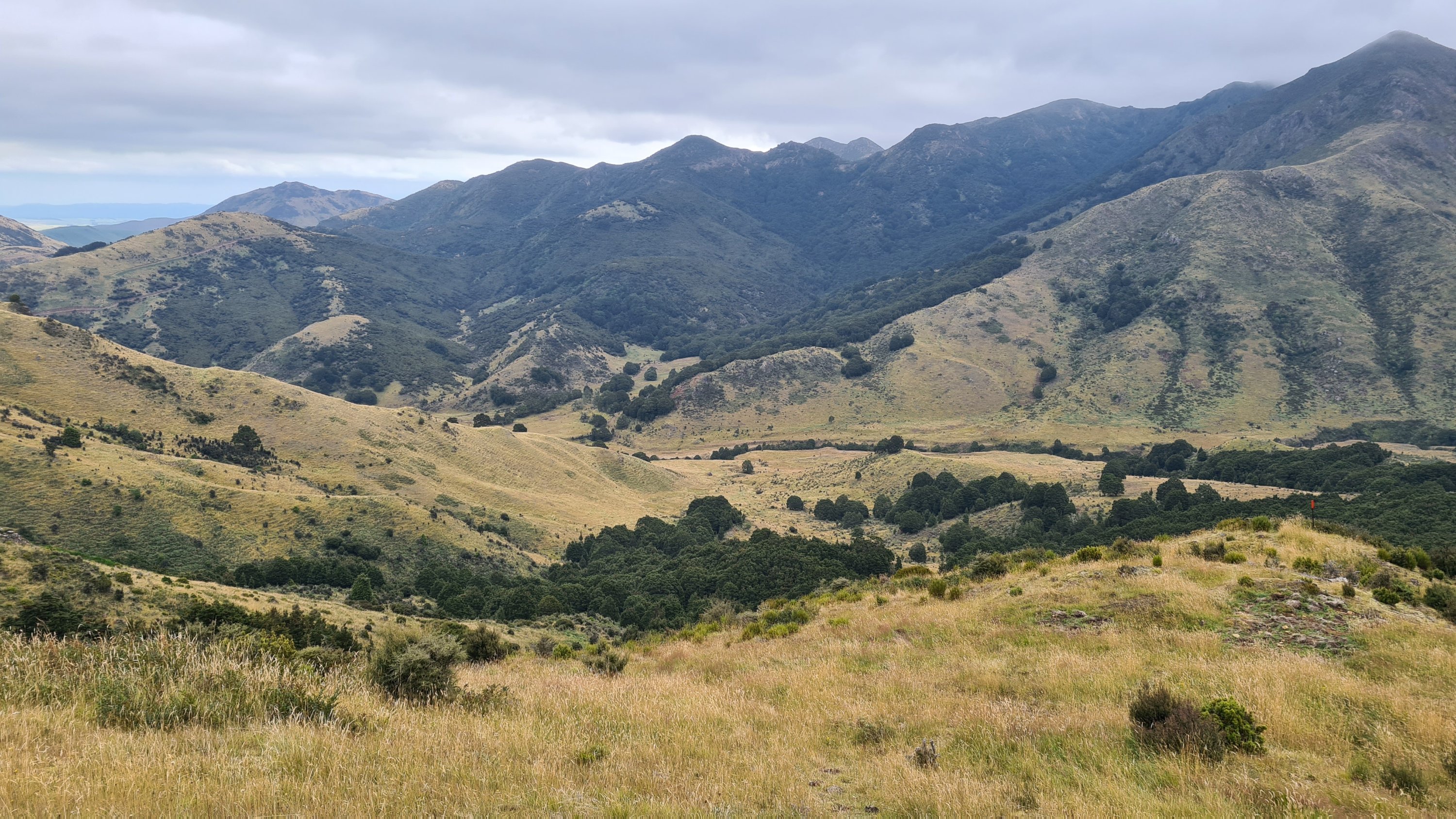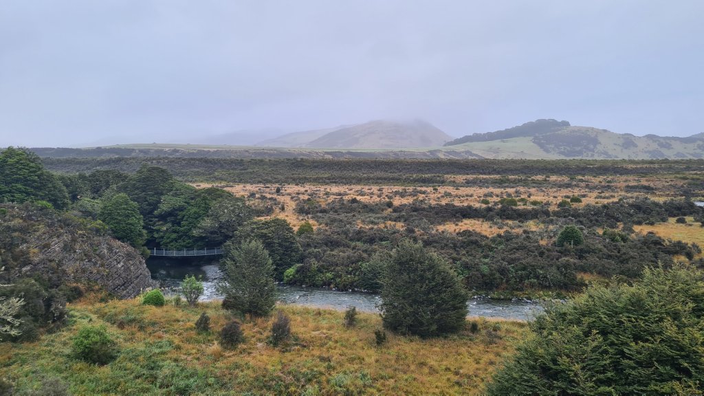 I crossed a swingbridge just past the hut and had a few kilometers of marshlands before entering the bush again for most of the day. I stopped at a hut along the way for lunch and then there was a steady climb that was steep in places up to the tops where it openned up. It was very overcast so I did not have a view at first but it started to clear up while I was descending off the ridge and down into the grasslands.